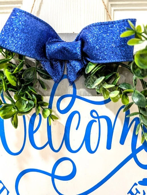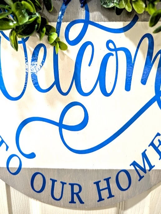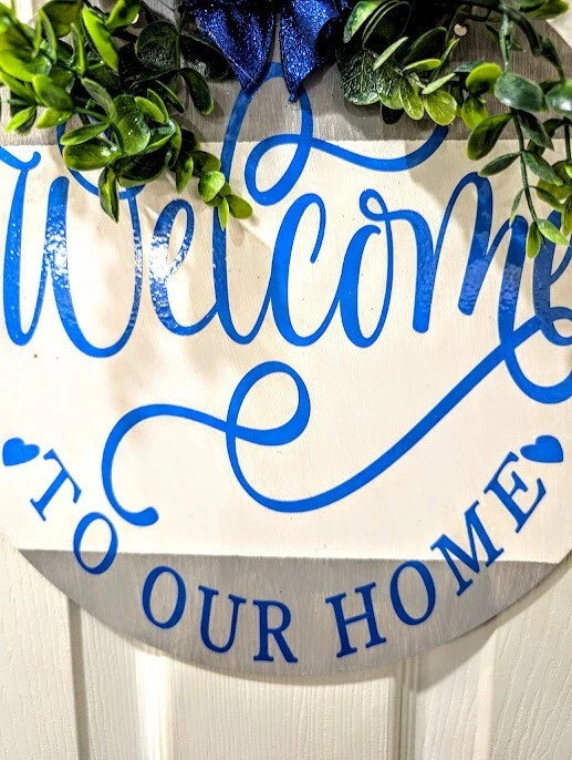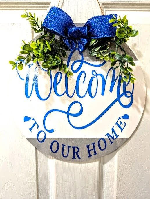 Item Height: 12 in Subject: Welcome to our home Item Width: 12 in Finish: Painted Mounting: Door Mounted, Hanging, Wall Mounted Shape: Round Material: Vinyl, Wood Handmade: Yes Country/Region of Manufacture: United States Brand: Handmade Theme: Family & Friends Color: Blue Care Instructions: Easy Care Room: Any Room, Indoor/Outdoor, Porch Features: Decorative, Hanging Type: Porch Sign Size: Small Style: Farmhouse