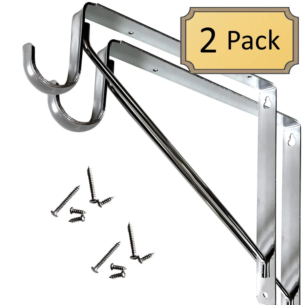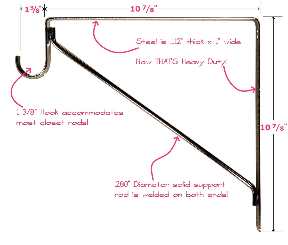 The strongest closet bracket you will ever find... and yet, so easy to install! Real Steel The moment you hold it in your hand, you'll know what we're talking about. The parts of the bracket that lies against the wall and supports the shelf each measure 1" wide and is a robust 1/8" thick. They are connected and strengthened by a diagonal metal rod that's 1/4" diameter that is WELDED in place! Here's another great feature, the steel at the hook is pressed into a strength enhancing profile, that adds a touch of refinement to the bracket at the same time. Nice! EZ Installation The top hole in the bracket is a "keyhole". So just install of the provided screws a bit proud of the sheetrock and hang the bracket in place. Then, lock everything in with a screw at the bottom of the bracket. Add your shelf and attach it from below with 2 screws. We even provide a hole in the back of the hook in case you're using a wood dowel, so you can secure that as well! GREAT FINISH A beautiful polished chrome finiish will surely set your closet apart from all the rest. Even the provided screws are in a matching finish! Here's What You Get heavy duty chrome closet brackets with welded diagonal support Four chrome panhead #10 x 1 5/8" screws for wall attachment. Six chrome #6 x 5/8" panhead screws for shelf and closet pole attachment. SUPER STRONG - All components are of thick metal, with all connections being welded. You really won't find a more robust closet bracket anywhere! SUPERIOR FINISH - Has a very sleek polished chrome finish. Sweet! MATCHING SCREWS - Comes with 2 panhead screws for wall attachment (#10 x 1 5/8"), as well as 3 panhead screws for shelf/wood pole attachment (#6 x 5/8") EZ INSTALLATION - Since the top hole is "keyhole" in nature, just put in the top screw until it's about 1/8" proud of the wall and "hang" the bracket on it. Then lock everything in place with the lower attachment screw! YOU GET - 2 Chrome closet brackets with matching screws