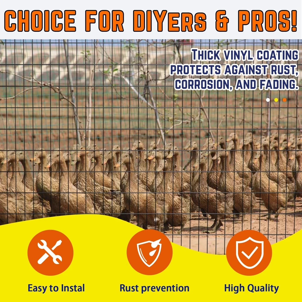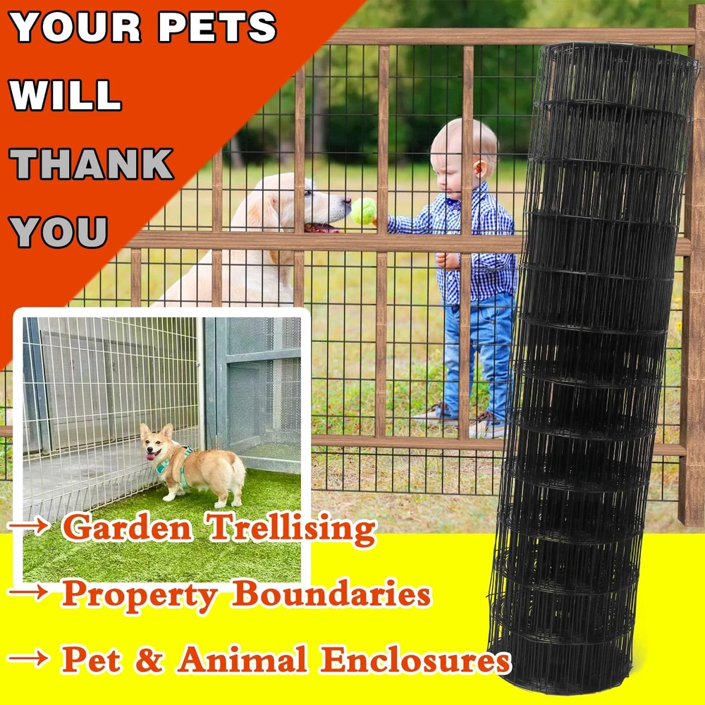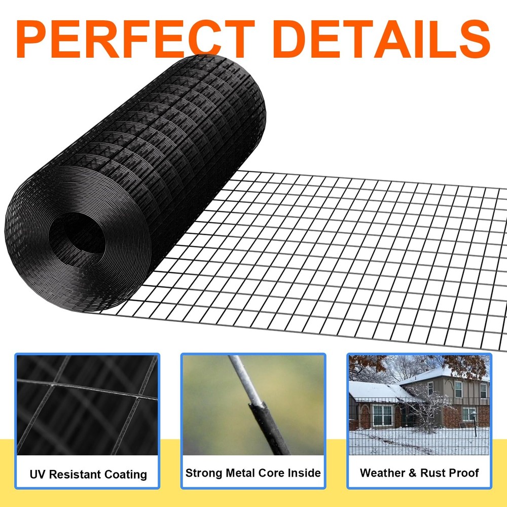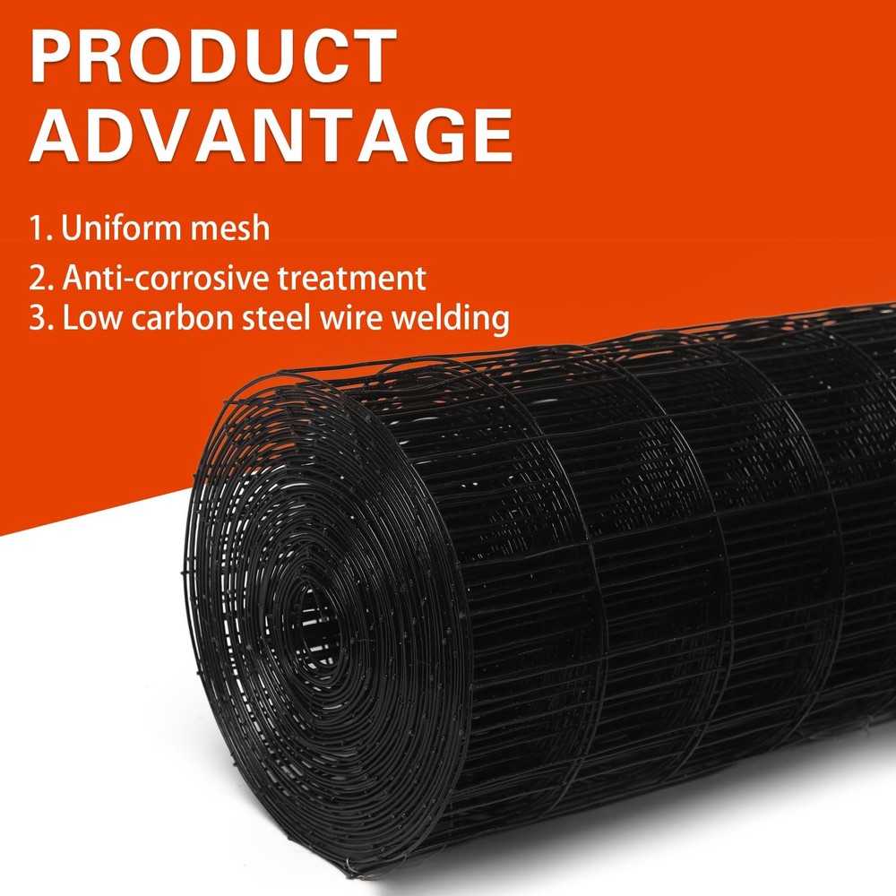 Durable Outdoor Build – Our welded wire fence uses premium galvanized steel (16GA) with black vinyl coating, forming a rustproof pvc coated wire mesh. This smooth black fencing resists rain/sun, won’t harm pets/plants, and cuts replacement needs. Versatile Sizing & Mesh – This wire fence roll (popular welded wire fence 48inx50ft ) has 2”x3” mesh. Ideal as chicken wire fencing, dog fence wire, or garden fencing (blocks small animals). The flexible wire mesh roll cuts easily for custom use. Easy Tool-Free Install – Lightweight metal fencing unrolls fast, works with T-posts/wooden stakes . Saves time vs. bulky chain link fence or weak hardware cloth—great for chicken fence or temporary fence setups. Multi-Scene Utility – More than outdoor fence! Use as pet fence (rabbits/cats), livestock fencing, yard fencing, or decorative garden fence. This vinyl coated chicken wire fencing also works underground (gopher mesh) or for tree protection. Reliable Quality & Support – Our galvanized welded wire fence is made to meet basic outdoor use needs, with consistent craftsmanship for daily protection. If you have questions about the black wire fencing or need help with fit, feel free to contact us.