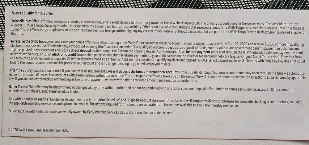 400 WELLS FARGO Bank Checking Account Cash Bonus Promo Offer Coupon-Expires 4/21/2026 Wells Fargo promotional $400 bonus offer coupon. Open a new, eligible checking account with bonus code and deposit $3,000 or more in qualifying direct deposits within the first 90 days of opening. Restrictions apply; please read the information in the photos for full terms and conditions. Coupon expires 4/21/2026 (April 21, 2026). Offer code will be sent via eBay Message as soon as possible after payment is received. The actual, original paper voucher will be mailed to you in a plain business envelope via USPS First Class in the Mail with stamp. No refunds or returns. USA buyers, only.