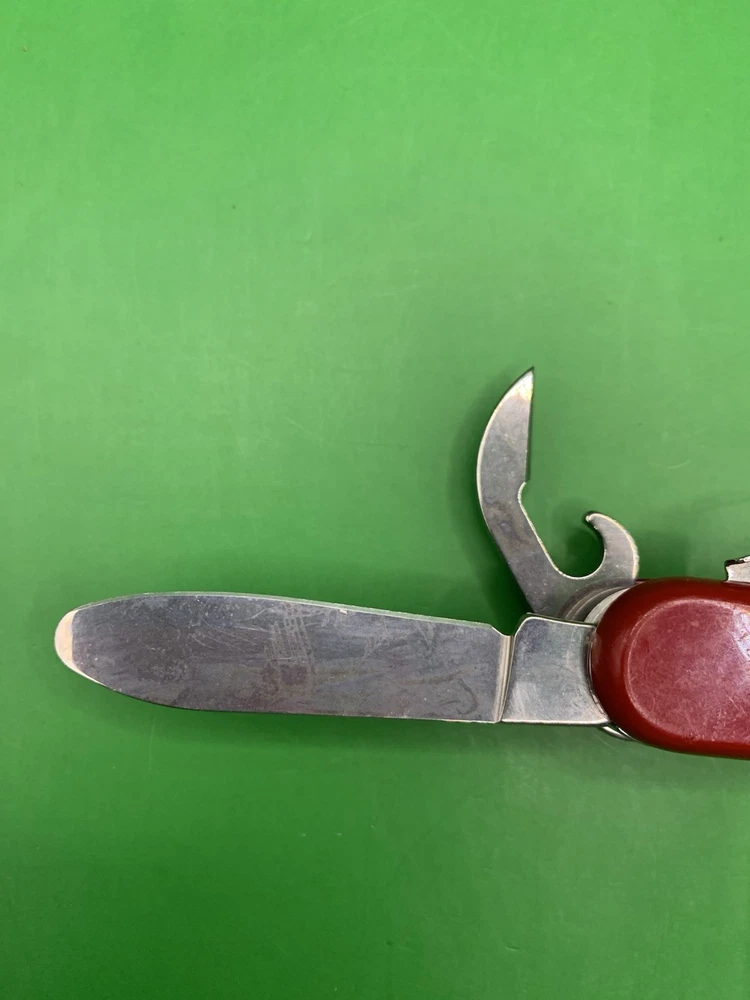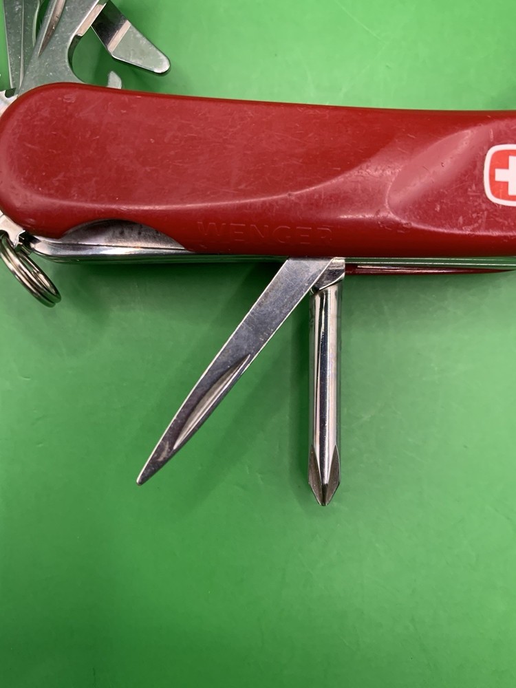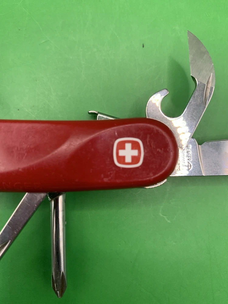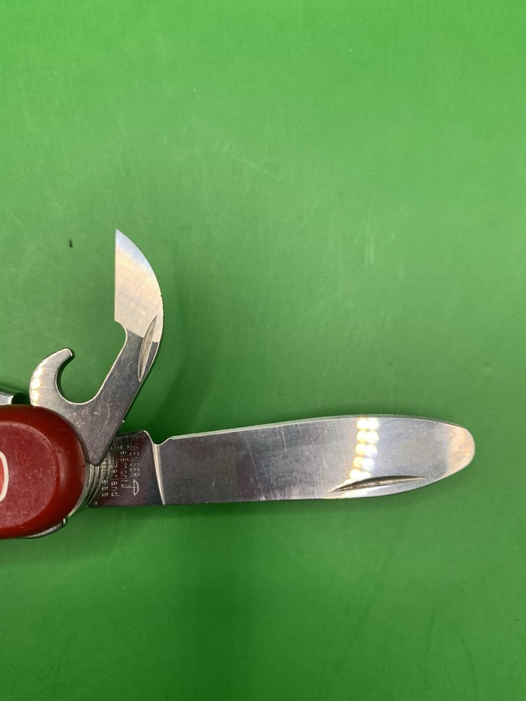 Used Wenger knife. Scales have some wear and the blades may need to be sharpened. The main blade doesn’t open smooth. There is something wrong with the locking system that makes it hard to retract and close the main blade. The main blade does lock into place when opened. All other tools open fine. See pictures for overall cosmetic condition. By purchasing you affirm that you are of legal age and aware of all applicable laws.