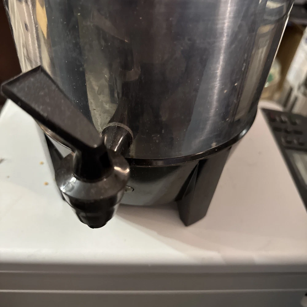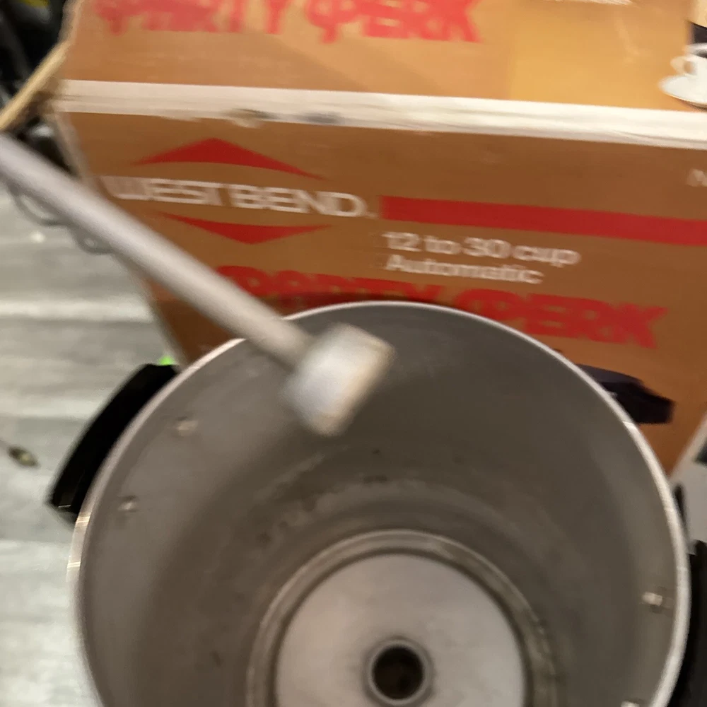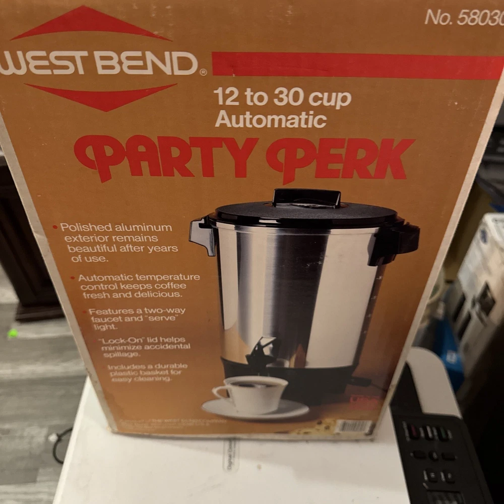 The West Bend #58030 Party Perk Automatic Coffee Maker is a vintage percolator that can brew 12 to 30 cups of coffee. It has a silver aluminum construction with features like a removable filter basket, two-way faucet, and locking lid. This coffee maker is designed for ground coffee and operates on electricity, with a shiny finish and a classic design.