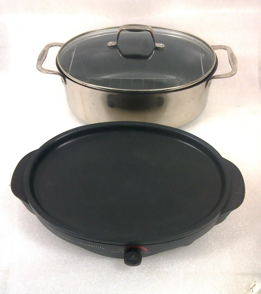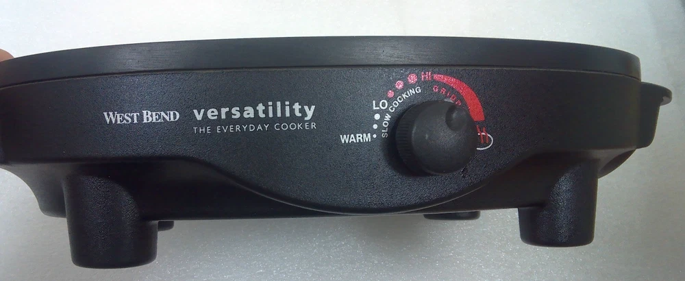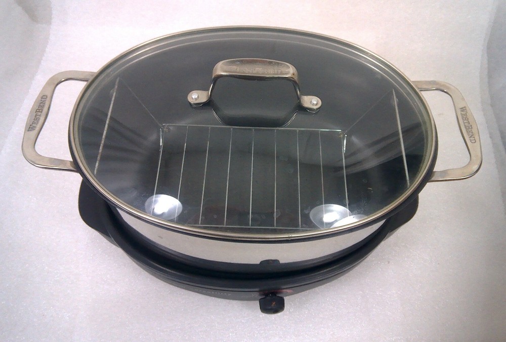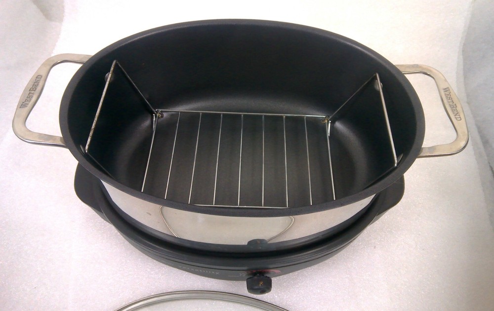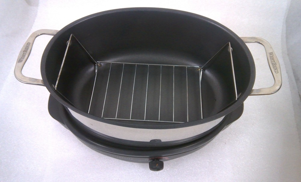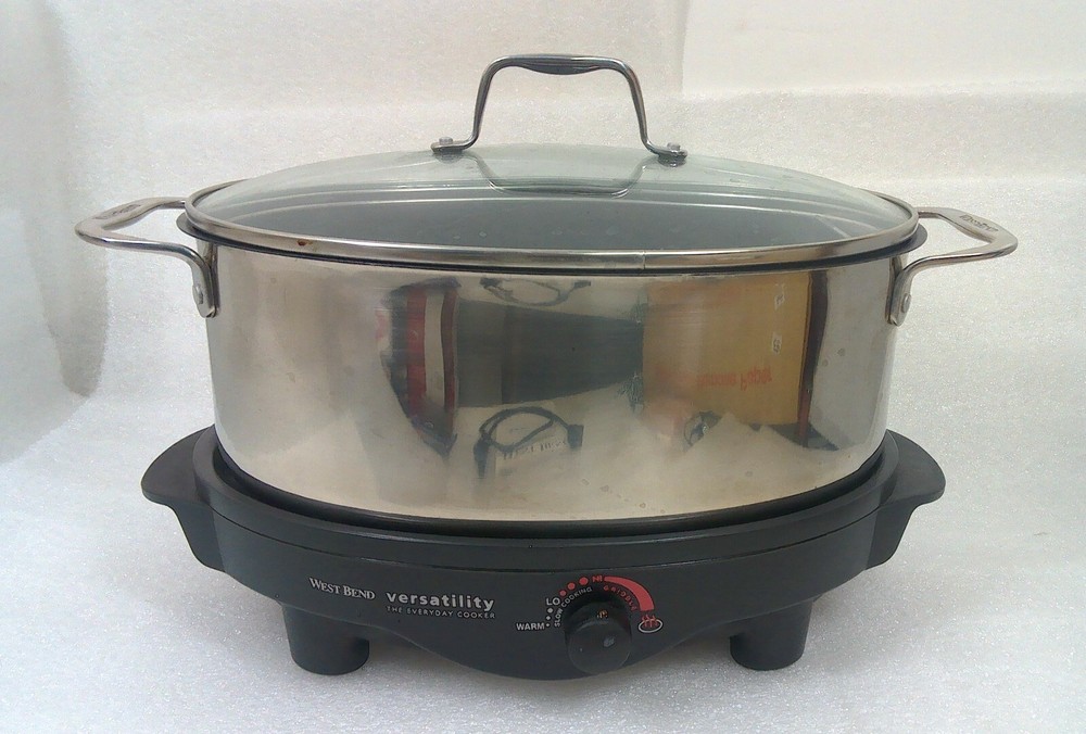 West Bend 84866 6-Quart Versatility Slow Cooker with Glass Cover, Stainless Steel Body The vessel can be set in the freezer and is dishwasher safe. The reason this item is called Versatility, The Everyday Slow Cooker is due to the ways it can be used. With the highly polished stainless steel cooking vessel on the base - it's a slow cooker. The vessel can also be used in the oven or on top of the stove, when browning a roast to slow cook is desired. The base doubles as a mini grill, perfect for grilling a burger, a couple of eggs, toasted cheese sandwiches or anything else that fits. Highly polished stainless steel cooking vessel Heavy-duty polished stainless steel handles with riveted construction Cooking pot goes from heating/serving base to stovetop, oven, refrigerator, freezer or dishwasher 6-quart oval shape holds a whole chicken, ham or roast Adjustable temperature control with Griddle Setting Keep Warm setting for serving Low, Medium and High settings for roasting or slow cooking Premium non-stick interior Glass cover for easy viewing Lift-out roasting rack included Dishwasher-safe cooking pot, cover and rack Heat-resistant base Capacity 6 Qt. Color Stainless Steel Power 275 W Non Stick Yes Dishwasher Safe Yes