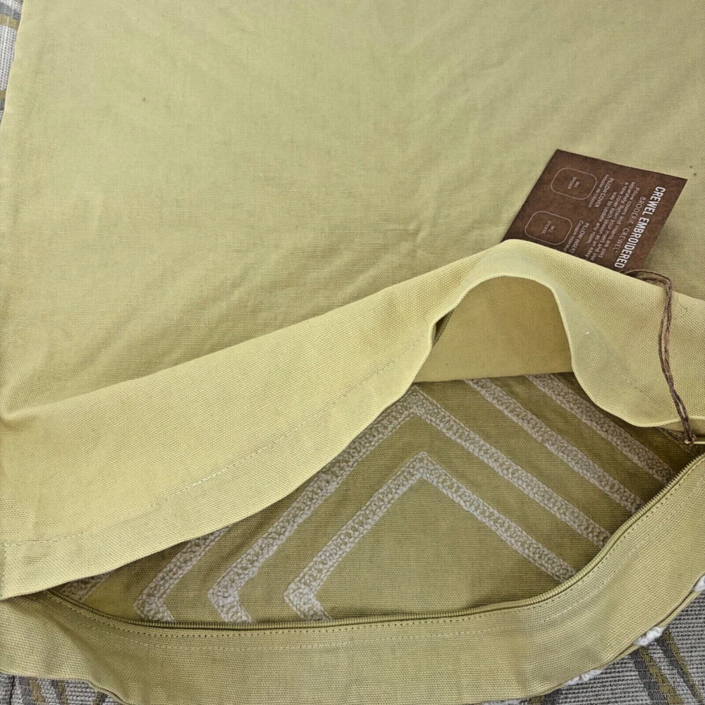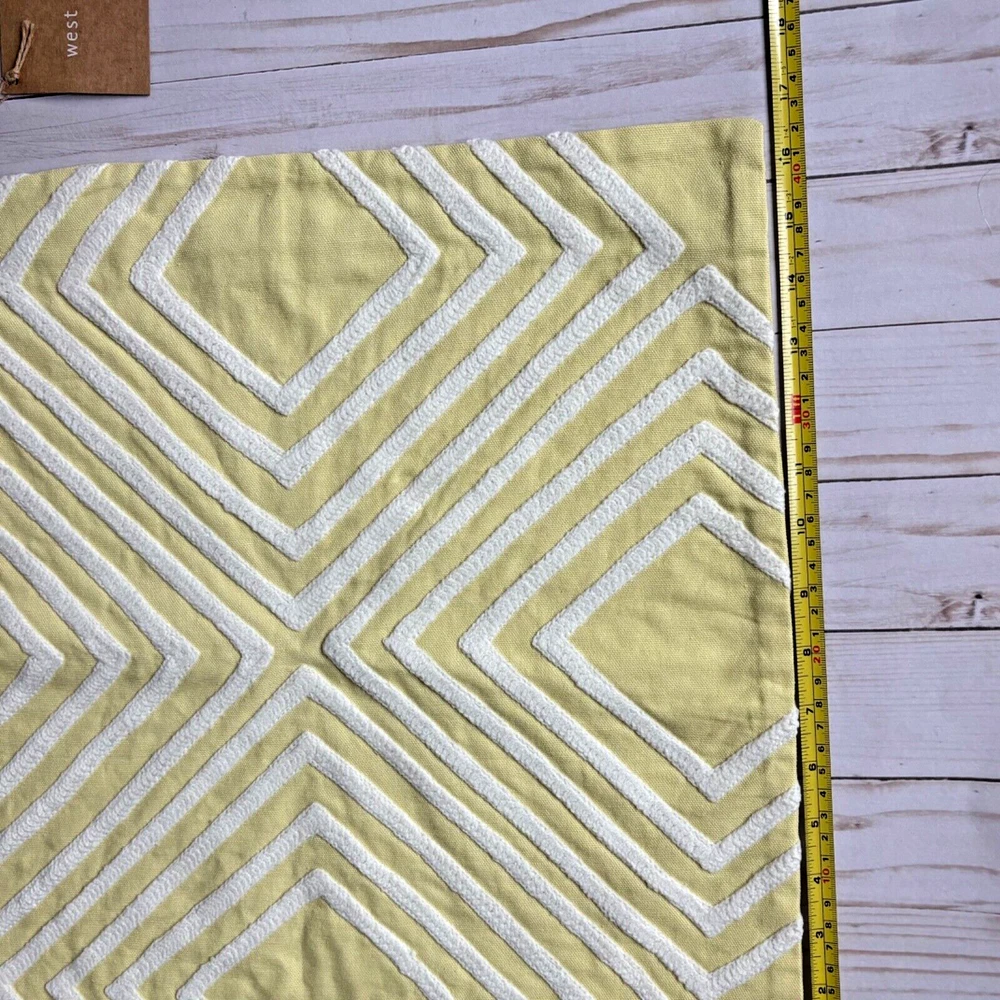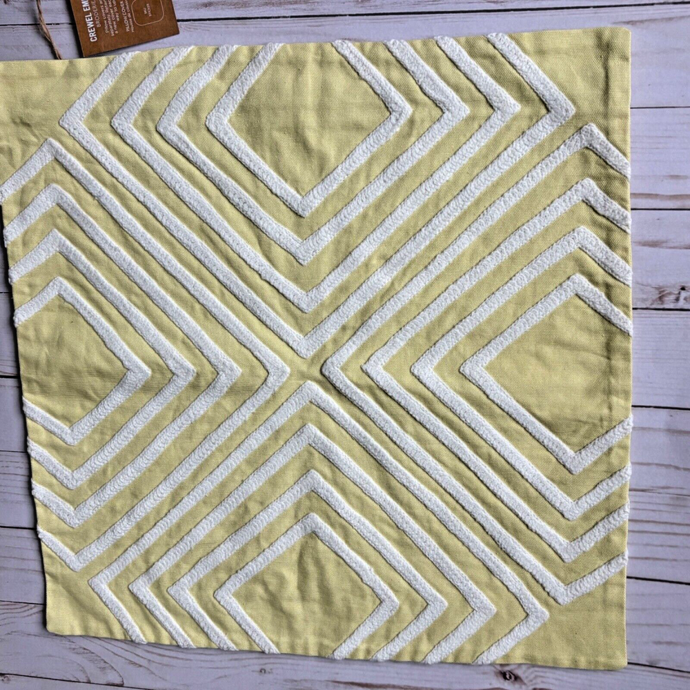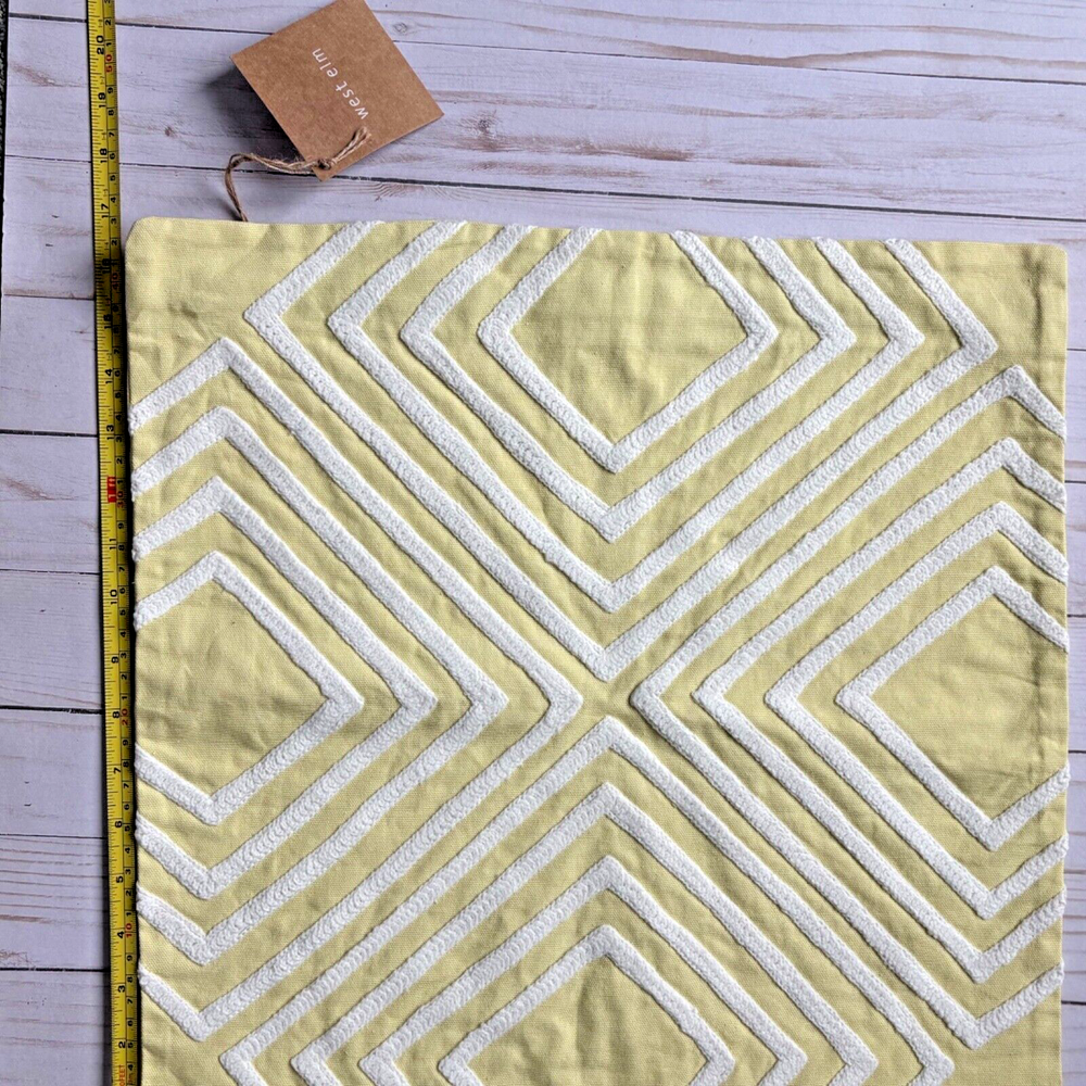This West Elm pillow cover features a geometric pattern in yellow and white. It is square in shape, measuring 17"x17", made of 100% cotton material, and embroidered with a boho style. The design is a crewel embroidery in a broderie theme, adding a unique touch to any home decor.