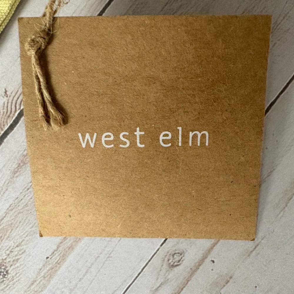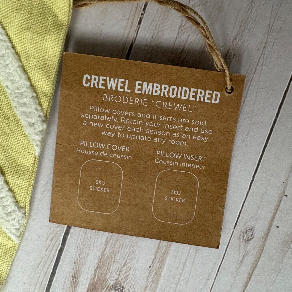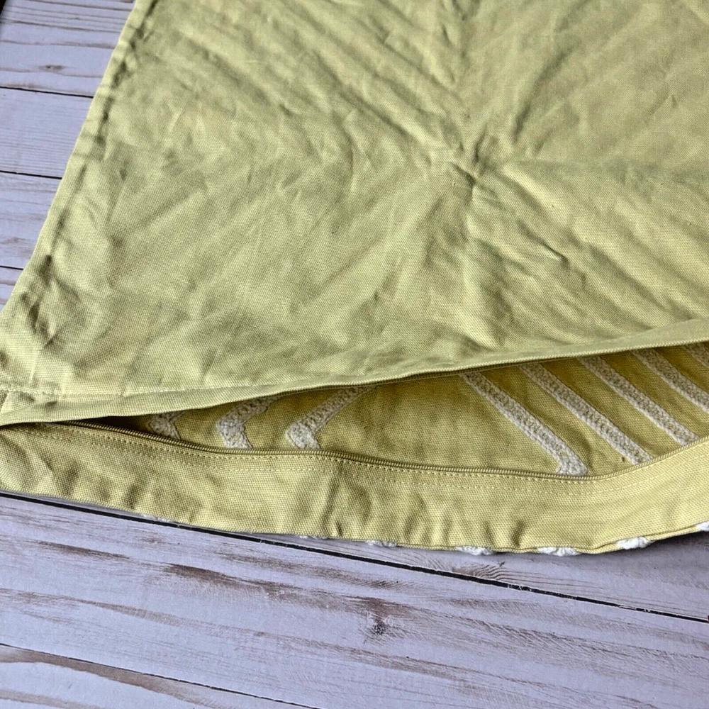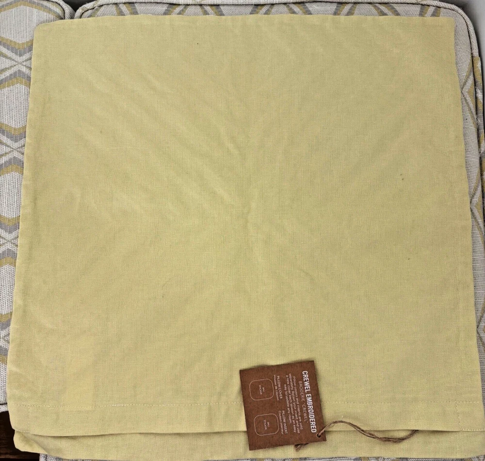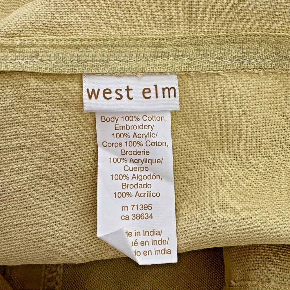 This West Elm pillow cover features a geometric pattern in yellow and white. It is square in shape, measuring 17"x17", made of 100% cotton material, and embroidered with a boho style. The design is a crewel embroidery in a broderie theme, adding a unique touch to any home decor.