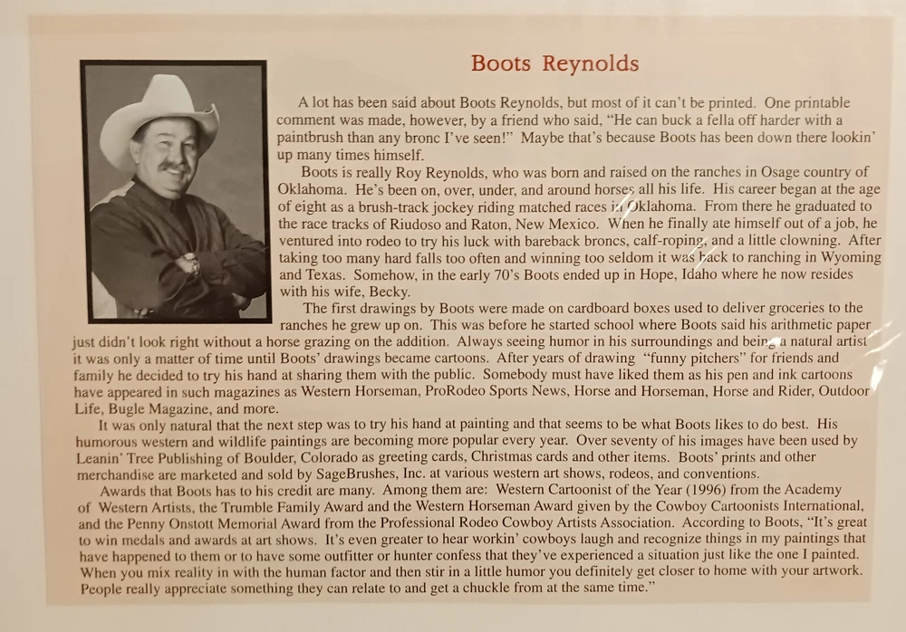 This Art Work Is From The Estate Of Hugh LaBere One Of The First Showroom Owners At The Denver Merchandise Mart . This Boots Roy Reynolds Open Edition Print A Good Horse Is Hard To Find. Boots Was Just One Of The Many Lines My Step Dad Represented He Knew Many Of The Artists Personally And These Are From His Personal Collection That He Wanted To Open An Art Gallery With . My Stepdad Hugh Earned The Title" The Living Legend" You Are Much Missed! COWBOY UP, Love Your Daughter Sheila. Thank You For Looking ! Or Buying ! H 8" X W 10" Still Sealed In Original Plastic***** His Bio Is On The Back Of Each Picture