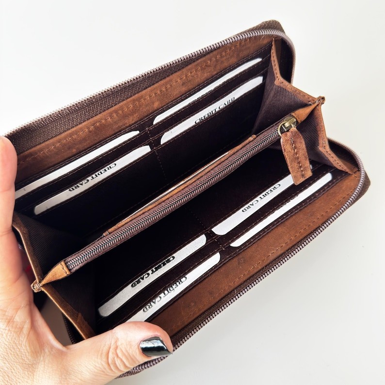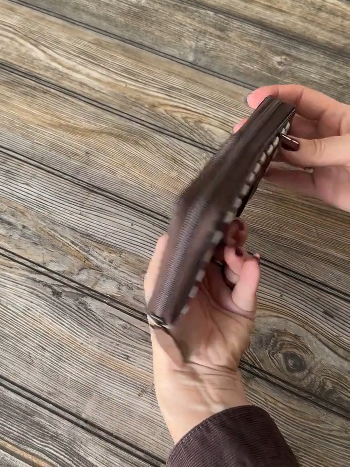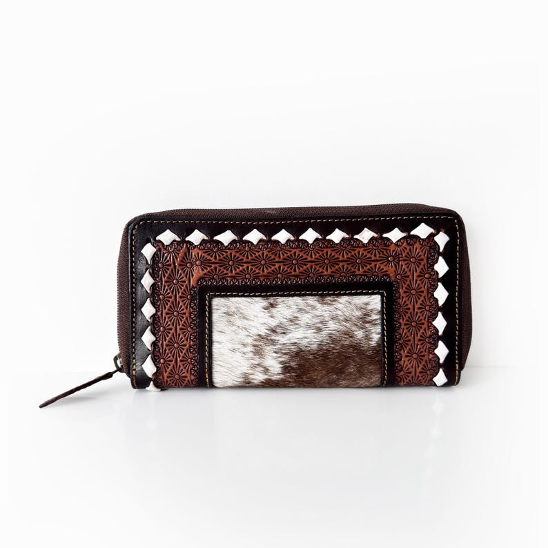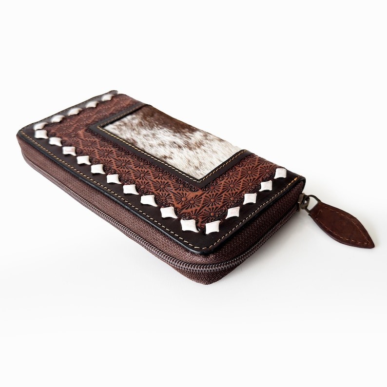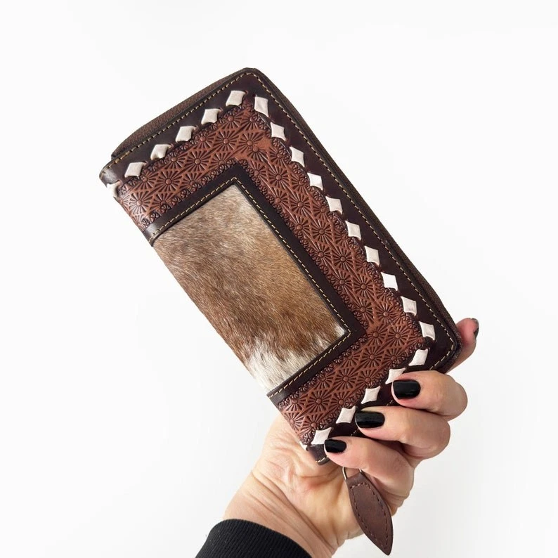 Description Keep your essentials secure and stylish with this hand-tooled leather wallet featuring a genuine cowhide front panel . Designed with bohemian flair and practical organization, this wallet combines rustic western charm with everyday functionality. Specifications: Dimensions: 8" L x 4.5" H Material: Premium hand-tooled leather with authentic cowhide Design: Unique boho-inspired pattern with natural cowhide variations Closure: Durable zip-around for security Interior: Card slots, zippered coin pocket, and divided bill compartments Key Features: ✔️ Genuine cowhide each piece is one-of-a-kind ✔️ Hand-tooled bohemian design adds artisanal flair ✔️ Secure zip-around keeps your items safe ✔️ Functional interior with card, coin, and bill organization ✔️ Rustic yet refined, ideal for daily use or gifting Why You’ll Love It: A perfect mix of western and boho style, Durable and practical with plenty of storage Makes a thoughtful gift for her unique and handcrafted Upgrade your accessories with this Western boho cowhide leather zip wallet, stylish, functional, and built to last. Condition: New