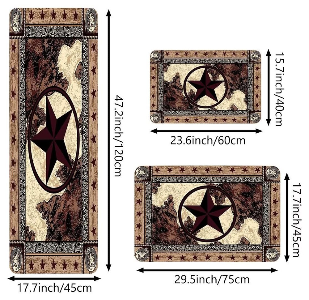 We strive to bring you high-quality home decor, uniquely designed products, and satisfying service experience. We sincerely hope that our products can accompany you at home and will bring you enjoyment and happiness. Care instruction: 1) Hand wash or machine wash cold in mild programme. 2) Line dry or lay flat to dry. If you have any questions or problems, please feel free to email us, we will respond within 24 hours to ensure your shopping experience. 【Rustic Kitchen Rugs and Runner Set of 3】Texas star long kitchen rug size 17.7" x 47.2",chef sink mat size 15.7"x23.6" and small kitchen mat 17.5" x 29.5". Vintage kitchen Mats for Floor 3 pcs is lightweight and could be continually using for long time.This western rugs runners provides comfortable support to ensure that you are able to stand comfortably for the kitchen sink,bath room,bedroom,living room. 【Soft Comfort Standing Mat】Western Texas Star kitchen rug sets 3 piece with runner is made of the durable microfiber fabric material, backed with a rubber non slip backing.Non-skid, super soft, washable and absorbent kitchen mats door mat is a must for your kitchen, and an indispensable choice for your kitchen mat for floor. Western decor kitchen rug high quality fabric,delicate printing process, personalized bath runner rug style. 【Texas Star Decor Western Rug】The brightly patterned texas star rug doormats adopts digital printing technology to ensure that the pattern is vivid and not easy to fade. Decorative soft kitchen rugs and mats set of 3 are made high quality with vibrant colors, which is the good home decor.Comfortable kitchen laundry bath bedroom mat is perfectly suitable for floors with wood,ceramic tiles or marble surfaces. 【Multi Use】Brown bathroom runner rug carpet is perfect for home kitchen floor,standing desk office, in front of sink, in front of door,in front of stove, also suitable for doorway, bedrooms, living room,couch,sofa,laundry rooms, dining room, restaurant, hotel, banquet, hallway,porch, entryway, balcony,lawn, export,patio,front Door,outdoor,indoor and more. It also can be the bathroom rug set for your bathroom accessories. 【EASY TO CLEAN】 Home decor bathroom accessories set cushioned chef mat for kitchen floor are easily cleaned; Machine wash separately in cold water. Use mild detergent. Do not bleach or dry clean. Do not use fabric softeners or dryer sheets. Do not wring, line dry for best results.