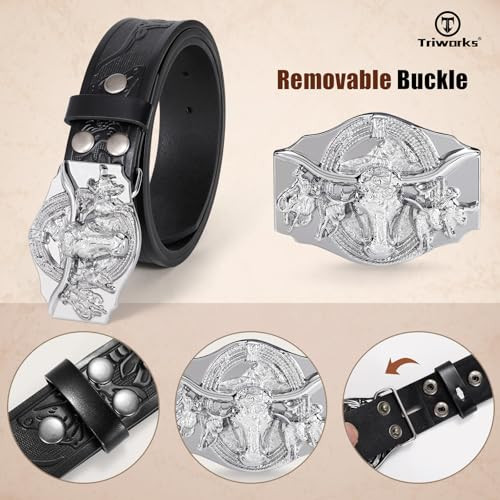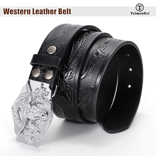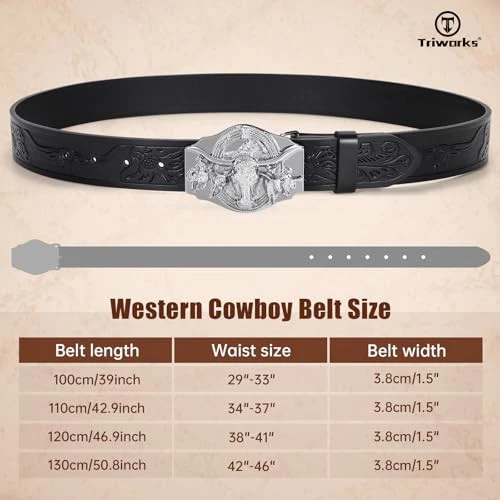 Western Leather Cowboy Belt for Men & Women - Black - Fits 34"-37" Waist