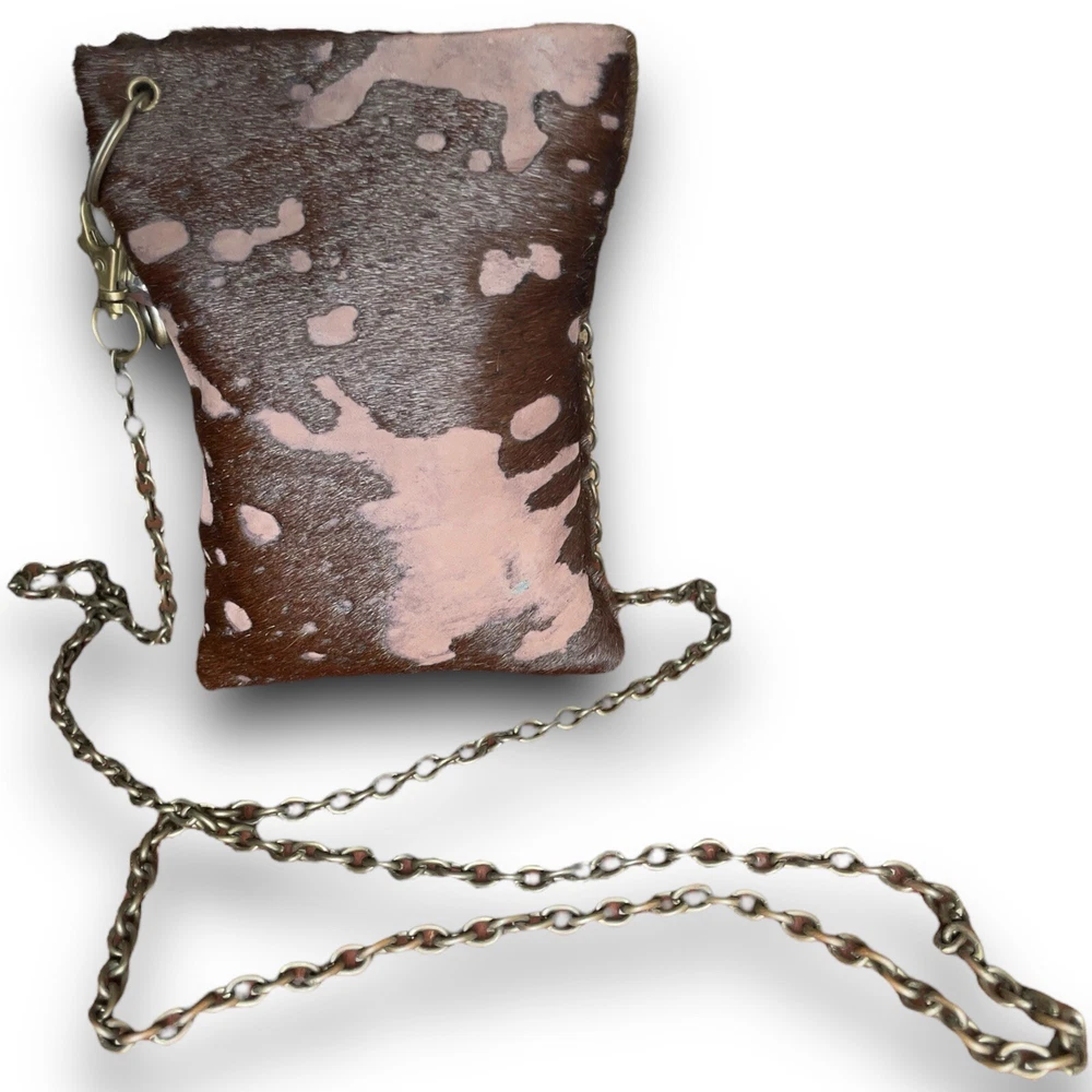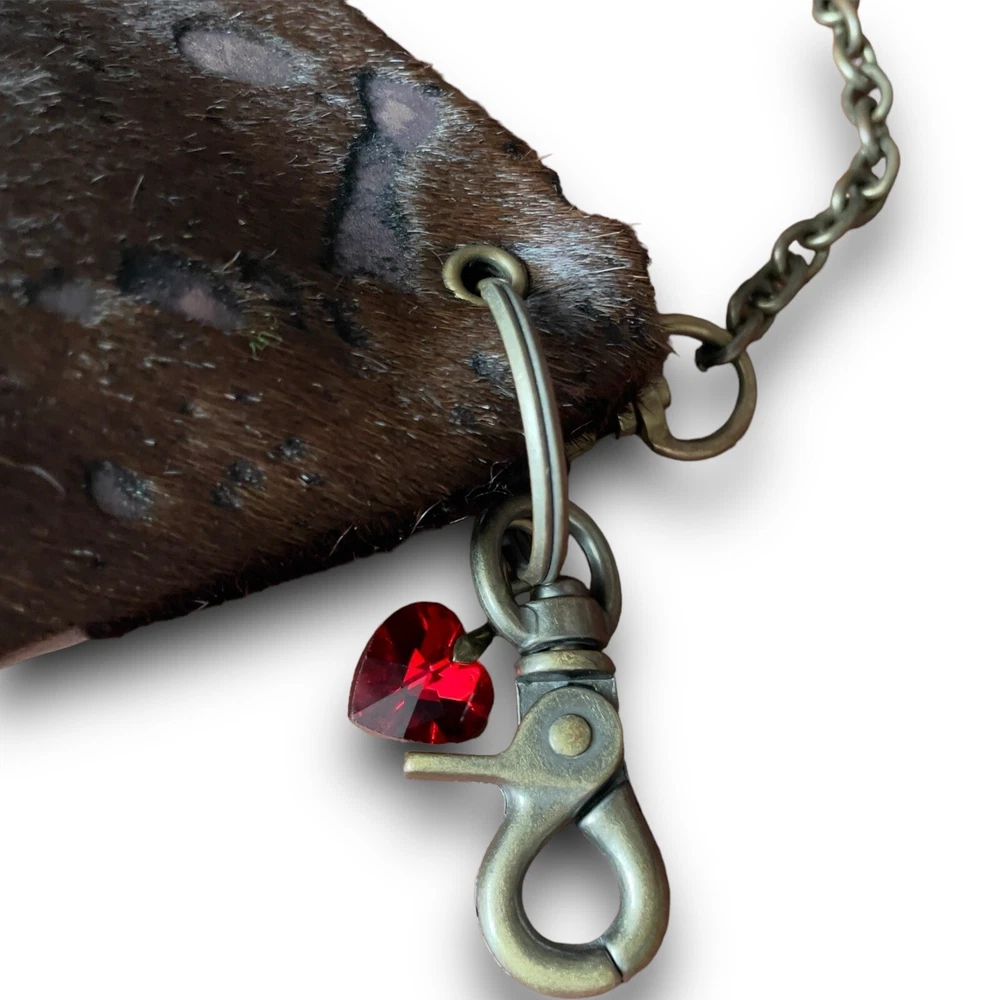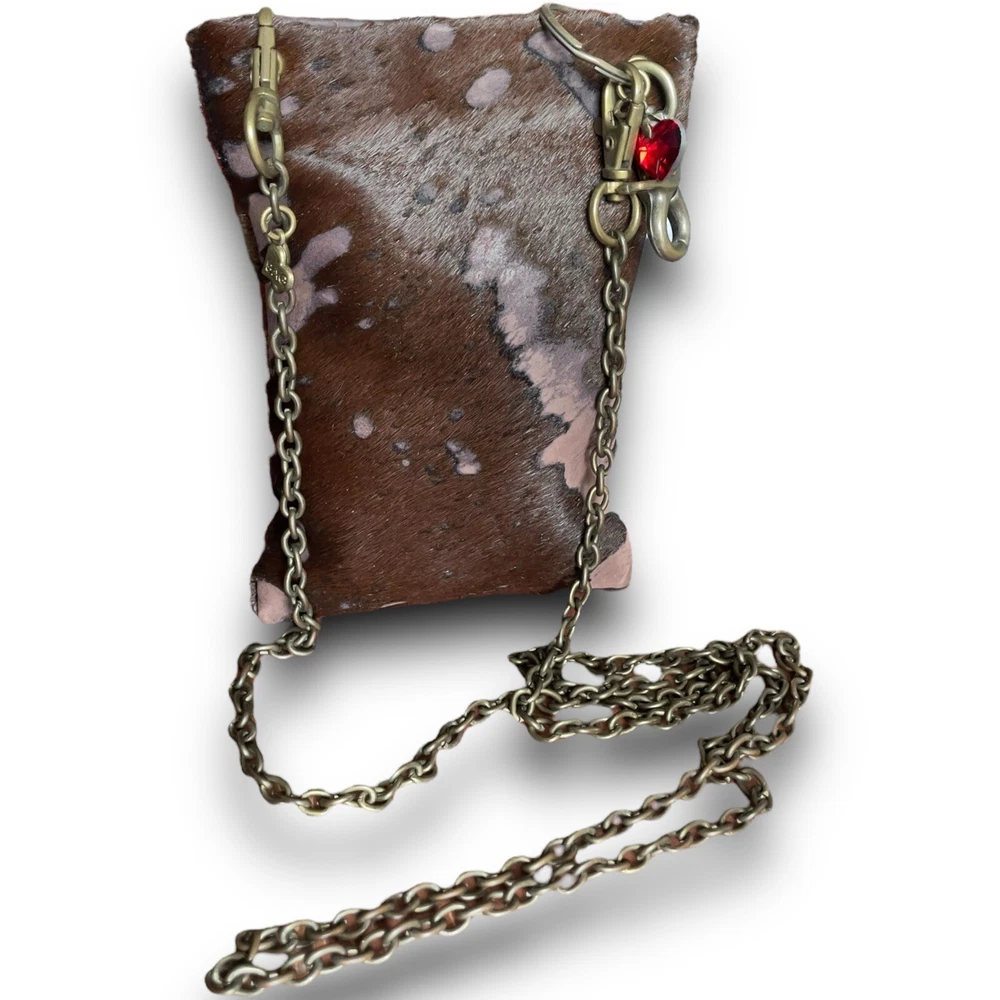 The Original B Bag™....Classy, Sophisticated, Edgy, Sassy and Fun...But most of all...Functional! This mini purse measures 6 1/2" tall by 4 5/8" wide with a magnetic closure. Each B Bag™ has the ability to contain your B Bag™ card wallet, your mobile device, a lipstick and a pen, as well as a passport when necessary. Aside from wearing the B Bag™ crossbody, you can double the chain and carry it as a gorgeous evening bag or even a shoulder bag. The chain can be removed and used as a necklace. Remove the charm from your bag and attach it to the chain double the chain and carry it as a gorgeous evening bag or even a shoulder bag. The chain can be removed from your B Bag™ and used as a necklace. Attach your favorite B Bag™ to a belt loop or even a larger handbag to have easy access to your important things and can dress up any handbag! This cowhide acid wash leather clutch is in excellent preowned condition. Original price $168 Keywords: Lisa Berck, crossbody, cowhide leather, rustic brown, women's bag, brass chain, antique brass, fleur de lis, heart, engraved tag, red crystal, pre-owned, stylish, unique patterns, evening accessory, western, boho, cowgirl, shabby chic, ranchwear,