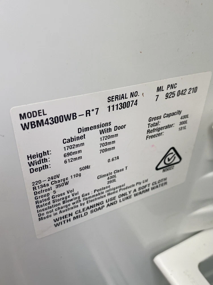 Power Source: Electric Item Height: 1720mm Model: WBM4300WB-R*7 Suitable For: Larder Fridge, bottom mount fridge freezer, upside down fridge freezer Capacity: 454L Brand: Westinghouse Power: 350W Installation: Freestanding Colour: Silver Manufacturer Warranty: 1 Year Set Includes: Basket, Bin, Bottom-Mount, Compressor, Condenser Fan Motor, Control Board, Crisper, Damper, Door, Door Handle, Door Tray, Drawer, Drawer Cover, Evaporator Fan Motor, Fan, Hinge, Ice Bin, Ice Cube Tray, Ice Maker, Lamp, Lamp Cover, Mini Fridges, Seal/Gasket, Shelf Item Depth: 709mm Finish: Glossy Item Width: 703mm Material: ABS Plastic Country/Region of Manufacture: Australia Type: Shelf