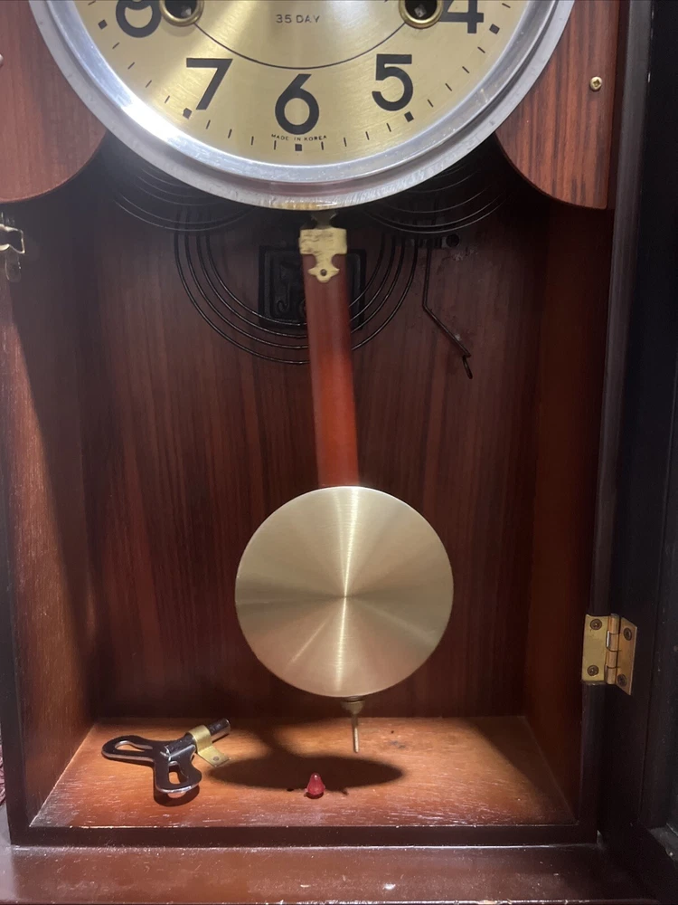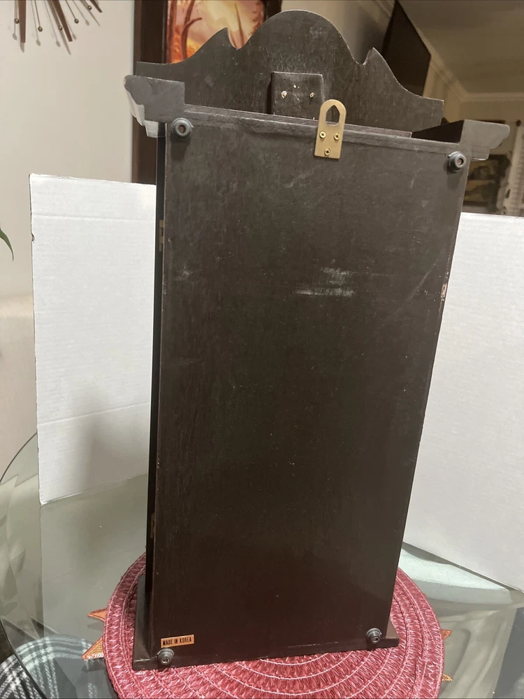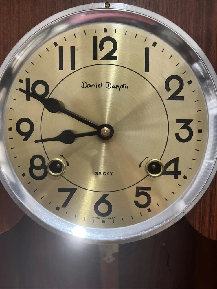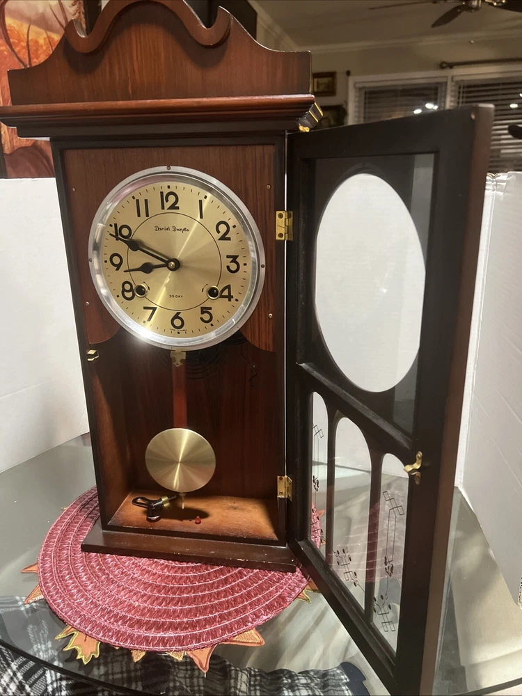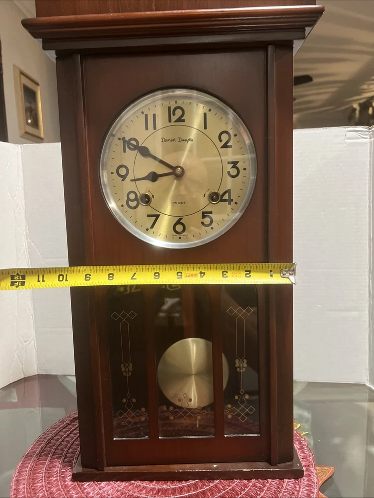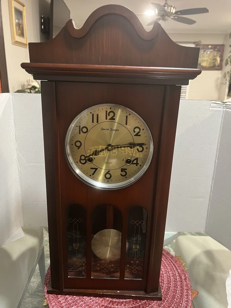 Vintage Westminster Chime Clock by Daniel Dakota Tempus Fugit. This clock features a dark cherry wood frame with a rectangular shape. It is a mechanical clock powered by a 35-day movement. The clock displays analog time and chimes in the Westminster sequence. The clock is a bracket style, suitable for any room, and has a retro/vintage design. Made in Korea, Republic of, this original clock is signed by the brand. Texted and works good Look at the pictures amd ask questions before making your purchase