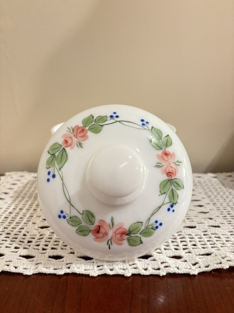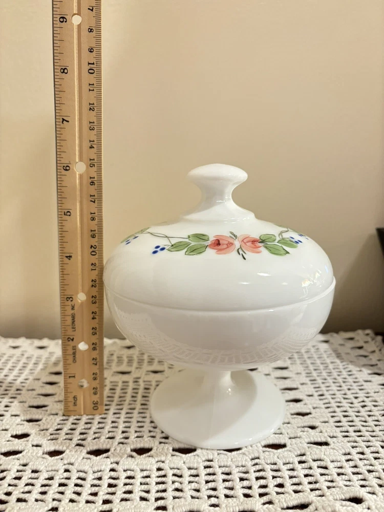 This beautiful candy dish is a vintage piece from Westmoreland, a well-known brand in glassware. The dish is made of white glass and features intricate hand-painted designs that make it a unique addition to any collection. It's perfect for storing candies, small treats, or even as a decorative piece. The dish is in excellent shape and ready to be displayed in your home. Good condition. No chips and crack. Please view all pictures for details.