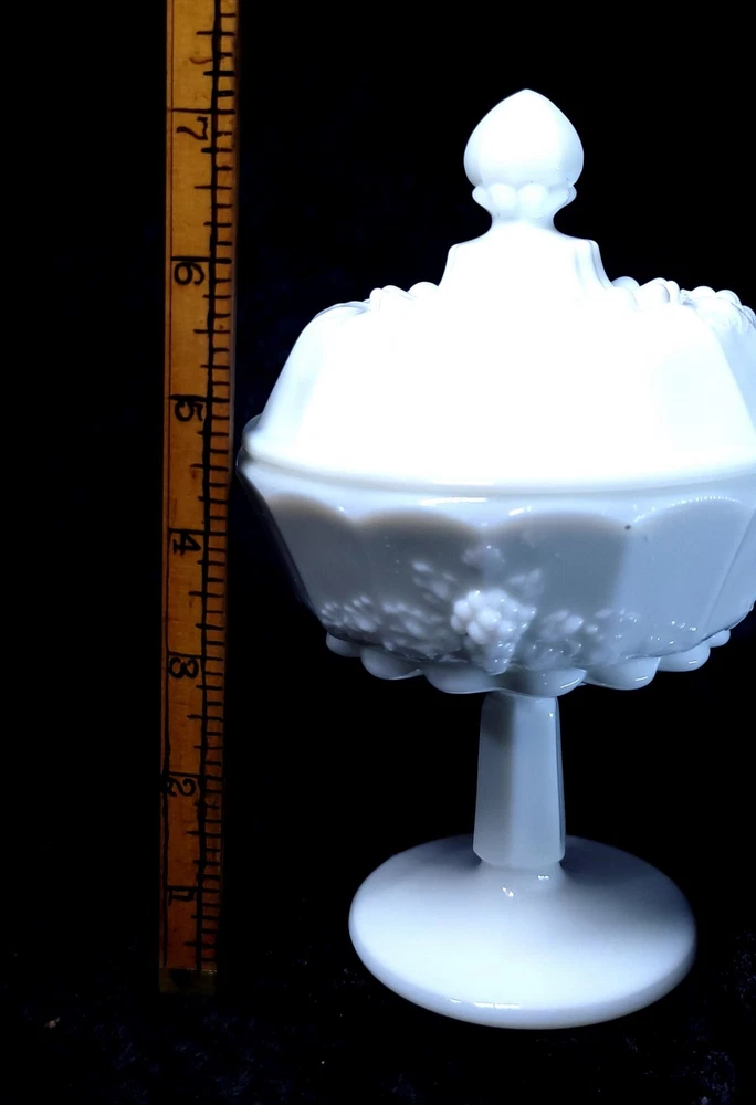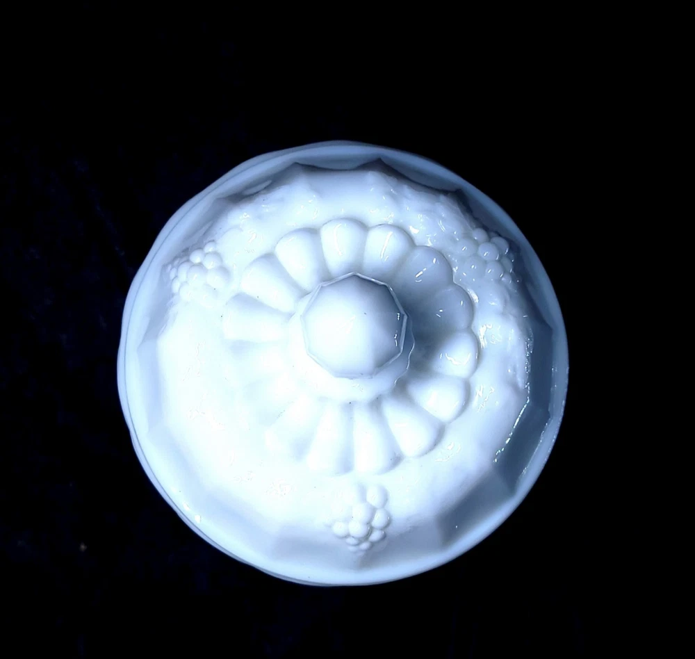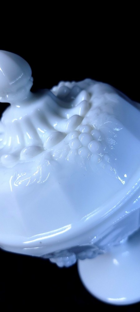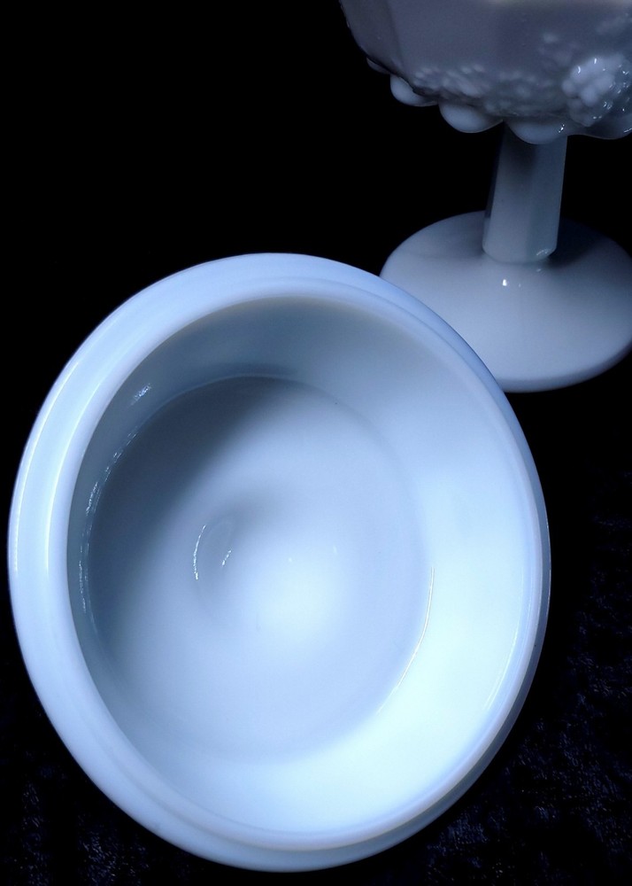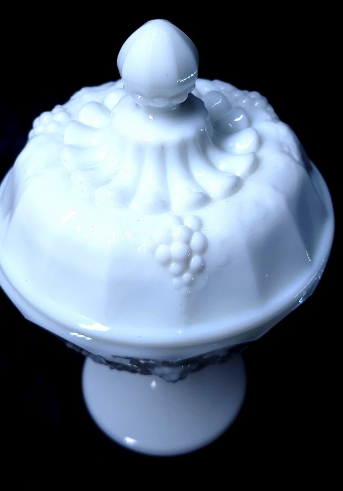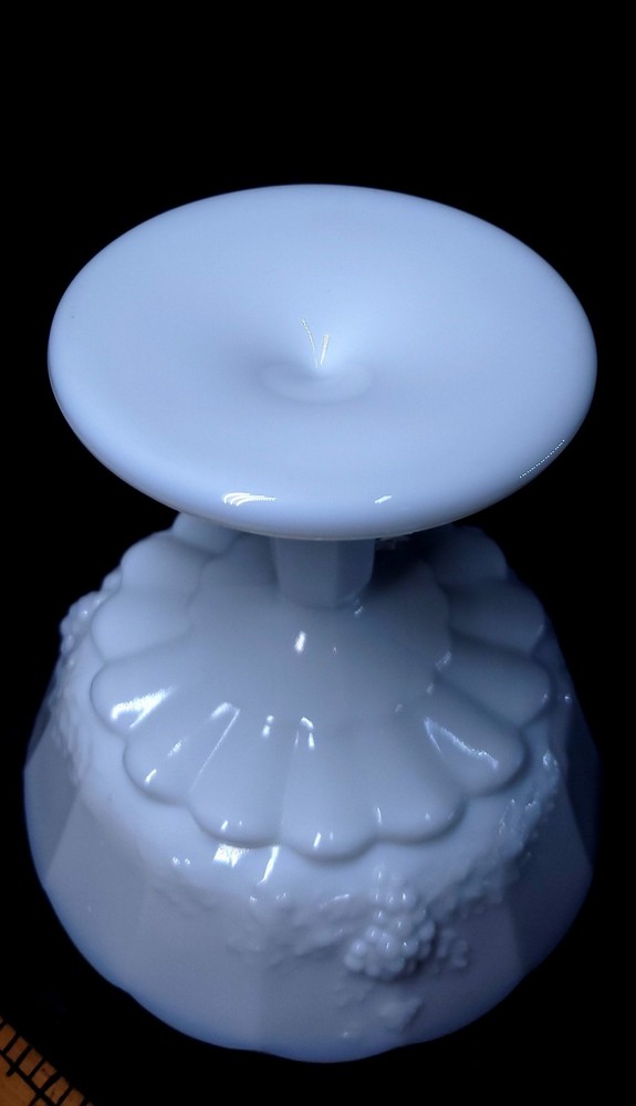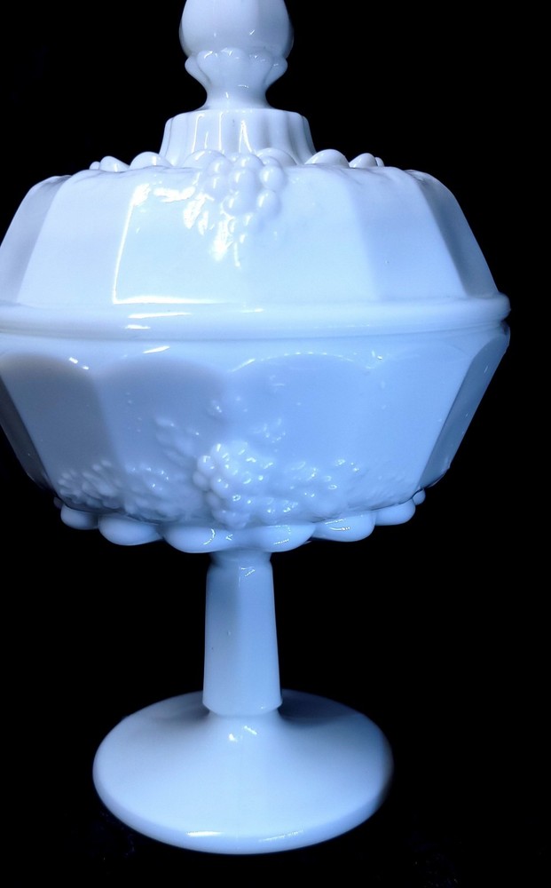 Type:Candy DishPattern:panel grapeFeatures:Lid Included, DecorativeProduction Technique:Fused GlassFinish:GlossyStyle:Mid-Century ModernOrigin:North CarolinaMaterial:GlassOriginal/Licensed Reproduction:OriginalNumber of Items in Set:2Brand:WestmorelandCountry/Region of Manufacture:United StatesNumber of Compartments:1Backstamp:ImpressedProduct Line:Paneled GrapeColor:WhiteTheme:grapeTime Period Manufactured:1950-1959Production Style:Milk GlassVintage:YesShape:Round