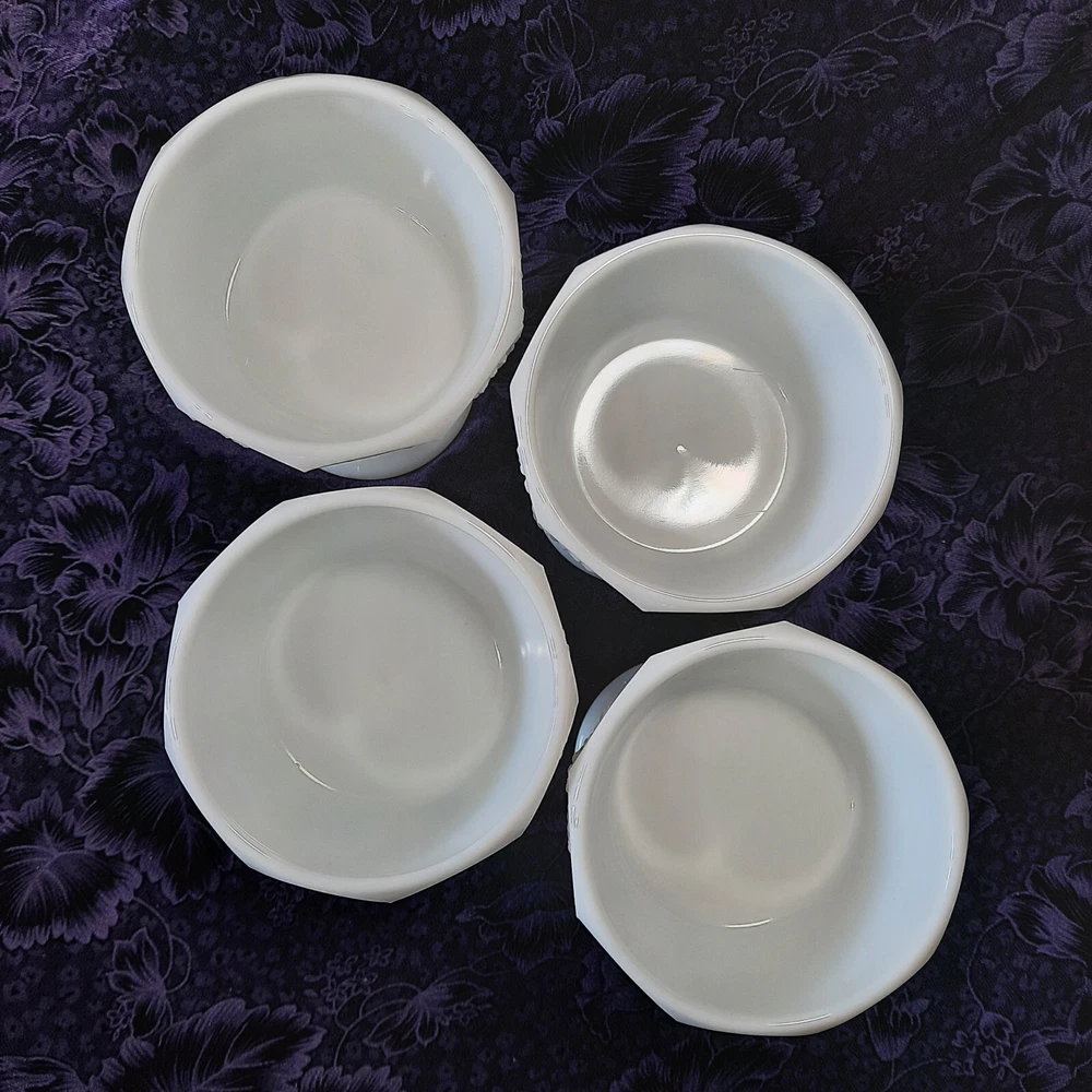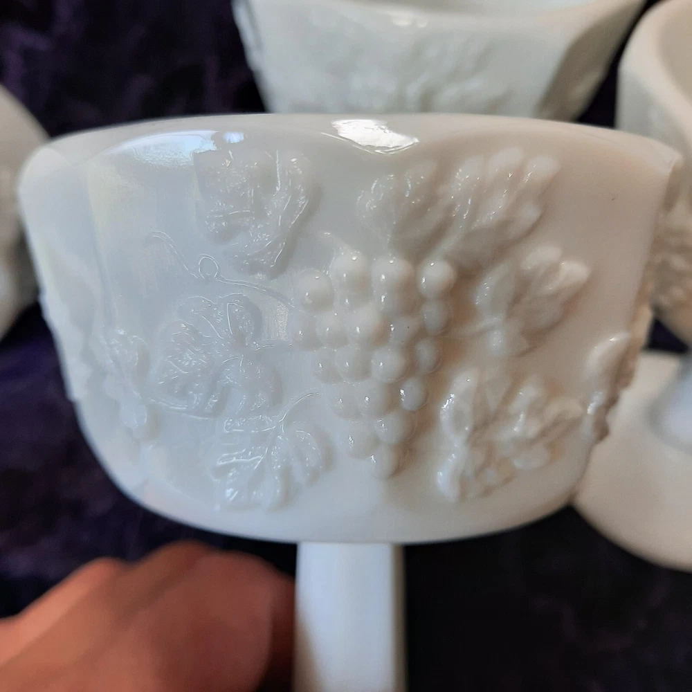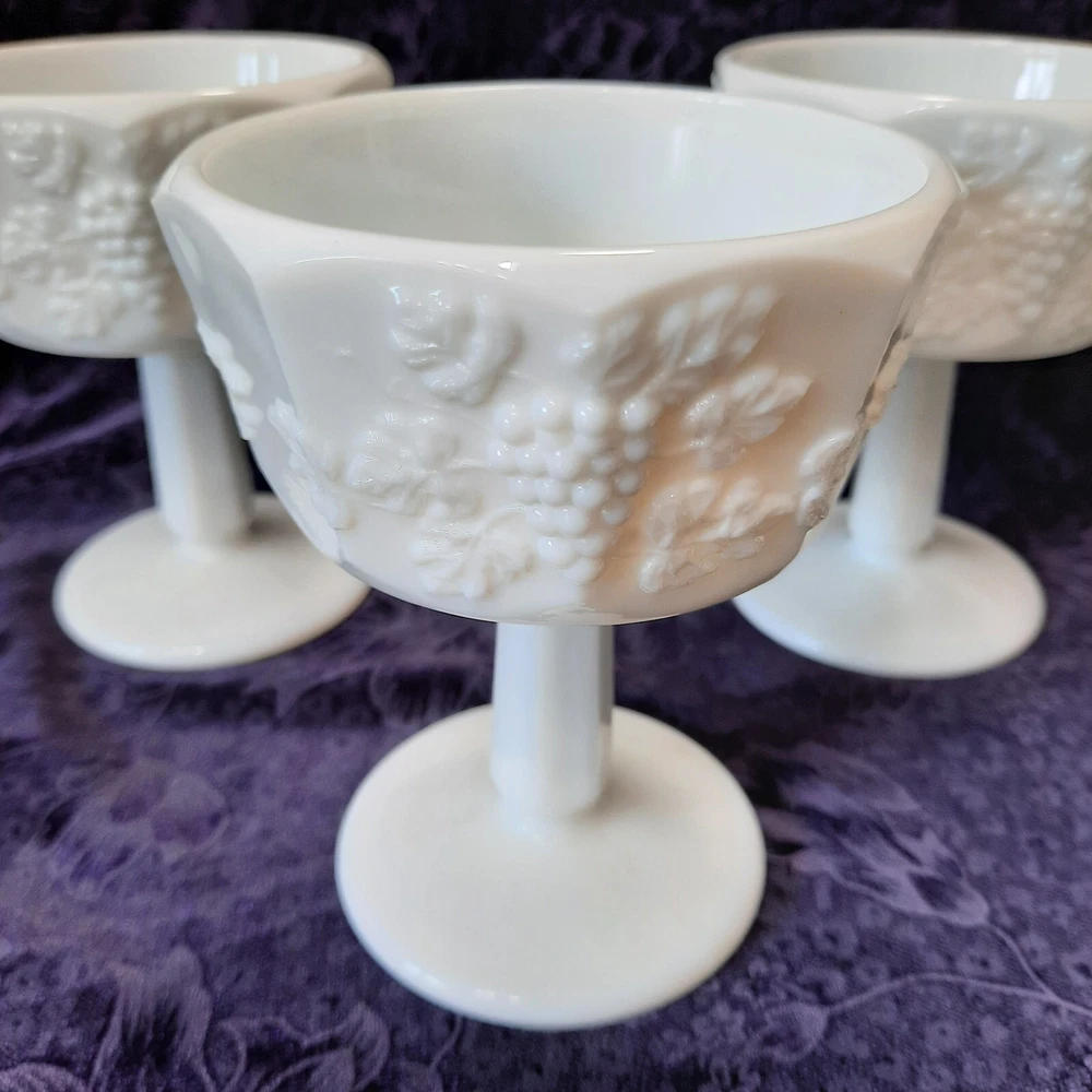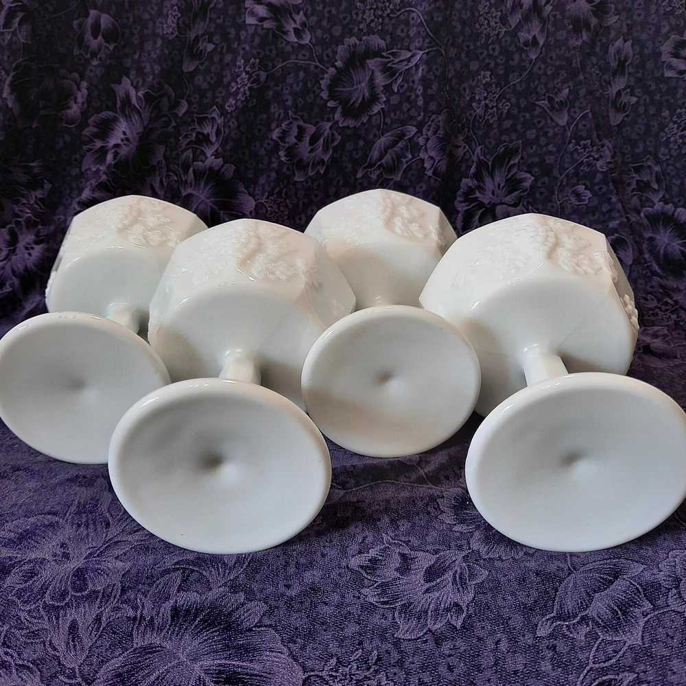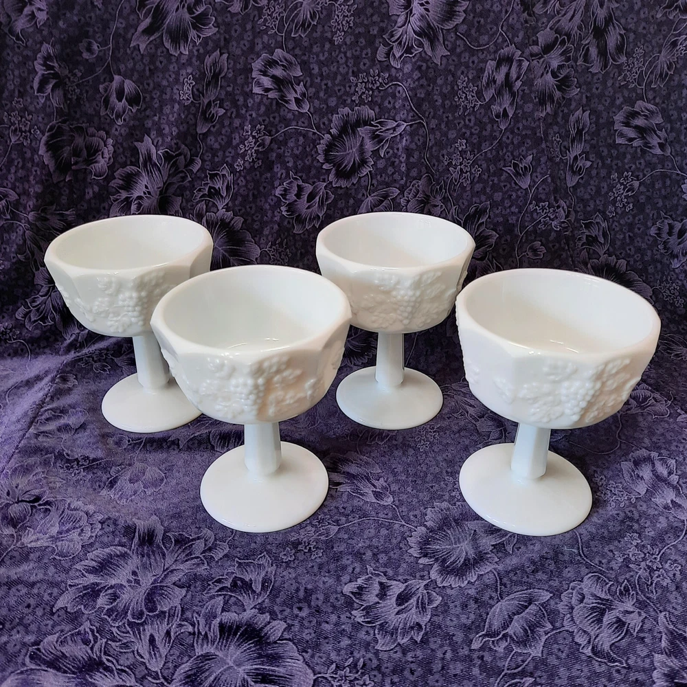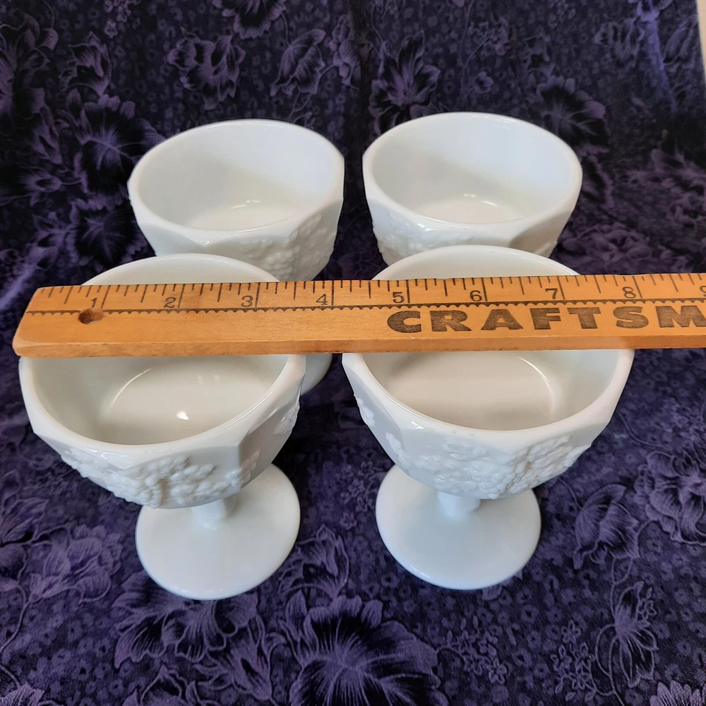 Add a touch of elegance to your dining table with this four-piece set of Westmoreland milk glass paneled dessert bowls. These bowls feature a beautiful grape pattern and come with a footed pedestal base, making them perfect for all occasions. The white color of the glass adds a classic touch to any table setting. Crafted in the United States during the 1960s, these original bowls are both charming and durable. With a bowl diameter of 3 inches and a height of 3.75 inches, they are the perfect size for serving desserts. Ideal for collectors or anyone looking to add a vintage touch to their kitchenware, these bowls are a must-have.