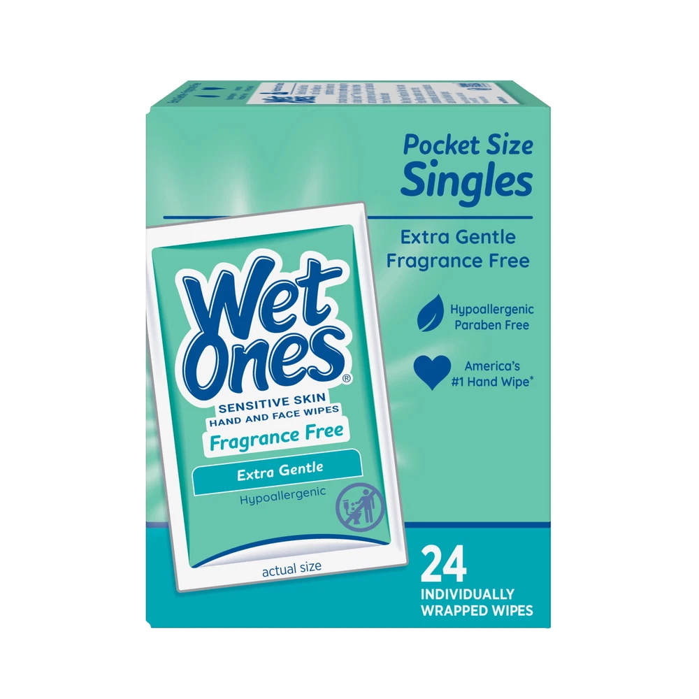 With Wet Ones individually wrapped hand and face wipes, you can always keep skin that feels smooth, soft, and clean within reach. Our travel-ready wipes make it easy to quickly wipe away dirt and messes from hands and face. Plus, pediatrician tested, hypoallergenic, and paraben free, these unscented pocket size single wipes won’t leave behind a sticky residue. Just slip some singles into your lunch box, pocket, or purse before leaving the house, so you’re always ready for whatever life brings. Tough on dirt and gentle on skin, Wet Ones is America’s #1 Hand Wipe Brand**. Wet Ones Sensitive Skin Hand Wipes, Fragrance Free/Unscented, 24 Ct Singles 6 Pack, 144 Total Wipes. **IRI Custom EPC Model, TUS MULO; 52 WE 3-19-23 INDIVIDUALLY WRAPPED WET ONES SINGLES, perfect for pockets, lunchboxes, sports bags, backpacks and more TSA-APPROVED fragrance-free wipes HAND & FACE WIPES that take care of dirt and messes — Without leaving skin feeling dry or sticky POCKET-SIZED HAND WIPES individually wrapped to go anywhere HYPOALLERGENIC AND PEDIATRICIAN TESTED INDIVIDUAL HAND & FACE WIPES — Tough on messes and gentle on skin WET ONES HAND WIPES are America’s #1 hand wipe brand** ALSO AVAILABLE IN 40-count Canisters and 20-count Travel Packs Wet Ones Sensitive Skin Hand Wipes, Fragrance Free/Unscented, 24 Ct Singles 6 Pack, 144 Total Wipes