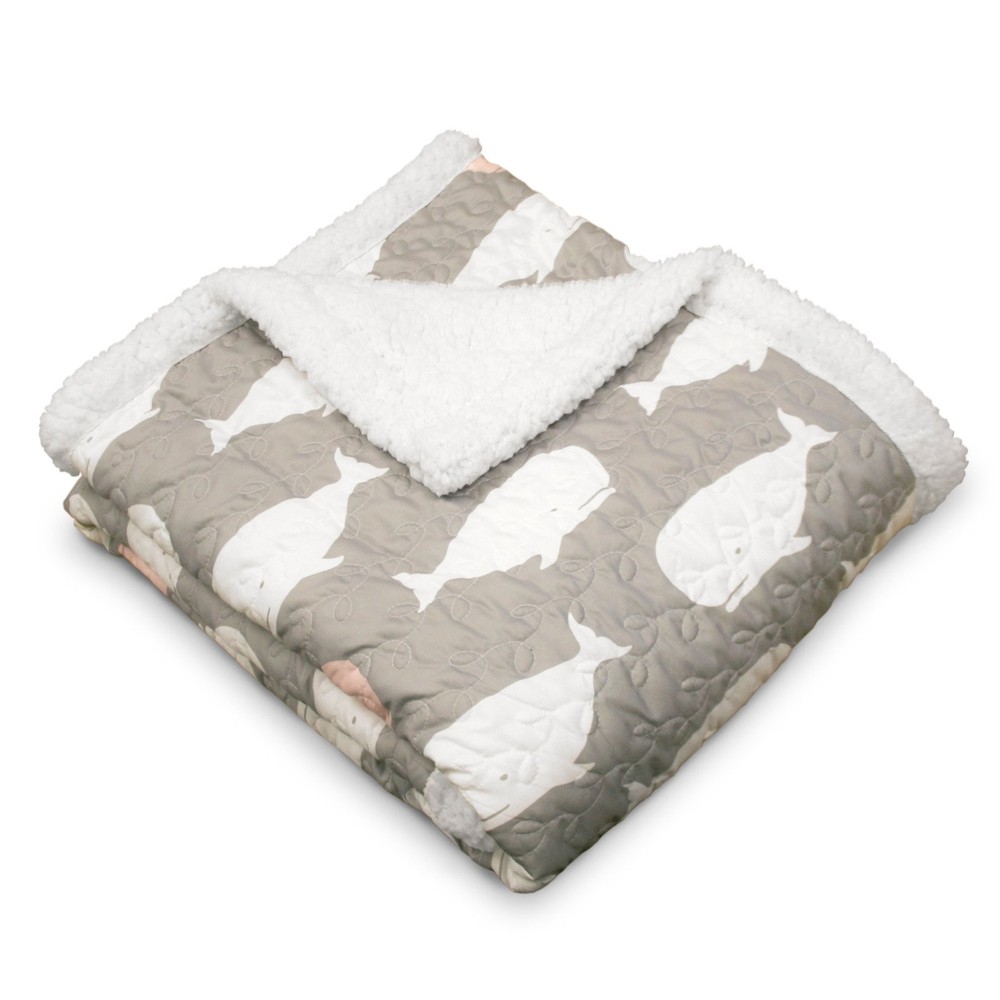 Soft, 100% microfiber fabric reversible Sherpa throw measures 60” x 50”. Adorable, swimming light blue and white whales make for a cute, comfortable, cozy throw. A perfect, fuzzy ocean theme animal blanket for the foot of the bed, pet crate, nursery or as a gift. Two throws in one - white whales against a navy background on one side and a solid white Sherpa blanket on the reverse. Throw is easy to care for and safe to machine wash cold and tumble dry low. Do not iron.