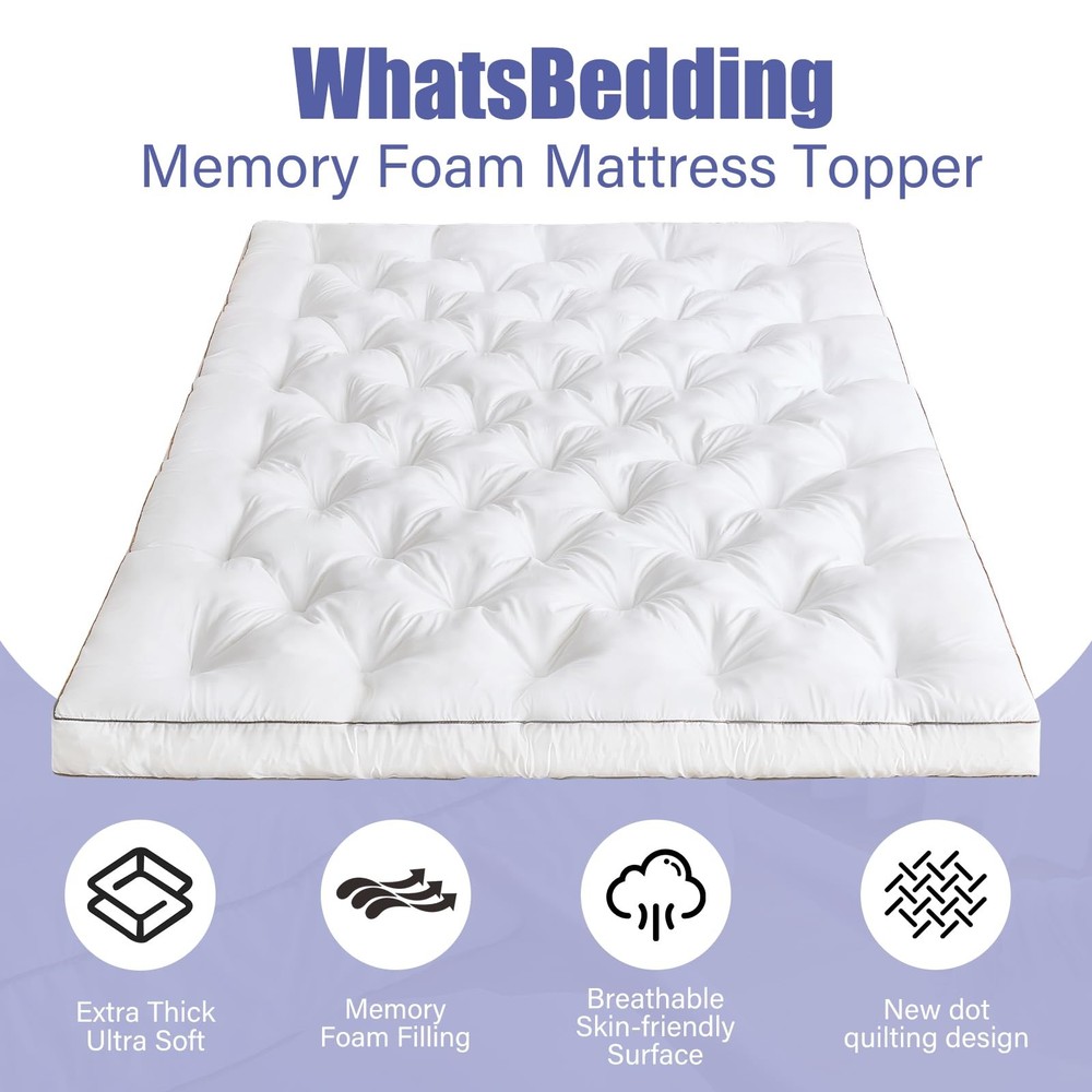 WhatsBedding 4 Inch Memory Foam Mattress Topper Queen for Back Queen, White LuxeFusion Product Description Features 【Good support, fluffy and soft】 Skin-friendly breathable mattress cover, Combines the softness of Gel memory foam with the support of shredded memory foam, enhanced pressure relief and breathable surface for comfortable sleep. 【Ergonomic design】Fits the body curve to relieve pressure and pain. While ensuring support, it provides enough softness, bringing cloud-like comfort, balanced support and effective pressure relief, allowing you to sleep more soundly and relax. 【Stable anchor elastic straps】4 stable anchor elastic straps ensure a secure fit, keep it at the place no matter how you toss or turn on bed. 【New dot quilting design】This mattress topper is made of high-quality fabrics and New dot quilting technology to ensure that the filling is evenly distributed and prevent lumps after long-term use. 【Warm Tips】Our mattress topper is vacuum compressed and packed. Due to the lack of air, it may not look thick enough after opening. Please pat the mattress cover gently and let it stand for 24 hours to achieve the best fluffiness. Whatsbedding focuses on customers' shopping experience. If you have any questions or concerns, please feel free to let us know! Product Details Free Shipping All orders ship free and fast to your doorstep. Easy Returns Satisfaction guaranteed. 30-day returns, no questions asked. 24/7 Support Contact us anytime; we’re here to help, day or night. Brought to you by LuxeFusion – Quality you can trust.