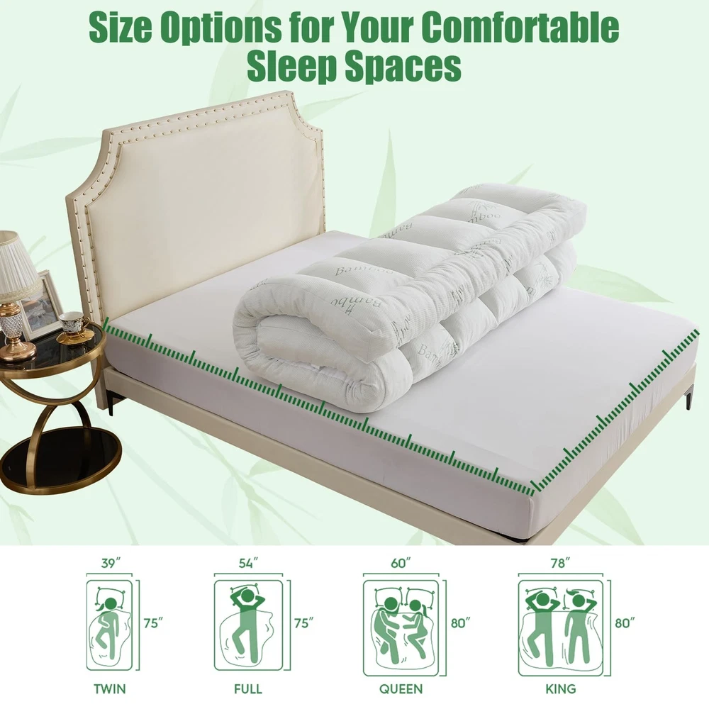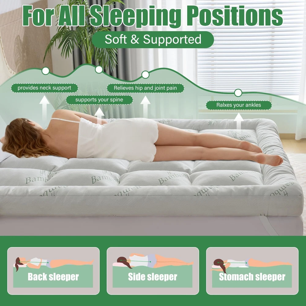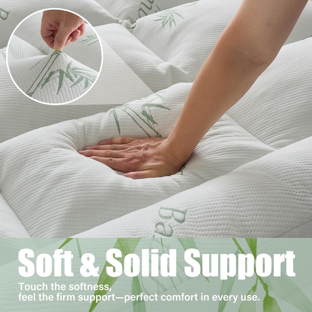 WhatsBedding 5 Inch Memory Foam Mattress Topper Queen Size Queen, White(5in) LuxeFusion Product Description Features [Breathable and Skin-Friendly] This mattress topper is made of natural Bamboo Viscose, which is skin-friendly and breathable. It provides warmth and comfort in winter and coolness and breathability in summer, allowing you to enjoy a comfortable and soft sleeping experience in any season. [Extra Thick and Soft] This 5-inch thick mattress topper is filled with 2000GSM high-density shredded memory foam and a thickened down alternative lining. It offers a soft touch and strong support – providing a comfortable angle and relieving back pressure regardless of your sleeping position. [Exquisite Quilting Design] The grid quilting design secures the internal shredded memory foam in place, preventing long-term sagging and eliminating the need for frequent adjustments. It adds a stylish textured look, enhances the mattress's aesthetics, and improves durability. [Elastic Straps] This mattress topper comes with 4 secure elastic straps to fasten it to the edges of your mattress. Even when you toss and turn or adjust your sheets, it stays in place without shifting or sliding. It remains stable throughout the night for continuous comfort. [Warm Reminder] Our mattress topper is vacuum-compressed for packaging. Due to the lack of air, it may not appear thick enough upon opening. Please gently pat the mattress cover and let it sit for 24 hours to achieve optimal fluffiness. Whatsbedding is committed to improving the customer shopping experience. If you have any questions or concerns, please feel free to contact us! Product Details Free Shipping All orders ship free and fast to your doorstep. Easy Returns Satisfaction guaranteed. 30-day returns, no questions asked. 24/7 Support Contact us anytime; we’re here to help, day or night. Brought to you by LuxeFusion – Quality you can trust.