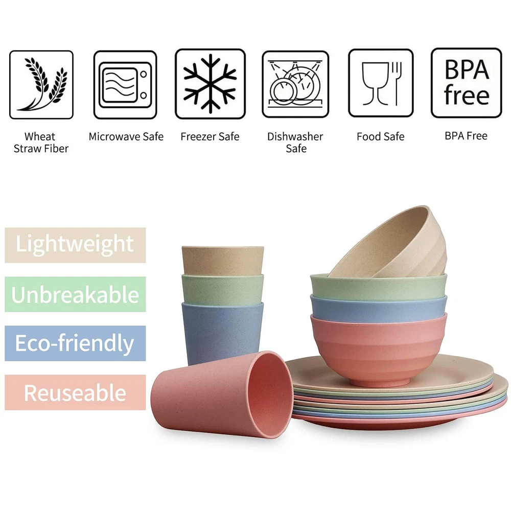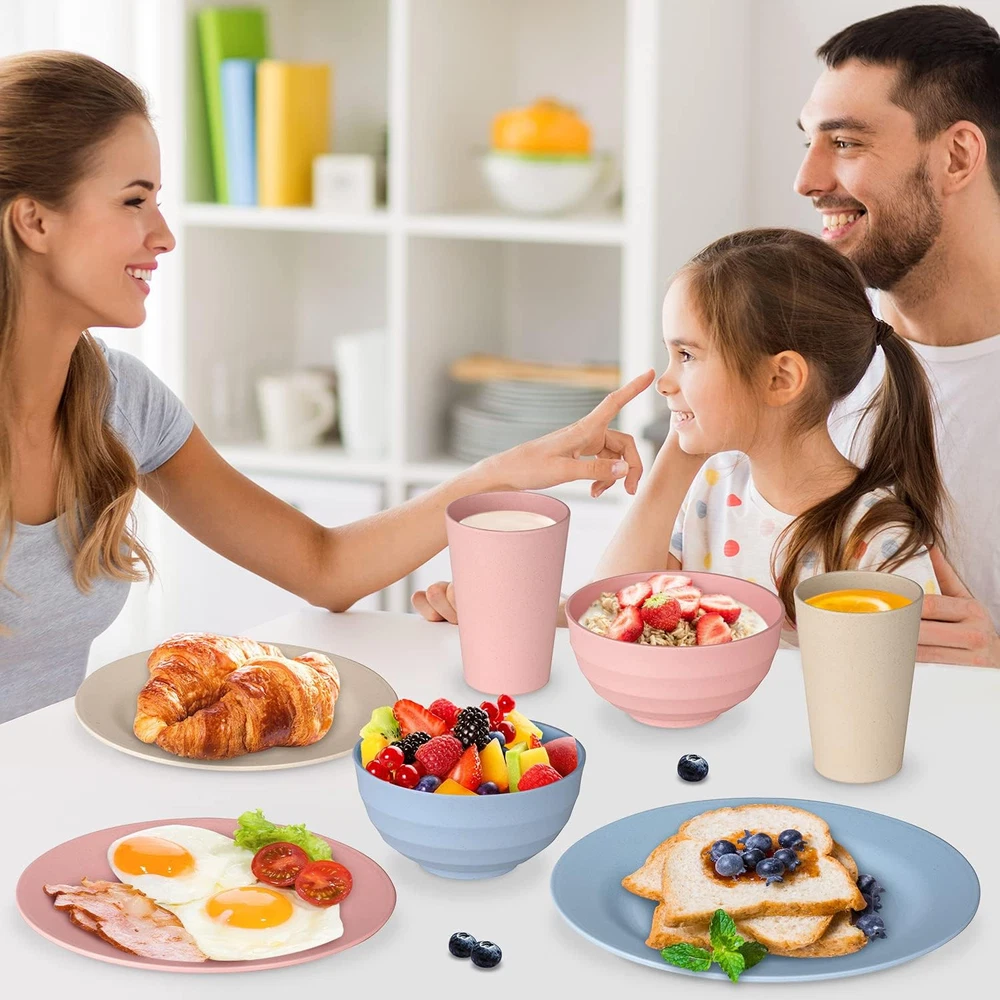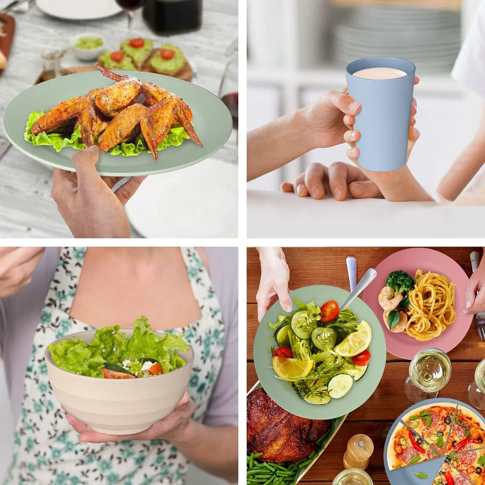 Plastic Dinnerware Set for All Occasions: This 16-piece dinnerware set includes 4 pieces each of 10.5-inch dinner plates, 9.5-inch salad plates, 5.7-inch (24 Fl Oz) plastic bowls, and 3.35-inch (16 Fl Oz) blue plastic cups. Safe and Non-Materials: Made from natural organic wheat straw fiber and BPA-free, food-safe PP materials, this dinner dishes set is a healthier choice for your family and environmentally sustainable. Ideal for parties, picnics, camping, and daily use at home, school, or the office. Lightweight and Durable: These wheat straw plates, dishes and blue cups are light, easy to handle, and far more durable than ceramic and glass, making them perfect for all ages and every meal, from breakfast to dinner. Versatile Usage: Perfect for serving a variety of meals, including pasta, sandwiches, bread and butter, desserts, soups, rice, salads, and appetizers, these plates, plastic dishes and bowls sets will enhance your dining experience with their aesthetic appeal. Space-Saving Dinnerware Set: The stackable design of this plates and bowls dinnerware set ensures compact storage in your kitchen cabinet or dish rack, preventing toppling and saving space.