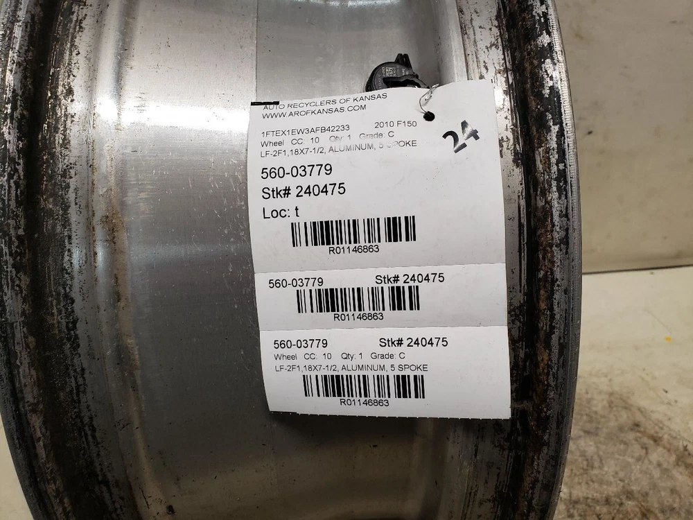 Welcome to our eBay Store! Wheel 18x7-1/2 Aluminum 5 Spoke Fits 09-10 FORD F150 PICKUP 1146863 Description Please read the entire listing before bidding. Our parts are not new! We sell only recycled automotive parts! All parts are tested to the fullest means possible to ensure only the highest quality products are listed in our eBay Store. We make every effort to provide you with the best photos of the product listed. All our wheels are sold individually without tires, center caps and TPMS sensors are not guaranteed. Donor Vehicle VIN: 1FTEX1EW3AFB42233 Model: F150 Year: 2010 Mileage: 178000 (0 = not available or unknown) Stock Number: 240475 Store Number: 1 Part Detail Part Grade: C Part Category: U Part Placement: Notes: LF-2F1,18X7-1/2, ALUMINUM,C-PIC This part will fit these makes and models with these options FORD F150 PICKUP 09-10 18x7-1/2, aluminum, 5 spoke, (indented spoke ends) WARRANTY / GUARANTEE Most parts we sell through eBay Motors come with a 30-day money back guarantee unless otherwise stated. The 30 day period starts when you take possession of the part. No labor warranty is provided. In the event a part sold with a warranty fails to operate within the warranty period we will replace the part(s) with a functionally equivalent part or refund the part purchase price, at our option. To return an item you must contact us via eBay Message within the 30 day period to obtain a RMA number (return material authorization). Original shipping charges and return shipping charges are not refunded. Once you obtain an RMA number, ship the item back to Auto Recyclers of Kansas, 1200 E Macarthur, Wichita, KS 67216 along with the RMA number. SHIPPING NOTES ABOUT US HELP Auto Recyclers of Kansas ships to US addresses within the 48 states only via UPS ground. International orders are sent via ebay's Global Shipping Program . Pick up at our facilities is available. Please message us prior to your purchase to arrange pick up. Items will be shipped within 1-2 days of purchase. Please allow up to 10 days for delivery unless item falls under ebay's Guaranteed Delivery p rogram. Most areas in the US are within 5 days. If an item arrives damaged, please contact us via eBay Message within 24 hours for instructions. If you have a question about a part please contact us BEFORE purchasing. Our main contact method is by eBay Messages. We try to answer all messages within 24 hours. If we are unable to answer your questions before the listing ends the item will be re-listed again soon for you to purchase. Core Charge. Core is an acronym for ‘Cash On Return’. A core charge is sometimes applied to rebuildable parts such as engines or alternators that can be redeemed for a portion of their original price. If the part you are purchasing has a core charge applied, it will be noted in the description. Parts Grading. A standard code system is used to communicate the condition and quality of a part between automotive recyclers, automotive repair shops, and insurers. Knowing how these codes are used will help you understand whether the part meets your expectations before you buy it and what you can expect from the part when you receive it. A Grade - The highest quality part. It is of low miles and/or exceptional condition for its age. B Grade - The second level quality part. It is of average miles and normal condition for its age. C Grade - The third level quality part. It has high miles and/or light damage. No Grade - A part that has not yet been graded.