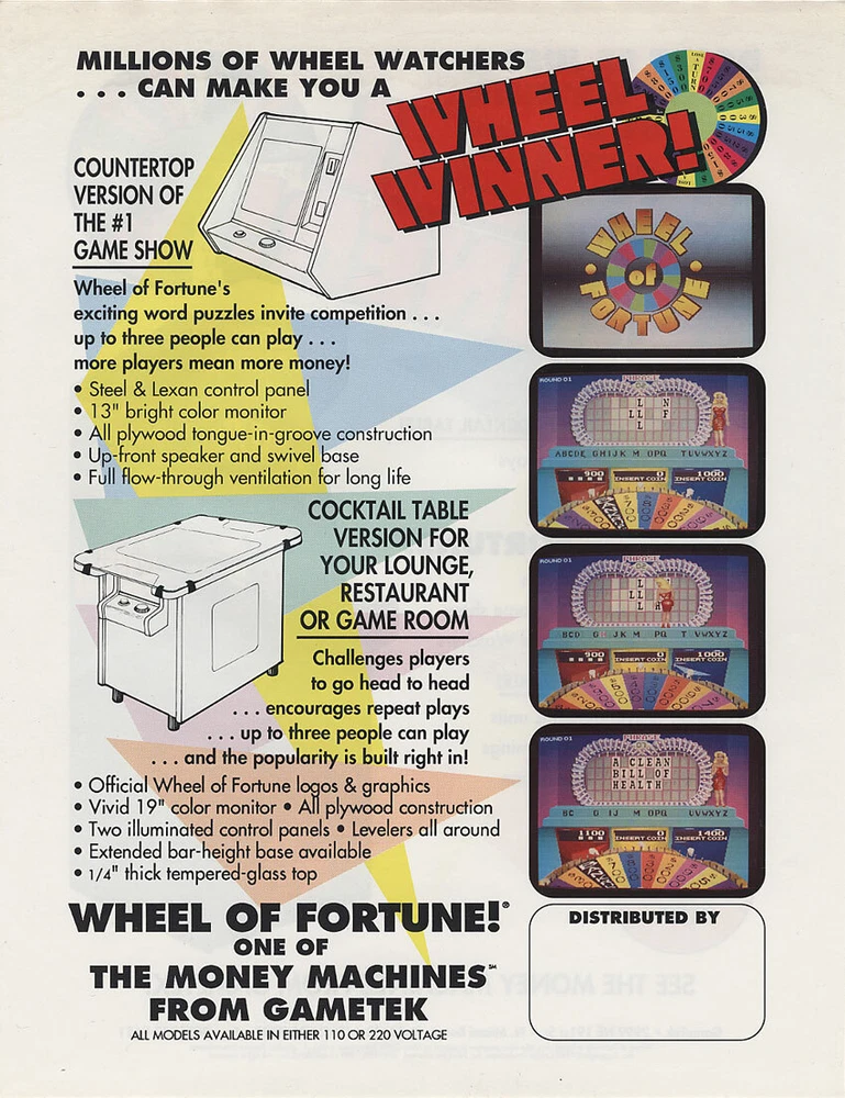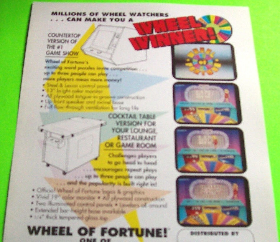 Wheel Of Fortune Arcade Flyer Original Gametek 1989 Video Game Promo Art Print Original never circulated new old stock paper promo sales flyer. Single page double sided artwork sheet. Light wrinkles and age wear. Flyers are paper promotional advertising art print sheets made for coin operated amusement arcade games. Also called a circular, brochure, pamphlet, or flier. Size is 8.5" X 11". Perfect for framing. Sheet protector included with each flyer sold. More pinball, jukebox, slot machine, and vintage arcade game items for sale in our store. SHIPPING Bundle and save by using cart and making single payment. International buyers are responsible for any import fees/taxes. ABOUT US Seller of vintage retro collectibles, pop culture, paper ephemera, new old stock advertising, artwork, original pinball flyers, vinyl records, Mr. Peanut, video arcade flyers, pinball machine parts, game manuals, pinball promo plastics, Mad magazines, antique Halloween and holiday postcards, Christmas items, super hero memorabilia, horror themed art, fun gifts.
