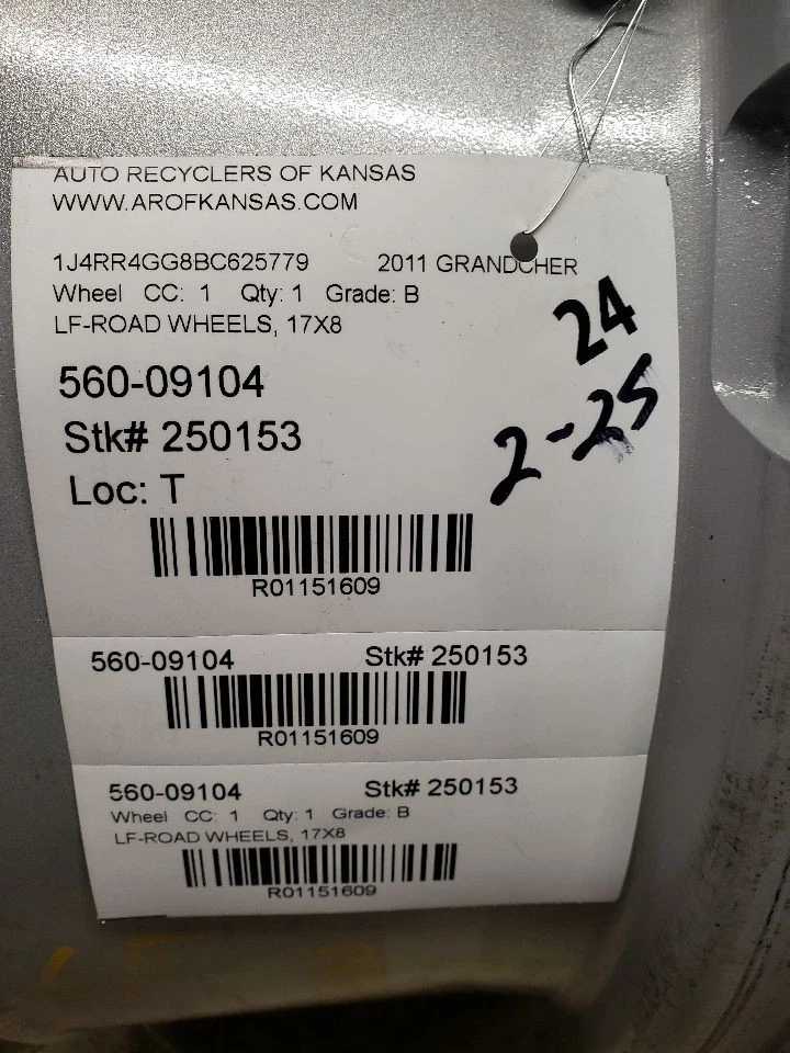 Welcome to our eBay Store! Wheel Road Wheel 17x8 Fits 11-13 GRAND CHEROKEE 1151609 Description Please read the entire listing before bidding. Our parts are not new! We sell only recycled automotive parts! All parts are tested to the fullest means possible to ensure only the highest quality products are listed in our eBay Store. We make every effort to provide you with the best photos of the product listed. All our wheels are sold individually without tires, center caps and TPMS sensors are not guaranteed. Donor Vehicle VIN: 1J4RR4GG8BC625779 Model: GRANDCHER Year: 2011 Mileage: 174000 (0 = not available or unknown) Stock Number: 250153 Store Number: 1 Part Detail Part Grade: B Part Category: U Part Placement: Notes: LF-3F2,ROAD WHEELS, 17X8 This part will fit these makes and models with these options GRAND CHEROKEE 11 road wheels, 17x8 GRAND CHEROKEE 12-13 road wheel, 17x8 WARRANTY / GUARANTEE Most parts we sell through eBay Motors come with a 30-day money back guarantee unless otherwise stated. The 30 day period starts when you take possession of the part. No labor warranty is provided. In the event a part sold with a warranty fails to operate within the warranty period we will replace the part(s) with a functionally equivalent part or refund the part purchase price, at our option. To return an item you must contact us via eBay Message within the 30 day period to obtain a RMA number (return material authorization). Original shipping charges and return shipping charges are not refunded. Once you obtain an RMA number, ship the item back to Auto Recyclers of Kansas, 1200 E Macarthur, Wichita, KS 67216 along with the RMA number. SHIPPING NOTES ABOUT US HELP Auto Recyclers of Kansas ships to US addresses within the 48 states only via UPS ground. International orders are sent via ebay's Global Shipping Program . Pick up at our facilities is available. Please message us prior to your purchase to arrange pick up. Items will be shipped within 1-2 days of purchase. Please allow up to 10 days for delivery unless item falls under ebay's Guaranteed Delivery p rogram. Most areas in the US are within 5 days. If an item arrives damaged, please contact us via eBay Message within 24 hours for instructions. If you have a question about a part please contact us BEFORE purchasing. Our main contact method is by eBay Messages. We try to answer all messages within 24 hours. If we are unable to answer your questions before the listing ends the item will be re-listed again soon for you to purchase. Core Charge. Core is an acronym for ‘Cash On Return’. A core charge is sometimes applied to rebuildable parts such as engines or alternators that can be redeemed for a portion of their original price. If the part you are purchasing has a core charge applied, it will be noted in the description. Parts Grading. A standard code system is used to communicate the condition and quality of a part between automotive recyclers, automotive repair shops, and insurers. Knowing how these codes are used will help you understand whether the part meets your expectations before you buy it and what you can expect from the part when you receive it. A Grade - The highest quality part. It is of low miles and/or exceptional condition for its age. B Grade - The second level quality part. It is of average miles and normal condition for its age. C Grade - The third level quality part. It has high miles and/or light damage. No Grade - A part that has not yet been graded.
