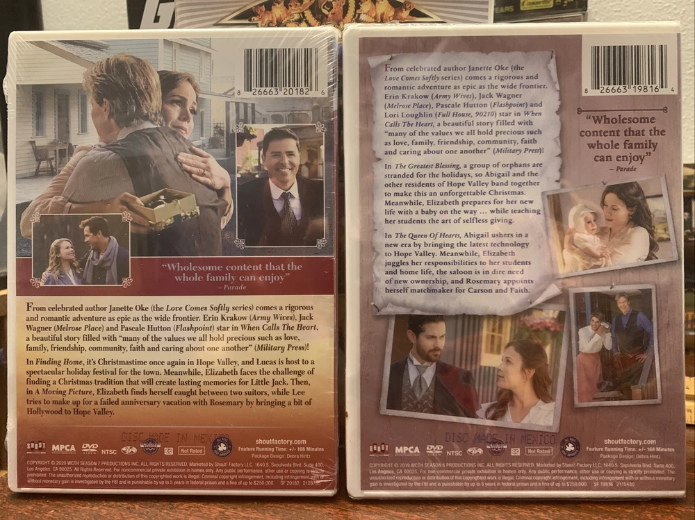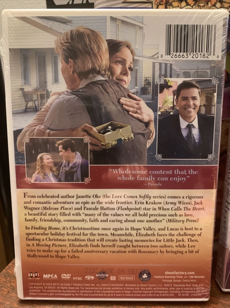 When Calls the Heart - 2 double fetures from seasons 6 & 7 - 4 movies in all - new, sealed - Hallmark channel. "Wholesome content that the whole family can enjoy" – Parade From celebrated author Janette Oke (the Love Comes Softly series) comes a rigorous and romantic adventure as epic as the wide frontier. Erin Krakow (Army Wives), Jack Wagner (Melrose Place) and Pascale Hutton (Flashpoint) star in When Calls the Heart, a beautiful story filled with "many of the values we all hold precious such as love, family, friendship, community, faith and caring about one another" (Military Press)! Finding Home & A Moving Picture In Finding Home, it's Christmastime once again in Hope Valley, and Lucas is host to a spectacular holiday festival for the town. Meanwhile, Elizabeth faces the challenge of finding a Christmas tradition that will create lasting memories for Little Jack. Then, in A Moving Picture, Elizabeth finds herself caught between two suitors, while Lee tries to make up for a failed anniversary vacation with Rosemary by bringing a bit of Hollywood to Hope Valley. The Greatest Blessing / The Queen Of Hearts After a group of orphans are stranded for the holidays, Abigail and the other residents of Hope Valley band together to make this an unforgettable Christmas. Meanwhile, Elizabeth prepares for her new life…while teaching her students the art of selfless giving.