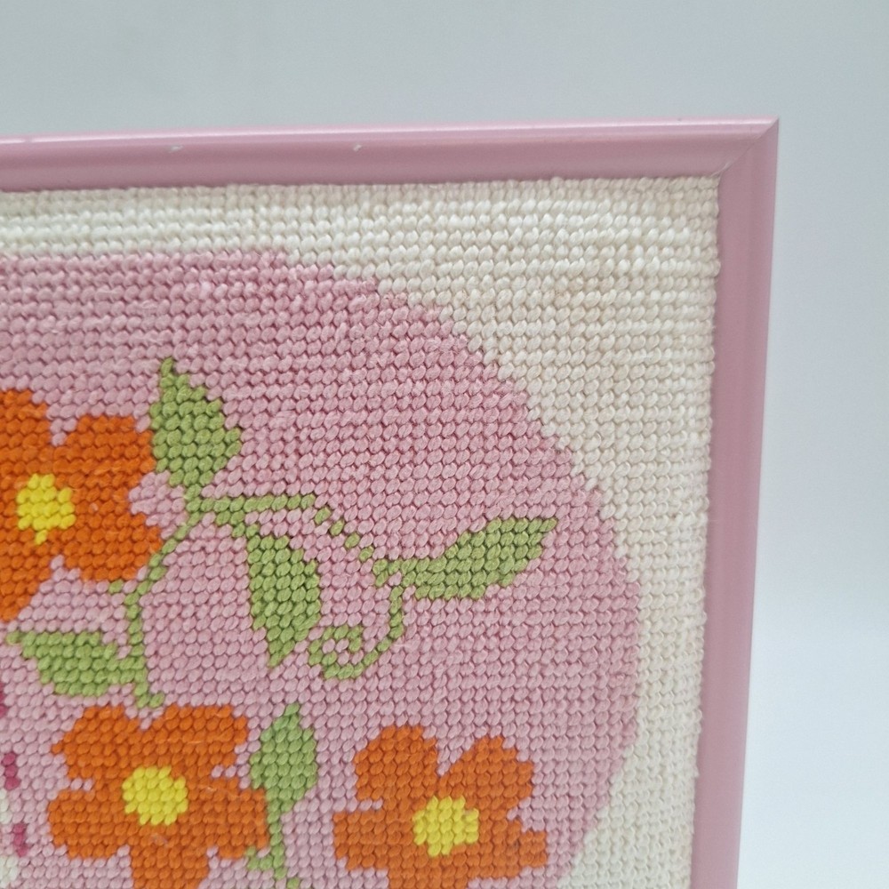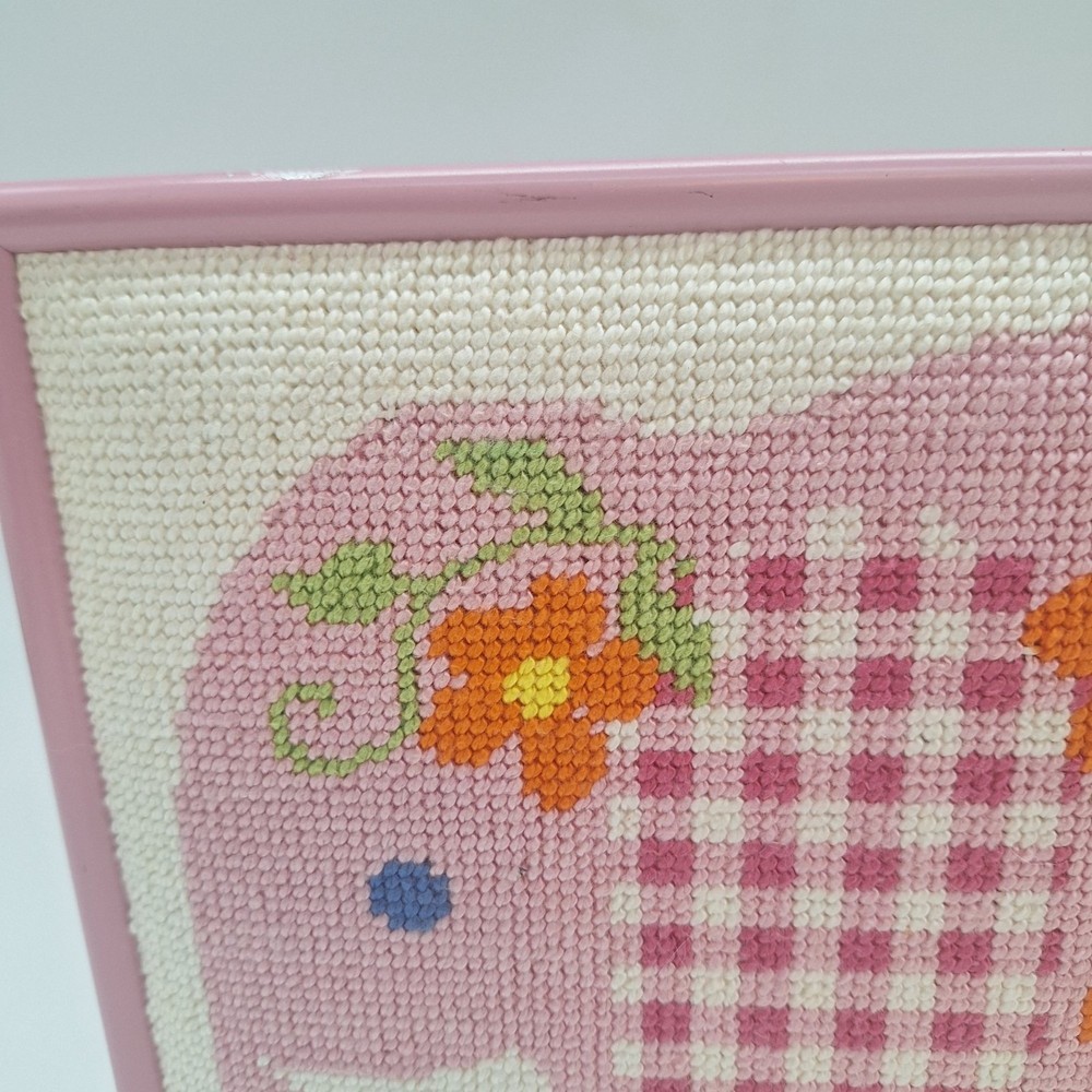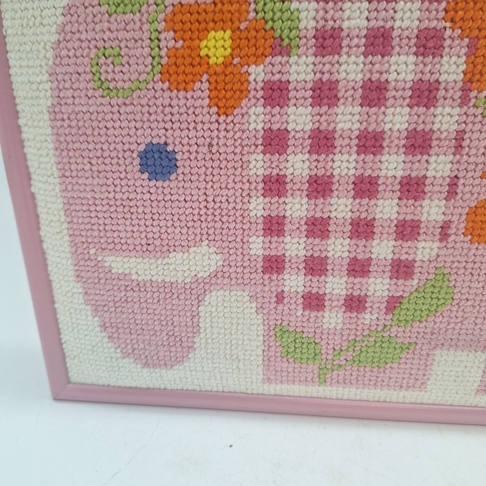 Whimsical pink elephant needlepoint art with orange flowers and gingham frame for kids