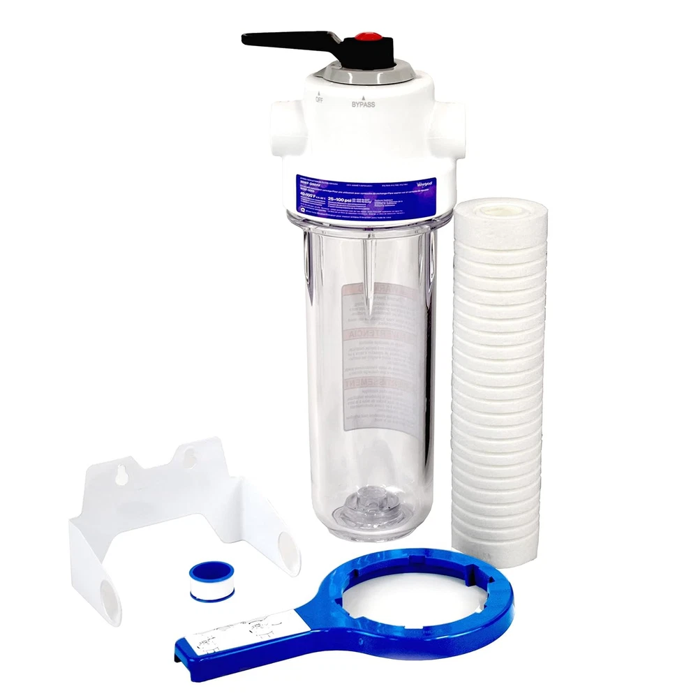 Whirlpool 10 x 2.5 Inch Whole House Water Filtration System WHKF-DWHV, 3/4" Ports, Clear Housing, NSF Certified Water Filter WHKF-GD05 Included Product Details Product Dimensions : 5.4 x 5.4 x 14.4 inches; 3.88 Pounds Item model number : WHKF-DWHV Manufacturer : Whirlpool Country of Origin : Taiwan Brand: Whirlpool Special Feature: Filter included Product Dimensions: 5.4"L x 5.4"W x 14.4"H Package Information: Water Filter Housing Installation Type: Under Sink Purification Method: Sedimentation Power Source: No Power Needed Model Name: WHKF-DWHV 10x2.5" Manufacturer: Whirlpool MaterialIncluded Components: Stainless Steel Ports1 Water Filter Housing, 1 Sediment Filter, 1 Mounting Bracket, 1 Wrench, 1 Tape1 Water Filter Housing, 1 Sediment Filter, 1 Mounting Bracket, 1 Wrench, 1 Tape1 Water Filter Housing, 1 Sediment Filter, 1 Mounting Bracket, 1 Wrench, 1 Tape See more Whirlpool Genuine Parts: This whole home filtration system provides clean, fresh water throughout the entire house for drinking, bathing, cleaning and skincare. Ideal for households of 1-4 persons. This premium filtration system is strong enough for the whole family! Filter Included: Used with the cartridge to reduce particles like sediment, sand, soil, silt, and rust to improve overall water quality. Replacement filter included (Model WHKF-GD05). For cold water use only. Built-in Shut-off Valve: Featuring a filter-bypass switch control with pressure release button, this housing system provides an easy solution for filter replacement and also replaces WHCF-DWHV. NSF Tested and Certified: A water filtration system you can trust – certified by the National Sanitation Foundation International against NSF/ANSI Standard 42 for reduction of Particulate Class V. Optimal Maintenance: For best filtration results, it is recommended to use Whirlpool genuine replacement filters WHKF-GD05/WHPL/WHSW/WHWC. Featuring 3/4" stainless steel inlets that lasts longer than plastic inlets. Additional fitting adapters may be required depending on the sizes of plumbing pipes.
