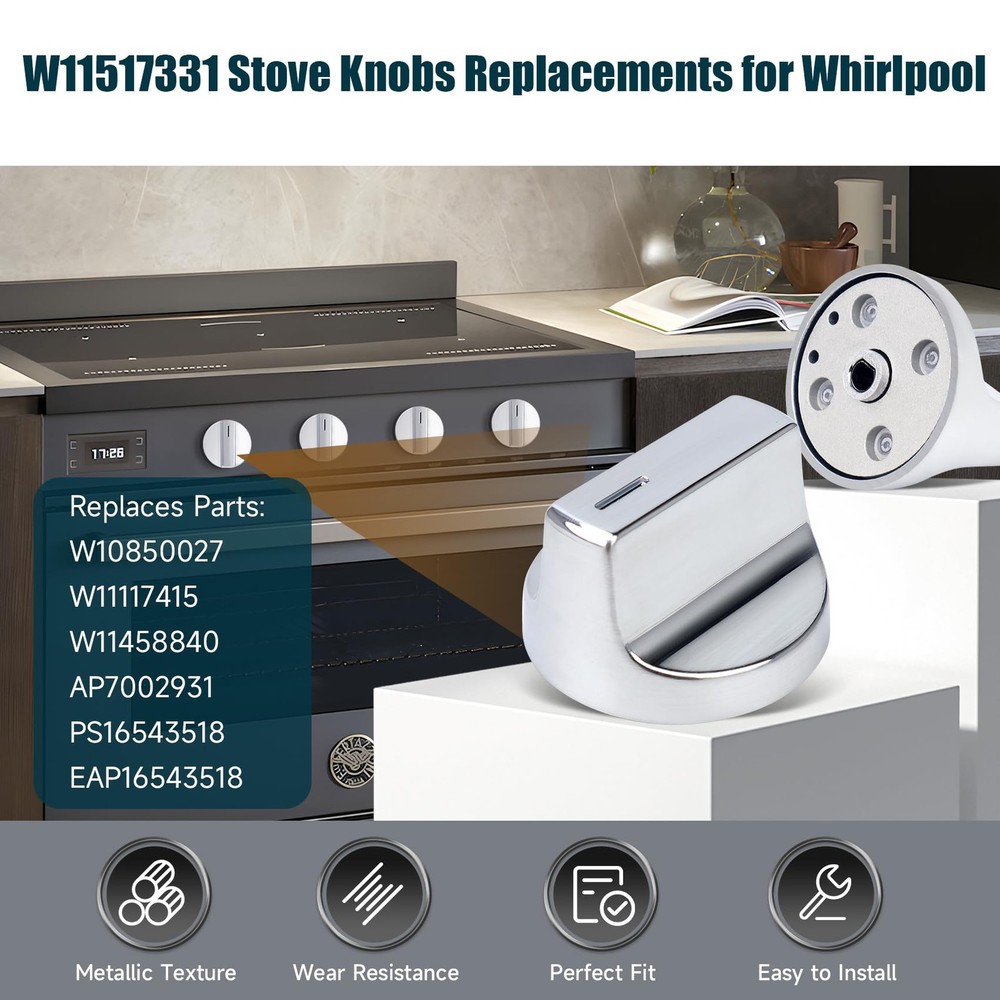 W11517331,W11517331 knob, W11517331 for whirlpool Electric Range Knobs, W11517331 Electric Range Knobs, W11517331 Knobs, W11517331 Range Knobs, W11517331 stove knob, W11517331 Oven Knobs, W10850027 W11117415, W11458840 【W11517331 Perfect Compatibility】W11517331 stove knobs Compatible with whirlpool WEC310S0LS1, WEE515S0LZ1, WEC310S0LS2, WEE515S0LS1, WEC310S0LS3, WEE515S0LZ2, WEE515S0LS2, WEE515S0LV0, WEE515SALS0, WEE515SALS1, WEE515S0LS0, WEC310S0LS0, YWED745H0FE0, YWED74580FH0, YWHE975H0FS0 etc, If you are not sure if it is suitable for your machine, please contact us and I will solve it for you. 【W11517331 Replace part numbers】 W11517331 Electric Range Knobs Replace W10850027, W11117415, W11458840 knbs, AP7002931, PS16543518, EAP16543518, Please double check your machine model number before purchase to ensure compatibility. 【High quality material: W11517331 for whirlpool Electric Range Knobs back side is made of metal stainless steel, reinforcing the whole, not easy to deform,With a thick solid ring. More heat-resistant, abrasion-resistant, Long service life. Smooth surface, easy to wipe clean after oil, making daily maintenance and cleaning simple. 【Easy to install】Our W11517331 Knobs works perfectly with the machine. You can simply remove the old knobs and install the new knob without using any tools in just a few seconds. Can save you valuable time. 【Risk-free shopping】We are committed to customer satisfaction. If you are not satisfied with the product, please contact us. We will fix the problem within 24 hours.