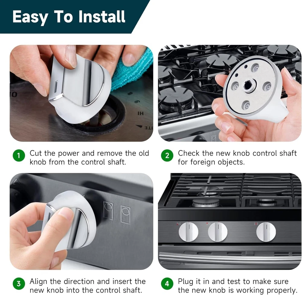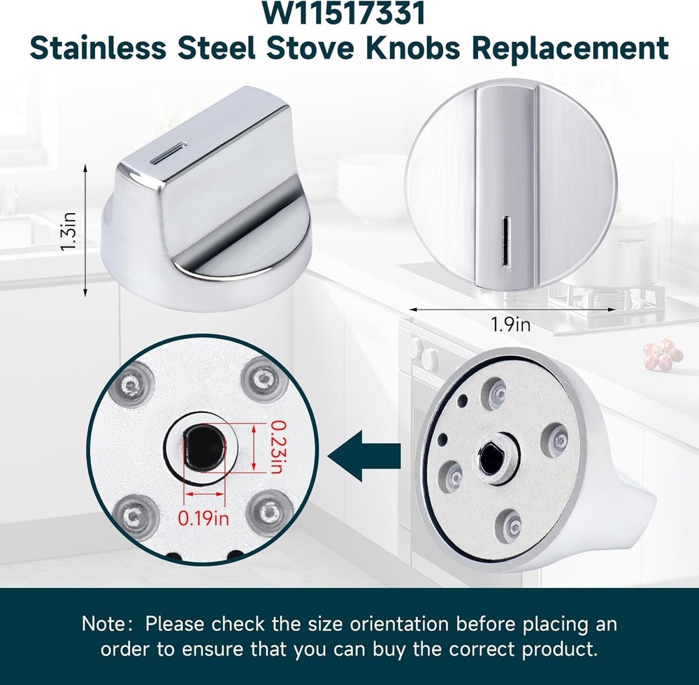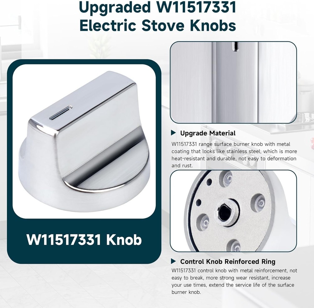 【W11517331 Perfect Compatibility】W11517331 stove knobs Compatible with whirlpool WEC310S0LS1, WEE515S0LZ1, WEC310S0LS2, WEE515S0LS1, WEC310S0LS3, WEE515S0LZ2, WEE515S0LS2, WEE515S0LV0, WEE515SALS0, WEE515SALS1, WEE515S0LS0, WEC310S0LS0, YWED745H0FE0, YWED74580FH0, YWHE975H0FS0 etc, If you are not sure if it is suitable for your machine, please contact us and I will solve it for you. 【W11517331 Replace part numbers】 W11517331 Electric Range Knobs Replace W10850027, W11117415, W11458840 knbs, AP7002931, PS16543518, EAP16543518, Please double check your machine model number before purchase to ensure compatibility. 【High quality material: W11517331 for whirlpool Electric Range Knobs back side is made of metal stainless steel, reinforcing the whole, not easy to deform,With a thick solid ring. More heat-resistant, abrasion-resistant, Long service life. Smooth surface, easy to wipe clean after oil, making daily maintenance and cleaning simple. 【Easy to install】Our W11517331 Knobs works perfectly with the machine. You can simply remove the old knobs and install the new knob without using any tools in just a few seconds. Can save you valuable time.