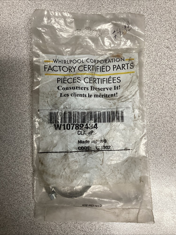The Whirlpool Hose Clamp, part number W10789434, is a specific replacement part designed for use in Whirlpool dishwashers. This hose clamp is essential for securing hoses in place to prevent leaks and ensure proper functioning of the dishwasher. It is compatible with the Whirlpool W10789434 model, providing a reliable solution for maintaining the efficiency of your appliance. Trusted for its quality and compatibility, this genuine Whirlpool part is a practical choice for ensuring the smooth operation of your dishwasher.