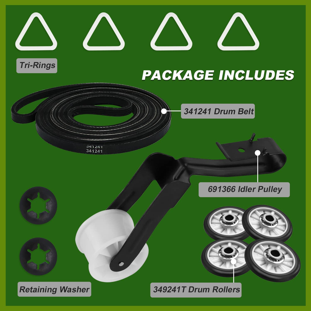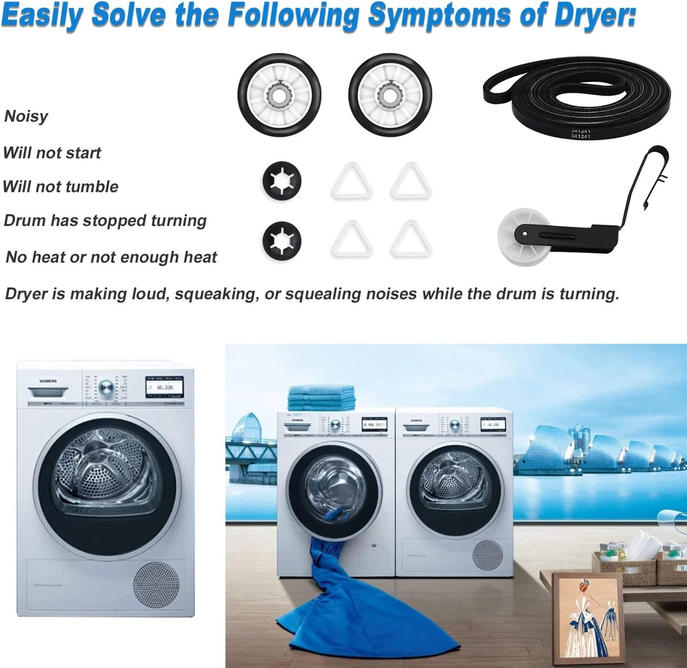 This dryer repair kit is a lifesaver! Easy to install with clear instructions, and it fixed my noisy, overheating dryer in no time. All the necessary parts were included, and the quality feels durable. Perfect for Whirlpool, Kenmore, Maytag, and Amana dryers—highly recommend for a quick, affordable fix!