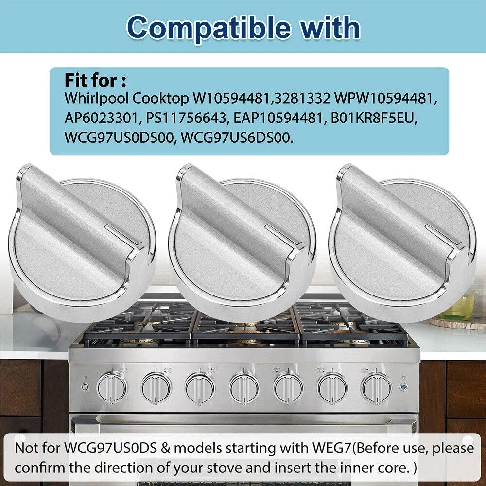 Model W10594481 Range Oven Cooktop Burner Knob W10594481 for Whirlpool WPW10594481 AP6023301 ( 5 Pcs ) Product Introduction Condition: 100% Brand New and never used Size: 1.9 inch/ 4.8 cm in diameter, 1.7 inch/ 4.3 in height Function: Burner Control/Cooktop/Stove/Oven Knobs Packa ge Includes: 5 x W10594481 Gas Range Stove Knobs FEATURES Replacements part num bers W10594481, AP6023301, PS11756643, EAP10594481, WCG97US0DS00, WCG97US6DS00, WPW10594481, AP6023301, W10594481, PS11756643, B01KR8F5EU, etc. (Notice--Not for WCG97US0DS, Not suitable for models starting with WEG7.) Fit in well to the stove, cook in com fort Great function, this range burner control knob replace your broken range knobs, save a lot of money from buying a new stov e. Upgraded & Heavy D uty Our W10594481 Whirlpool Gas Cooktop Knobs Made of high-quality stainless steel and reinforced with an aluminum ring for durability. The handle is made of matte material for easy manipulation and increased friction. Heat-resistant and tested to meet or exceed OEM specifications. Warm Note 1) After using the range, stove or cooktop every time, it is better to clean the front panel. Use wet cloth and mild soapy water or a 50/50 solution of vinegar and water. Rinse with clean water and dry with a soft cloth. 2) Don't use abrasive cleaners, strong liquid cleaners, plastic pads or oven cleaners on manifold panels. They will damage the surface of your range, stove or cooktop. Fits Models [Replaces No]: W10594481, WPW10594481, AP6023301, 3281332, W10698166, PS11756643, LW10594481, WPLW10594481, PD00034064, B081JSGJCD, B08R6327NH, WCG97US0DS00, WCG97US6DS00 [FITS Models ] : - W10594481 WPW10594481 stove konbs Compatible with whirlpool stove knobs WCG97US0DS00, - Compatible with Whirlpool cooktop knobs WCG97US6DS00 The W10594481 knob fit for some WCG97 series Gas Cooktop, But NOT fit models beginning with " WEG7" WHY OUR CUSTOMERS KEEP SHOPPING WITH US SECURE & HASSLE FREE SHOPPING All items are covered by manufacturer warranty. FAST SHIPPING Most orders ship within 1 business day! CUSTOMER SERVICE We are available 7 days a week. PAYMENT We accept Credit or debit card, Apple Pay, Google Pay, and PayPal. Payment should be completed within 2 (Two) days of auction closing. Or unpaid dispute will be filed for closing auction. Sales Tax of 9% will be applied for orders shipped within the state of California. We will leave a positive feedback immediately after payment is received. We appreciate a positive feedback as much as you do. If for some reason there is any issue with the purchase, please contact us prior to leaving feedback, and we will be glad to work with you to have it resolved. SHIPPING We will ship your item(s) within 1 working day. We send to USA , 3-7 working days. Import duties, taxes and charges are not included in the item price or shipping charges. we hope this can help you to avoid the Import duties or taxes, if you still need to pay for the Import duties or taxes; we are unable to take any responsibility for this. We do our best to offer you reliable, affordable shipping. But sometimes it is probably dependent on the express company. We only ship to the confirmed eBay address, so your delivery address must match your eBay address.