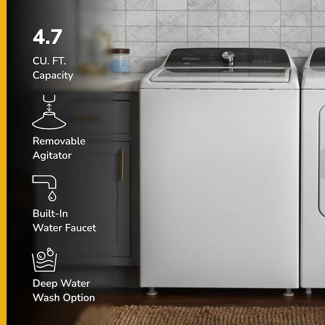 Twice the washer you have now. This top load flexible capacity 4.7-4.8 cu ft washer from Whirlpool has an innovative 2-in-1 removable agitator that allows you to customize any load of laundry and give bulky items more space. For normal and small loads, leave the agitator post in place. It works by moving clothes 360 degrees: up, down and side to side to help loosen stains. Remove the agitator for bigger loads like comforters, sheets, bedding, and towels and let the smooth impeller do the job. It works by driving items from the outer rim of the tub to the center, where the deepest cleaning happens. Industry-first removable 2-in-1 agitator allows you to customize your laundry loads Leave the agitator in place for most loads or remove it for big, bulky loads Flexible capacity: you can wash more than two baskets in a single load (7 lb baskets) Save a step by soaking and washing in one cycle with the pre-soak option Deep water wash gives you more water when you need it Pre-treat stains with the built-in faucet Slow-close glass lid lets you view your load while the washer’s in action Need a small load in a hurry? Quick wash cycle gets it done in 30 minutes flat (based on a 3-lb load) Two extra rinse options ensure detergent and messes are completely rinsed away Matching Electric Dryer is available (model WED5050LW $598.00)