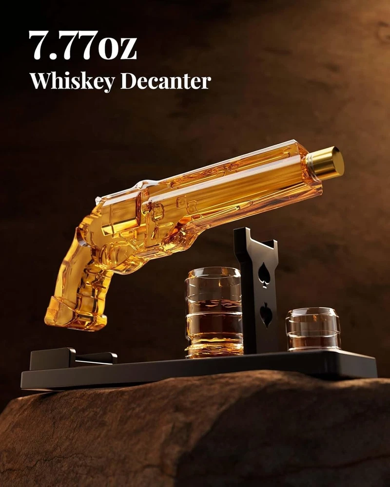 Whiskey Decanter Gift Set for Men - Unique Gun Design - Perfect for Any Occasion ‹ › ‹ › ‹ › ‹ › ‹ › ‹ › ‹ › ‹ › ‹ › ‹ › Whiskey Decanter Gift Set for Men Unique Gun Design - Perfect for Any Occasion Enhance The Flavor Crafted from lead-free glass, this exquisite whiskey decanter is designed to preserve and amplify the flavor of your favorite spirits, including whiskey, rum, bourbon, vodka, and tequila. Experience a smoother sipping journey that encapsulates quality and sophistication, making it an essential investment for every true whiskey aficionado. Extraordinary Gift Choice Searching for a gift that leaves a lasting impression? Look no further! This unique pistol-themed whiskey decanter set not only enhances the taste of spirits but also captivates with its standout design. Beautifully packaged in an elegant gift box, it’s the perfect present for a father, husband, brother, or even a respected boss, making every occasion special. Exquisite Design Featuring a striking gun-shaped decanter paired with a handcrafted wooden display stand, this set adds harmony and visual appeal to any shelf or bar. The intricately designed decanter becomes more than just a vessel; it's a statement piece, bringing a touch of elegance to your sipping rituals. Hand-Made Durable Glass Each liquor gun decanter is lovingly blown by skilled artisans, resulting in a stunning display of clarity and durability. With an emphasis on health, our 100% lead-free glass design ensures that your favorite spirits are safely stored and beautifully presented. Perfect Capacity This stylish revolver whiskey decanter gift set includes two 2oz (60ml) cylinder-shaped glasses and a striking decanter boasting a 7.77oz (230ml) capacity. Whether you're entertaining guests or indulging in a quiet moment, this set delivers unmatched style and functionality. The Classy Spirit Decanter for Every Whiskey Lover Embrace elegance and character with this charismatic whiskey decanter gift set, an ideal addition for connoisseurs and collectors alike. Elevate your drinking experience today. Shipping Free & Fast Shipping - We offer free shipping to most of the USA with a normal delivery time of 3-7 days. However, due to the current situation, additional delivery time (up to 3 weeks) may be required for some items. Alternative Carriers - We may use alternative carriers (e.g. USPS, FedEx, UPS, etc.) to ensure your package arrives safely and on time. Due to the use of multiple carriers, we are unable to provide a tracking number automatically. Handling Time - Orders are processed and shipped within 1-2 business days of receiving cleared payment. Shipping Restrictions - Shipping to Alaska, Hawaii, Puerto Rico, Guam, and other US territories may incur shipping charges or delivery restrictions. Please contact us before ordering, or your order can be refunded/cancelled. State Restrictions - There may be restrictions based on your state of purchase. For example, certain items may not be shipped to California due to state regulations. Contact for Tracking Updates - If you require tracking updates or have any concerns about the delivery of your order, please feel free to contact us, and we will be happy to assist you. Return 30-Day Hassle-Free Returns - We want you to be completely satisfied with your purchase. If you are not, you can return the item within 30 days of receiving it for a full refund or exchange. Easy Return Process - To start a return, simply contact us and we will provide you with a prepaid return shipping label and detailed instructions. Restocking Fee - There are no restocking fees for returns. However, the buyer is responsible for return shipping costs if the return is not due to a seller's error. Refund Processing Time - Refunds will be processed within 5 business days of receiving the returned item in its condition. Payment We accept all major credit cards, PayPal, and Apple Pay for your convenience. Your payment information is secure and encrypted to ensure a safe and seamless transaction. Please complete your payment within 3 days of purchase to avoid any delays in shipping. Feedback Your feedback is extremely important to us. We strive to provide the best products and customer service possible. If you are satisfied with your purchase, please take a moment to leave us a positive review. If you have any concerns or issues with your order, please contact us before leaving negative feedback. We are committed to resolving any problems and ensuring your satisfaction. Contact Us If you have any questions or concerns, please feel free to out to our customer support team. You can contact us through the eBay messaging system. We are available Monday to Friday, 9:00 am to 5:00 pm EST, and we will do our best to respond to your inquiry within 24 hours. Buy it now and enjoy a pleasant shopping experience! Unit Quantity: 1 Set Includes: Decanter,1 x 7.8oz whiskey decanter,1 x spade shaped wooden display stand,1 x exquisite gift box Material: Glass,Wood Features: With Lid/Stopper,Unique Birthday Gifts for Men Dad,Whiskey Decanter Set for Men,For Whiskey,For Liquor,For Tequila,For Bourbon,For Vodka Type: Decanter Set Color: Clear Number of Items in Set: 4 Capacity: 230 ml Style: Military Item Depth: 2.95 in Item Height: 5.51 Inches Item Weight: 1 lb Unit Type: lb