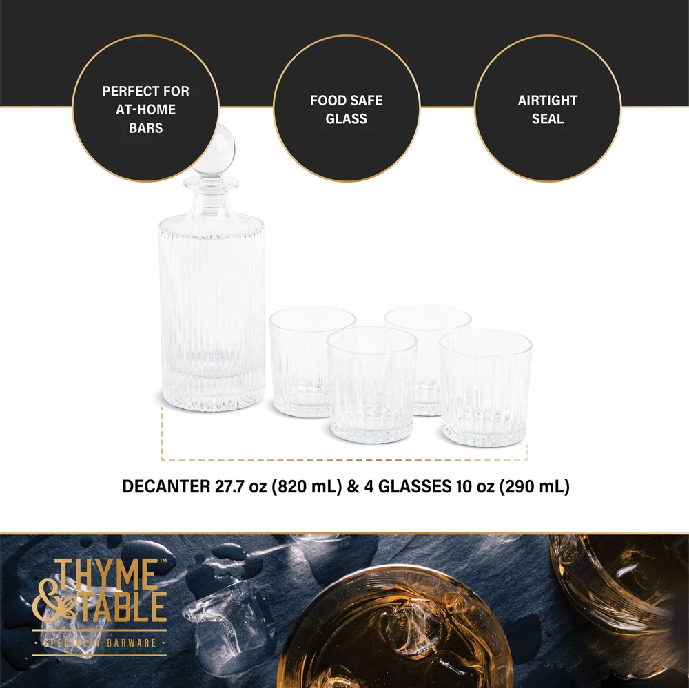 Thyme & Table Whiskey Decanter Set, 5-Piece is a part of Thyme & Table's Specialty Barware Collection. This whiskey decanter set is ideal for the at-home bar enthusiast. The decanter has an airtight seal to preserve freshness. The decanter capacity is 27 ounces and the whiskey glasses hold 10 ounces. The set includes one decanter and four whiskey glasses. For care and use, please hand wash in warm water with light dish soap and a soft sponge. Avoid abrasive cleaners. Towel dry. Do not use in a dishwasher 5-Piece set, includes decanter and 4 whiskey glasses Perfect for home bars Hand wash recommended Decanter holds 27 ounces Glasses hold 10 ounces