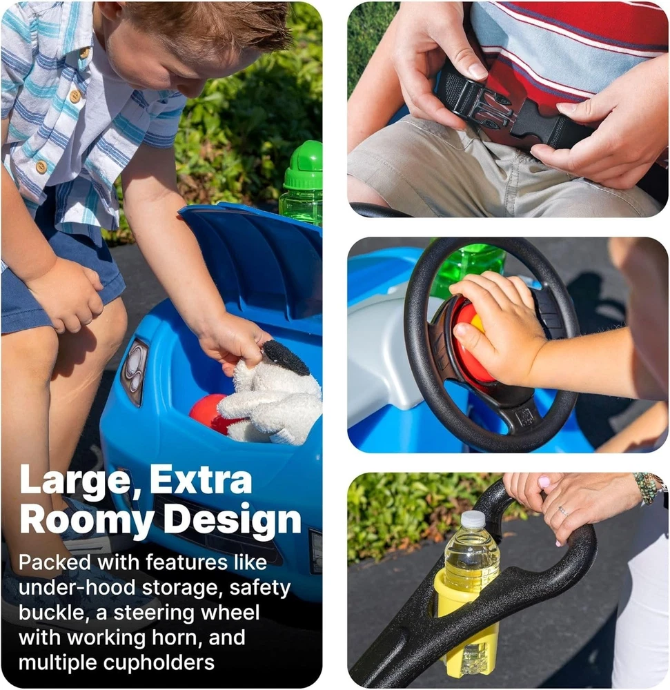 Whisper Ride II Buggy Kids Push Car, Ride On Toy, Stroller Substitute, Includes Seat Belt & Horn, Made of Durable Plastic, Max Weight 50 lbs., For Toddlers s Old, Blue RIDE IN STYLE: Treat your toddler to a smooth and quiet "whisper ride" with our push toy car, enjoy added comfort with the extra-wide rear parent grip handle. SAFE & FUN: Easy-latch adjustable seat belt for safety, real car horn and steering wheel, convenient cup holders, under-hood storage for snacks and toys. COMPACT: Toy car with an easy-to-fold handle for quick transportation and storage; max weight 50 lbs.; assembled dimensions 34" H x 19" W x " D. EASY TO CLEAN & ASSEMBLE: Use disinfectant wipes or household cleaners to clean for a sanitary play environment; adult assembly required; includes assembly hardware. DURABLE: Built to last, double-walled plastic construction; s of use with colors that won't chip, fade, crack, or peel. Features "whisper ride" wheels for smooth, quiet ride and easy-pull handle design Our amazing Ride-On Car is the ideal push toy for toddlers aged 2-4 s old! This versatile car can support a maximum weight of 50 pounds. It has an extra-wide rear parent grasp handle for added comfort when guiding their children. This car's "whisper ride" wheels provide a smooth and quiet ride, allowing your child to easily cruise around the neighborhood. Because safety is our main priority, our Ride-On Car has an easy-latch adjustable seat belt. It has a genuine car horn and steering wheel, which adds to the immersive play experience. The car also has two cup holders, which are useful for both the rider and the parents. The under-hood storage box is ideal for storing snacks and toys, making this car more engaging than a standard toddler wagon or stroller. It's never been easier to clean up after playtime. Simply wipe away messes with a disinfectant wipe or home cleanser. The Ride-On Car, like all our items, is built to last, with a sturdy double-walled plastic design that ensures s of use. The brilliant colors are resistant to chipping, fading, cracking, and peeling, SATISFACTION GUARANTEEing that the automobile looks good even after a lot of play. From the Manufacturer The Whisper Ride II Buggy – Blue is an updated, roomier version of one of 's best sellers. This cute little machine features a sleek automotive design with soft poly wheels to help provide a smooth, quiet ride. It also features storage under the hood, as well as a handle that can be folded underneath the body to help simplify transport and storage.