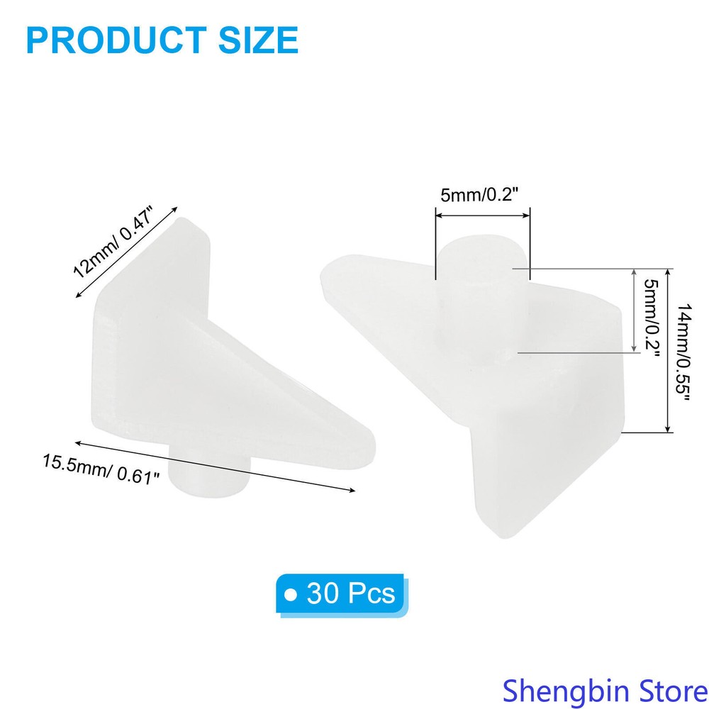 Shelf Support Pegs 0.2", 30pcs Plastic Shelf Pins for Shelves for Cabinet,White Shelf bracket pegs are essential hardware used to hold and stabilize shelves in place. These small pegs are designed to fit into pre-drilled holes on the sides of cabinets, bookcases, cupboard, closet and other furniture display units, providing a secure platform for shelves. Specification Material: Polypropylene Color: White Rod Diameter: 5mm/0.2 inches Rod Length: 5mm/0.2inches Package List: 30 x Shelf Support Pins Advantage Our shelf pegs for shelves are thickened design, strong and durable, rust-resistant and corrosion-resistant, even in a humid environment. Provide strong support for cabinet shelves, ensuring they can hold the weight of items without sagging. Instruction Shelf support pegs are easy to install by simply inserting them into pre-drilled holes on the sides of the shelving unit. The adjustable nature of these pegs allows for flexible positioning and easy customization of shelf heights according to individual needs and preferences. NOTE: Please confirm the size you choose before purchasing.