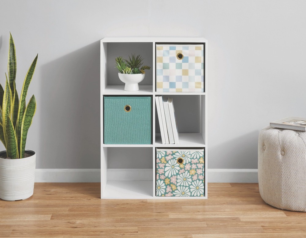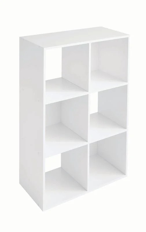 Product details The 6-Cube Storage Organizer features six compartments perfectly sized for storing and displaying office supplies, books, clothes, craft supplies, photos, collectibles and so much more! This sturdy bookcase can stand vertically or horizontally to best suit your needs and space. They are compatible with 10.5" x 10.5" collapsible storage bins (sold separately) and available in multiple finishes. Three open-back cube shelves make managing cords and cables easy, while three closed-back shelves help keep items securely housed. Add an accent piece that is both functional and stylish to your living room, family room, home office, playroom, closet and more, with the 6-Cube Storage Organizer. Stylish 6-cube organizer bookcase Features six 11" x 11" x 11" open storage compartments Can be used vertically or horizontally to fit your space and needs Designed with 3 open-back shelves and 3 closed-back cube shelves Top panel and 2 middle shelves support up to 22 lbs each; bottom panel supports up to 33 lbs Compatible with 10.5" x 10.5" collapsible storage bins (sold separately) Perfect for use in dens, living rooms, family rooms, playrooms, home offices and more Materials: particle board, paperboard Finishes available: White (MS5336278612010), Black (MS5336278612009), Canyon Walnut (MS18-D1-1009-49) and Rustic Brown (MS18-D1-1009-48) Attaches to the wall with included hardware for safety Easy to assemble with included instructions and assembly video guide (hammer & Phillips head screwdriver required) Package size: 39.53" x 4.17" x 15.28" (32.81 lbs) Assembled weight: 32.5 lbs Assembled dimensions: 23.7" W x 11.73" D x 35.39" H