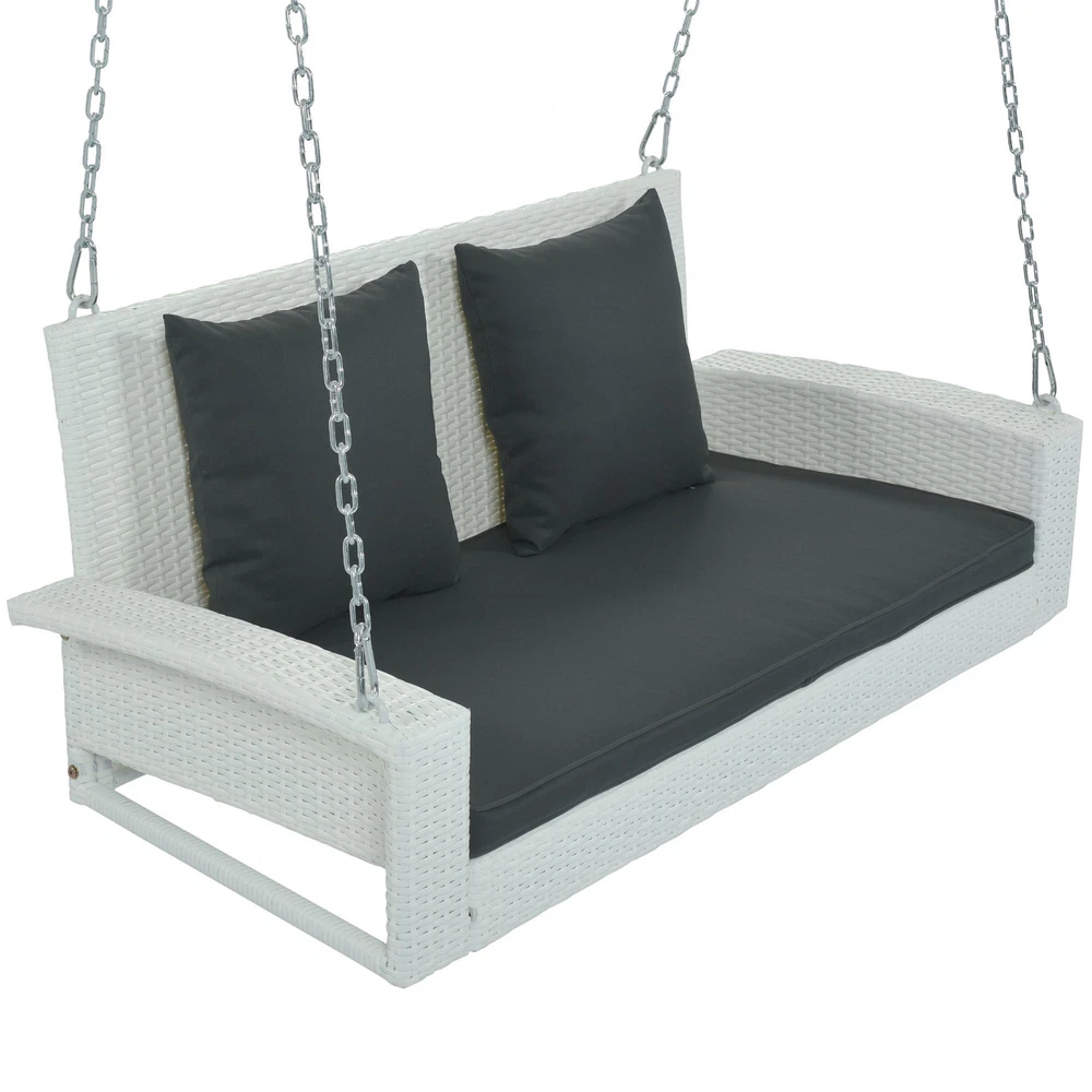 Notice: The suspension distance to avoid the uncomfortable seating experience due to inappropriate hanging position. Please note the suspension distance to avoid the uncomfortable using experience due to inappropriate hanging position. [Seats up to 2 Persons] Our wicker porch swing has a wide seat with a cushion and 2 back pillows, and 500 lbs weight capacity is safe enough. Thus, two people can easily sit together and enjoy your best outdoor with this fantastic swing. This makes it an excellent addition to your porch, backyard, patio, garden, or Deck. [High-Quality Wicker] The Wgite PE wicker is totally hand-made and can resist bad weather no matter rain or snow. Moreover, this wicker is durable and sturdy enough to keep. [Removable Cushion] Our wicker swing has one cushion and two pillows, is very comfortable for person to sit or lie down. And the seat cushion is zippered designed so the cover is easy to remove and wash. [Stable and safe] Our wicker porch swing ensures you a safer seating experience with thicker reinforced galvanized steel chains which is strong, rust-resistant and weatherproof. [Easy To Assemble] 50"L x 22.4"W x 20.5"H, comes with assembly instructions, our 2-person patio swing is super easy to put it together, a nice outdoor piece of furniture for the front porch or patio.Enjoy Your Leisure! Features : Product Type :Wicker Porch Swing Design :Modern Material :PE Wicker Steel frame Polyester Foam Color :White wicker Gray cushion Removable Cushions :Yes Pillows Included :Yes Weight Capacity :500 lbs Assembly : Adult Assembly Required :Yes Additional Tools Required :All Tools Included Product Dimensions : Swing :50"L x 22.4"W x 20.5"H Cushion thickness :2" Overall Product Weight :28.89 lbs Package Weight :35.56 lbs Products included: 1 x Wicker Swing 2 x Pillow 1 x Cushion