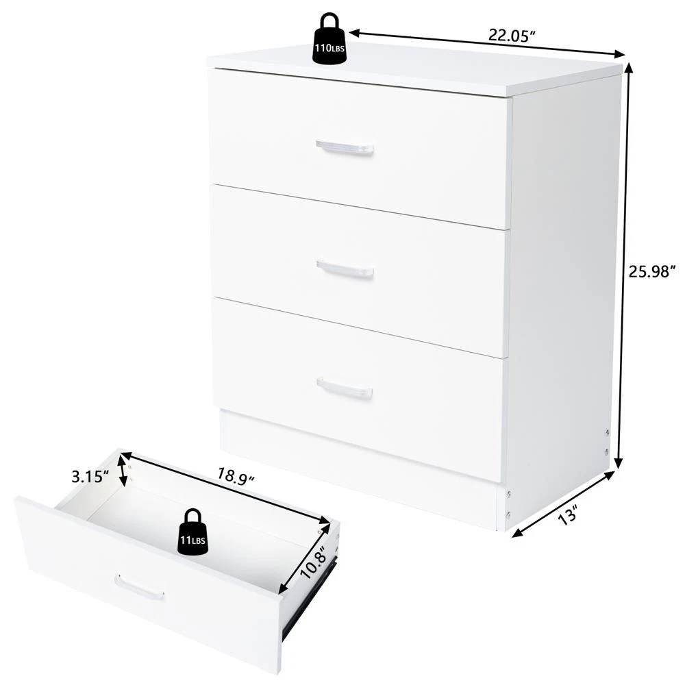 Dimensions: (25.98 x 13 x 22.05)"(L x W x H) Room: Bedroom, Living Room Handle Type: Level Handle gtin13: Does not apply Drawer Weight Capacity: 11LBS Material: MDF Wood Recommended Room: Living room;Bedroom;Kid's Room;Office Type: Chest of Drawers Handle Finish: Stainless Steel Weight Capacity: 110LBS Recommended Location: Indoor Color: White MPN: Does Not Apply Assembly Required: Yes Mounting: Free Standing Additional Parts Required: No UPC: Does not apply Style: Contemporary Drawer inner size: 18.9 x 10.8 x 3.15 in Brand: FCH Item Height: 25.98 in Item Width: 13 in Number of Drawers: 3 Pcs Department: Adults Item Length: 22 in