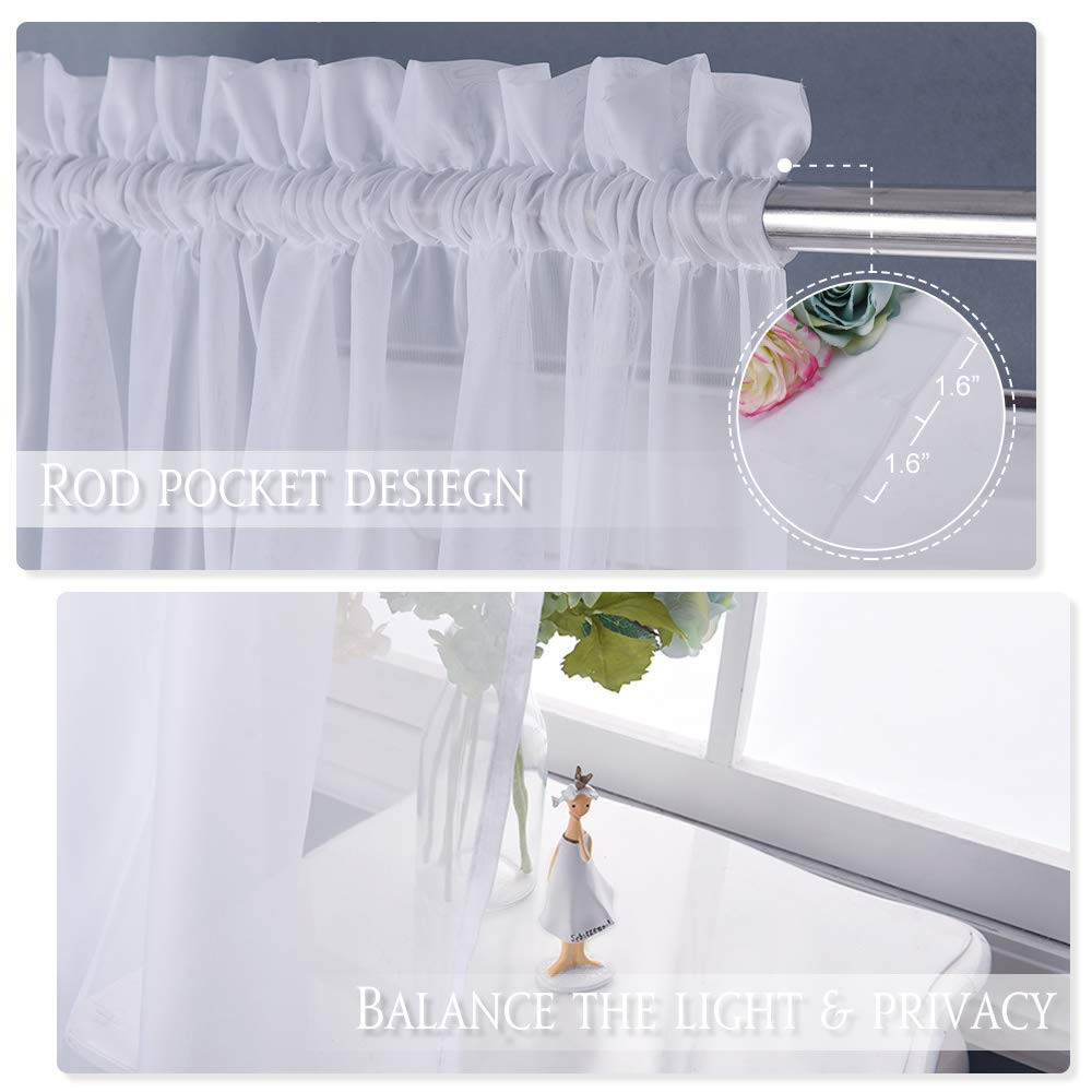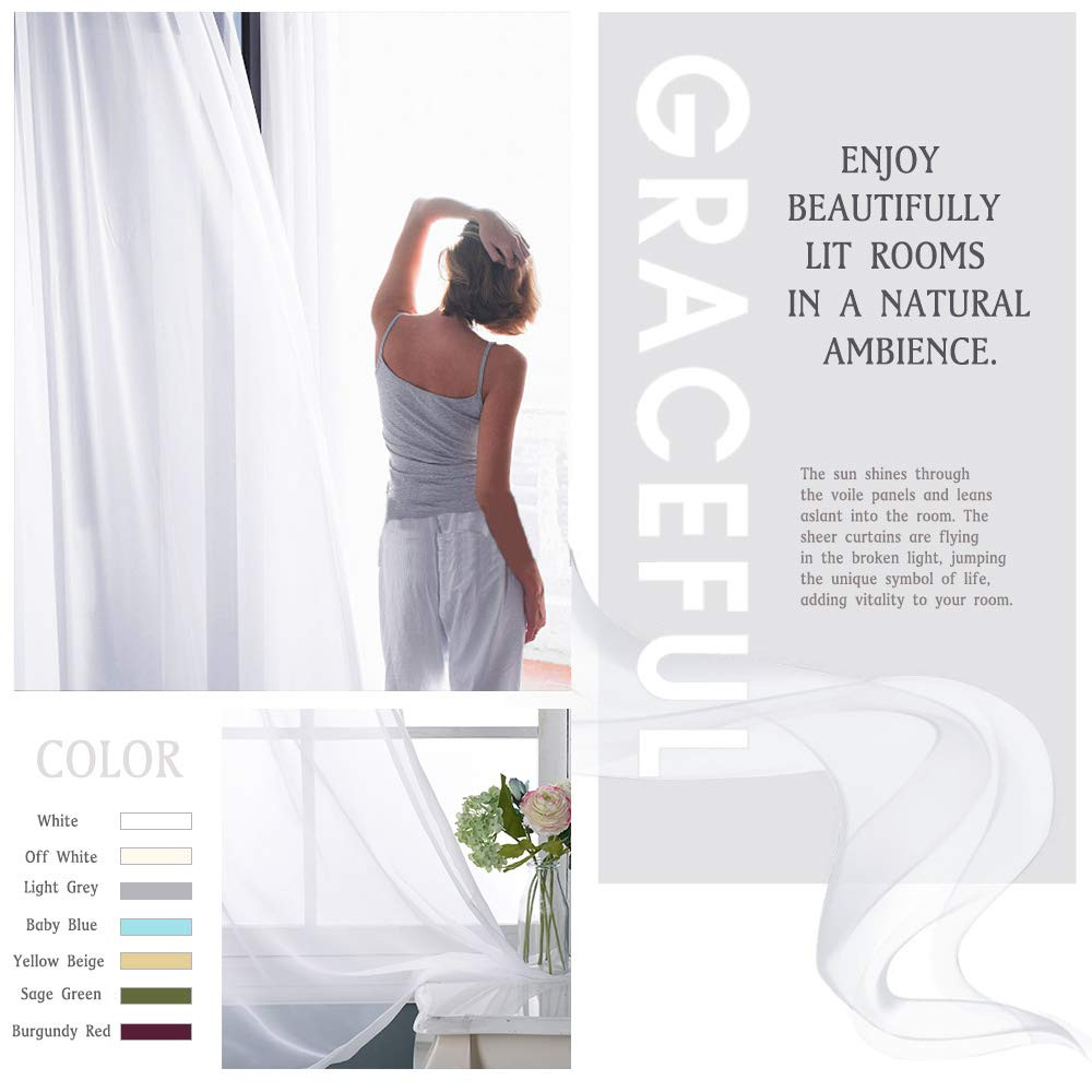 READY MADE: 1 panel per package. Each panel measures 100" wide, 84" long (from top edge of installed rod to bottom sheer). 2" Diam rod pocket opening to suit most curtain rods. ELEGANT DESIGN: With top dual rod pockets design, the curtain appears more lovely and vivid. Besides, 3" sewn rod pocket in the bottom add more vertical sense to the light sheers. NICE SHEER: The window curtain is soft and not lined. Quality touching voile sheer will provide you with a sense of beathable and lightness, making your time more refresh and relax. WIDE COMPATIBLITY: Extra wide Voile sheer valance is perfect for living room, bedroom, hall, villa and patio door decor. The panels also suitable for casual, modern luxury and country style. EASY CARE: Machine washable in cold water (make sure the water temperature is lower than 86℉ ), tumble dry, quick iron or steam clean when it is necessary. Easy use easy care.