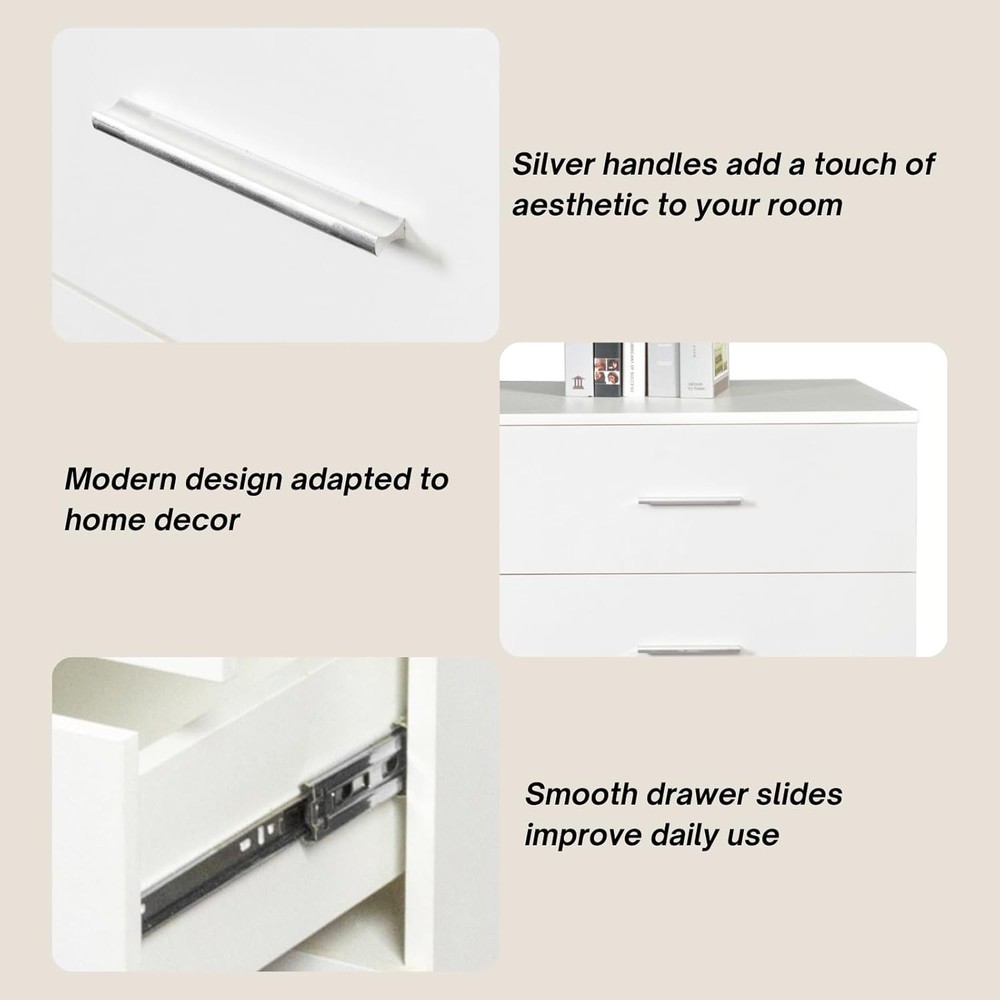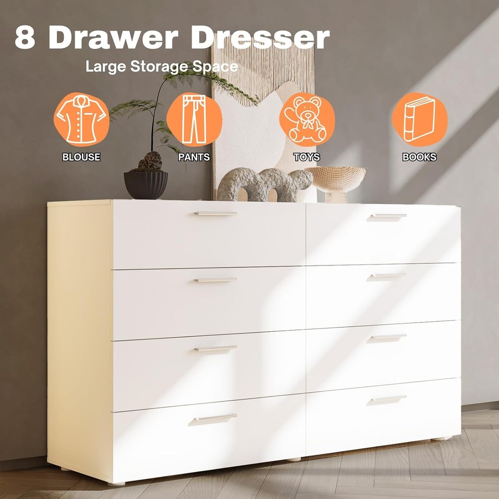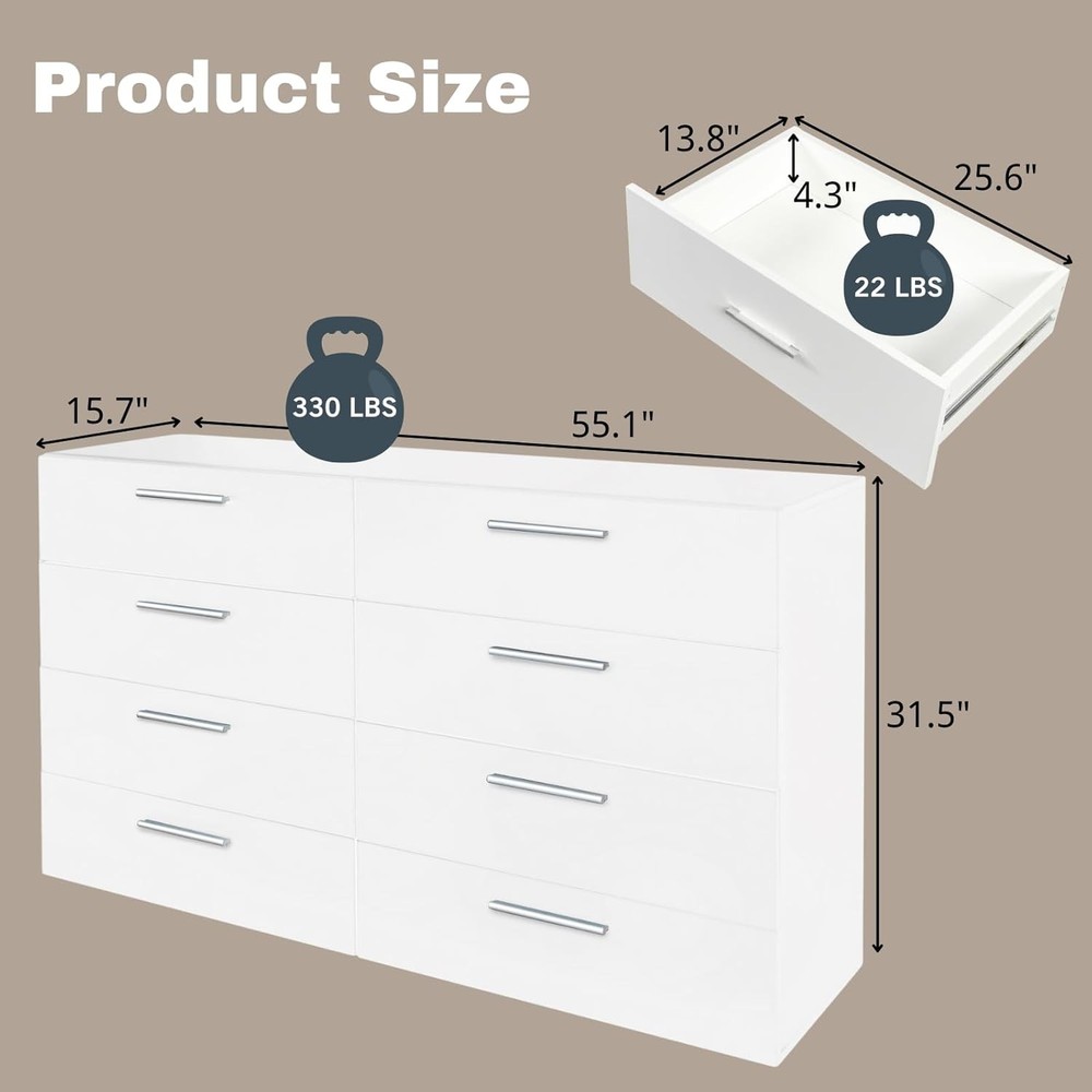 Product Description: 8 Drawer Double Dresser, a compelling blend of modern design and stellar functionality. Crafted from robust P2 class particle board, this dresser offers durability and strength for everyday use. Flaunting a chic white finish, it is an exquisite addition to your bedroom, living room, or entryway. Its wide drawers provide ample storage space for your belongings, ensuring your home stays clutter-free. Organize in style with this versatile piece that marries aesthetic appeal with practical utility. Features: Stable Construction: Manufactured from high-quality P2 class 15MM particle board, ensuring long-lasting durability and robustness. Elegant Black Finish: The sleek white finish adds a touch of sophistication and seamlessly blends with any home decor. Spacious Storage: Eight wide and deep drawers, each capable of holding up to 22 lbs, allowing you to store items of various sizes. Versatile Use: Ideal for the bedroom, living room, or entryway, offering a stylish solution for keeping your space tidy. Easy Assembly: comes with installation hardware and manual, anti-toppling accessories are also included Specifications: 1. Material: P2 Class 15MM Particle Board 2. Color: White 3. Dimensions: (55.1 x 15.7 x 31.5)in (W x D x H) 4. Drawer Size: (25.6 x 13.8 x 4.3)in (W x D x H) 5. Single Drawer Weight Capacity: 22 LBS 6. Product Weight Capacity: 331 LBS Package Includes: 1 x 8 Drawer Double Dresser On Aug 6, 2025 at 22:51:18 PDT, seller added the following information:
