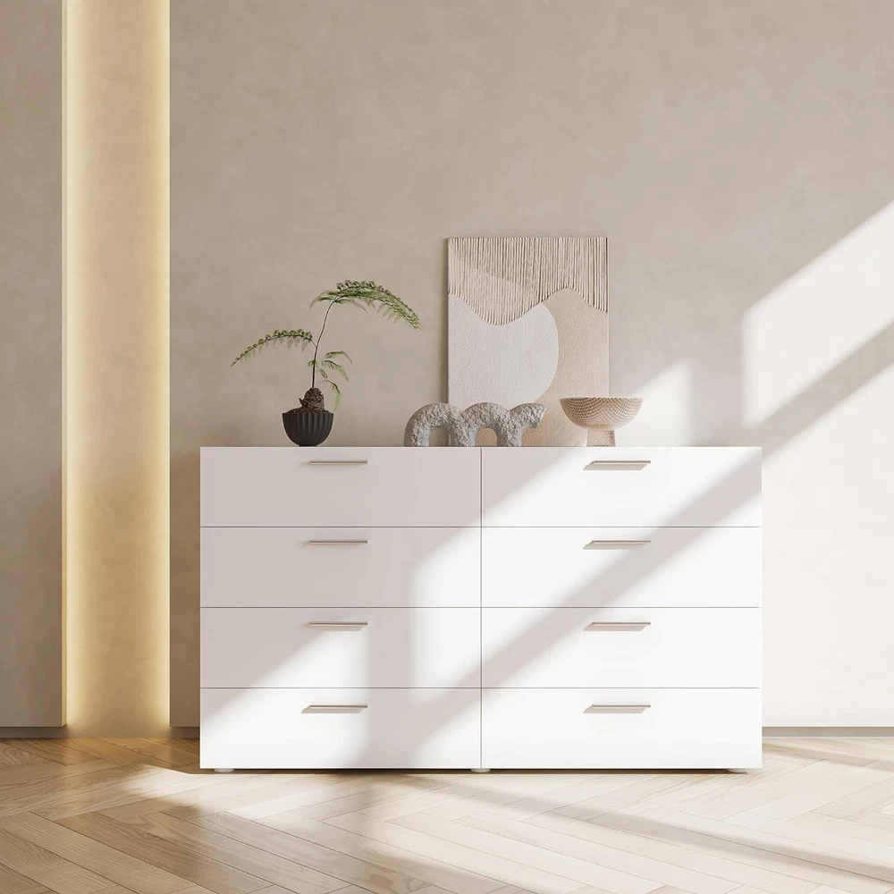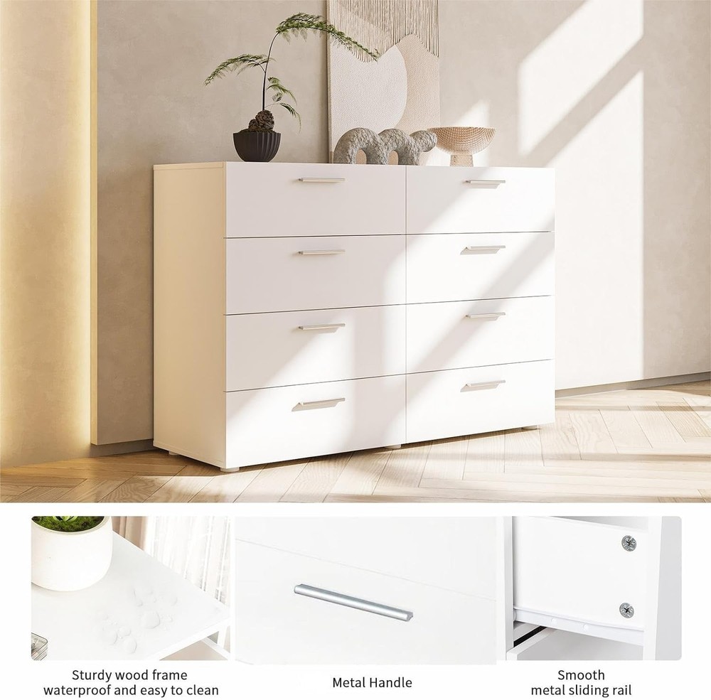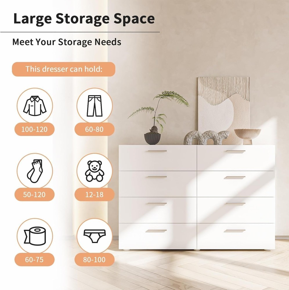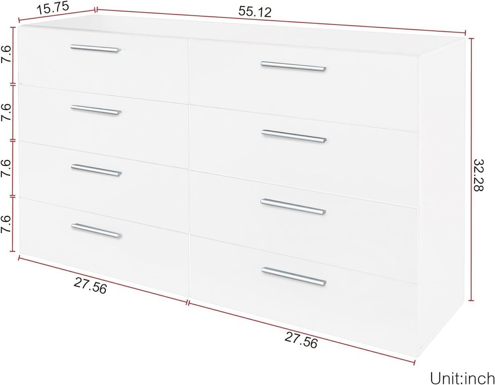 Product Description White Dresser for Bedroom, 8 Drawer Dresser,Chest of Drawers & Dresser,Dresser Bedroom Funiture,Modern Wood Dresser About this item 【White Dresser for Bedroom】 Modern white dresser has 8 spacious storage drawers, which can store your clothes, toys, books, or any other personal items, making it easier for you to sort and store clutter! spacious tabletop is perfect to place frequently used items, keeping them in your reach. Overall dimensions : 55.1" (W) x 15.7" (D) x 28" (H). 【Perfect Combination of TV Stand and Dresser】This chest of drawers can be combined with your wall-mounted TV as an entertainment center. The 8 large drawers are great to display CDs, DVDs, game controllers, etc. Get this dresser home to store items, hold your entertainment center keep clean and tidy! 【High Quality 8 Drawer Dresser】Crafted with 15mm E1 grade particleboard ,the sturdy wood frame offers stable support for all drawers.The finish is glossy and looks attractive ,the waterproof surface is convenient for cleaning and maintenance. 【Large Storage Space】The chest of drawers for bedroom completes with 8big drawers,large top surface for additional storage, so lingerie, blankets, as well as clothes of your family members can be stored well. The wood table top is designed for simple storage, placing glasses, alarm clocks, table lamps, magazines, books, and even skin care products. 【Perfect For Your Home Decor】Simple and practical style,this large dresser is suitable for bedroom, living room, guest room, closet, hallway, entryway, small apartment, and so on. This chest of drawers can be used as dressers for bedroom and also be used as a TV stand for living room. More use scenarios waiting for you to explore. 【Easy to Assemble, Clear Instruction】All parts and accessories are numbered, and each step of the installation has instructions, easy to understand and to assemble. In addition, if you have any product problems, please contact us in time, all problems will be solved within 24 hours. On Aug 6, 2025 at 23:07:35 PDT, seller added the following information:
