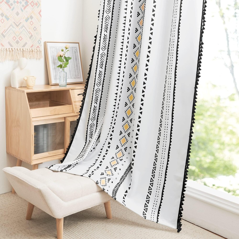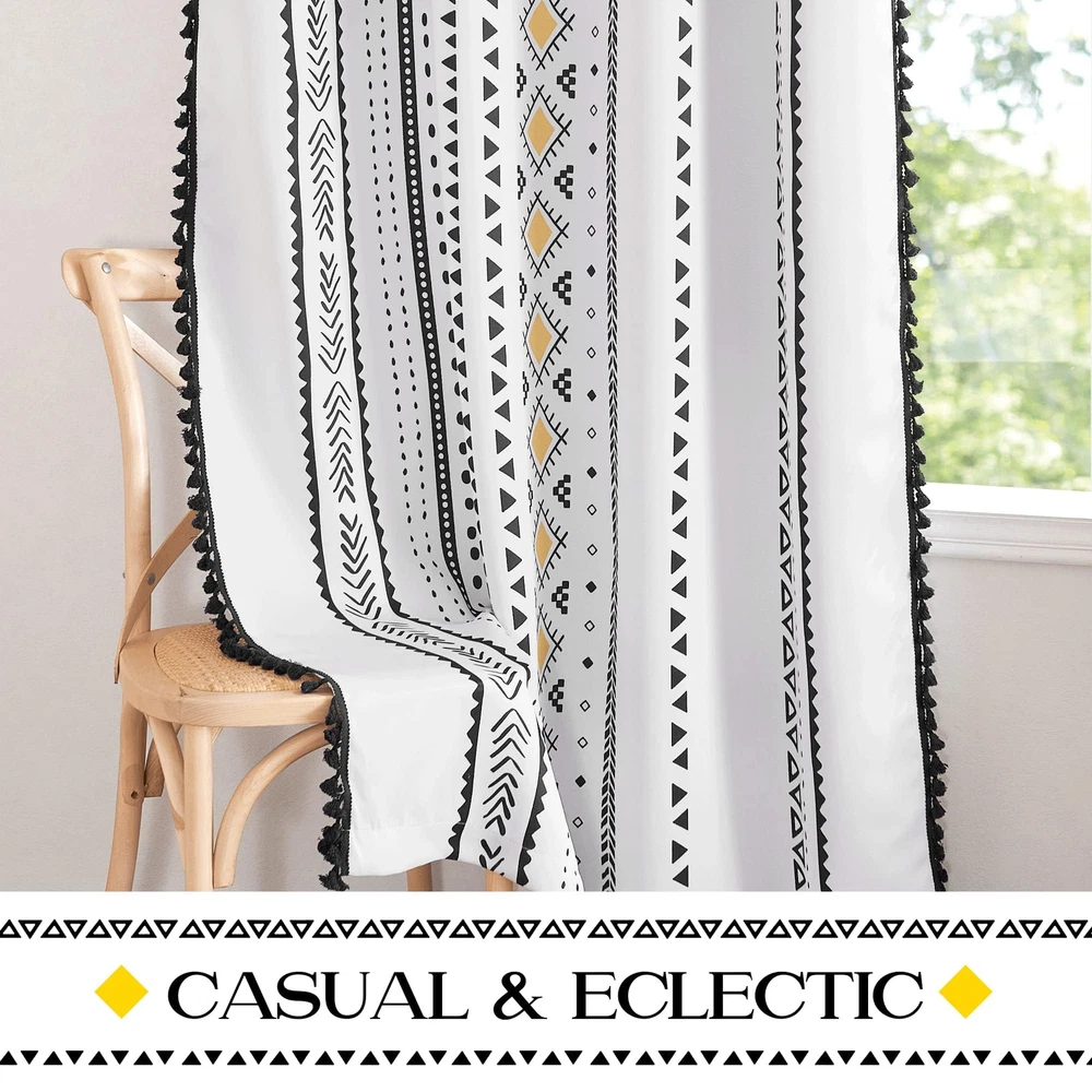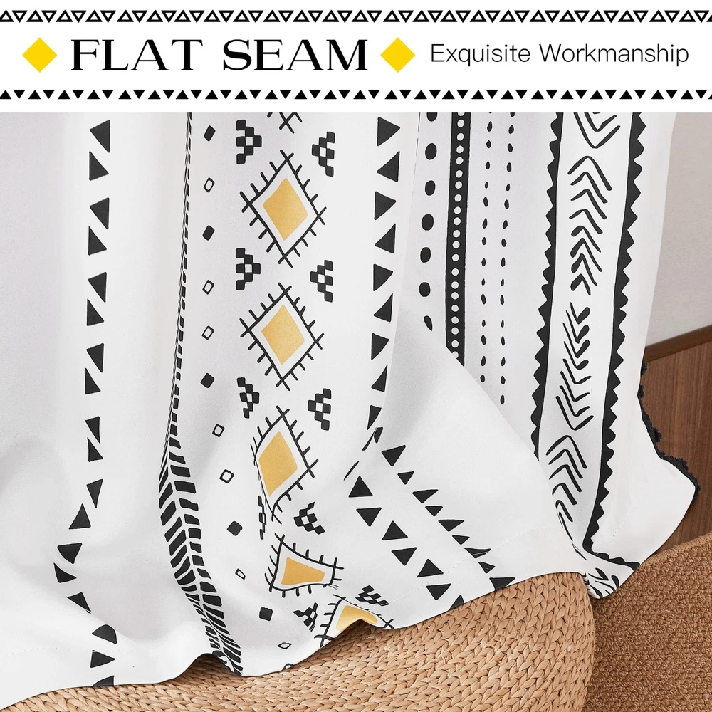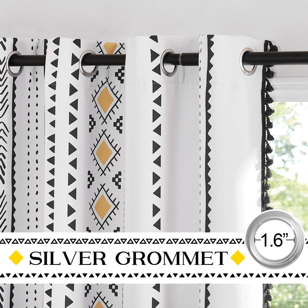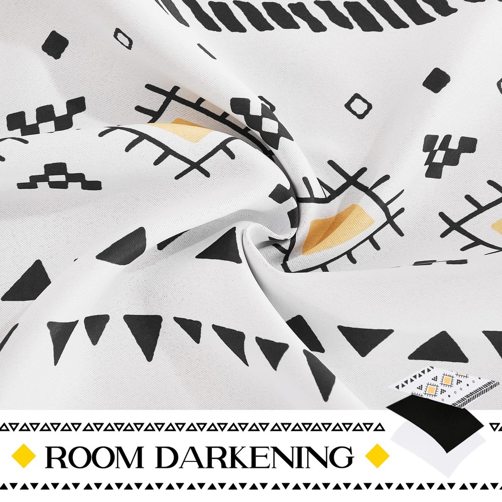 Blackout Curtains Ready-Made: The package includes 2 panels of room darkening boho-chic curtains, each measures 52"W (104"W for pair), with 8 (1.6" inner diameter) silver grommets to suit with standard or decorative curtain rod. Bohemian Pattern: The curtains adopt varieties of geometric patterns to print on the white background texture makes the curtains more vivid but still easy-matching with both modern and style home decors. Sunlight Blocking: We select elaborately triple weave fabric to feature the boho curtains 50-70% thermal insulated, room darkening, and energy-efficient. Pls note that the color of the reverse side is white. Wisdom in Essence: professional designers especially adopt black and yellow for a color block, and the yellow rhombus on the middle of the eclectic curtain provides you with an artistic and alive sense. Easy Care: room darkening curtains are made to last. Machine washable in cold water, tumble dry. Quick ironing or steam clean when needed. Visiting the , find out your favorite curtains.