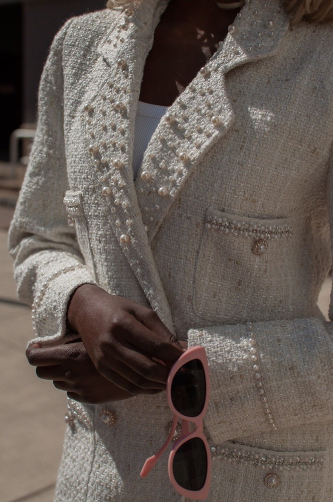 White Bouclé Double-Breasted Suit Jacket with Pearl Details, Women's Long Sleeve