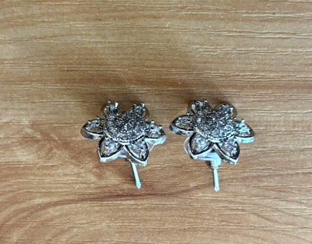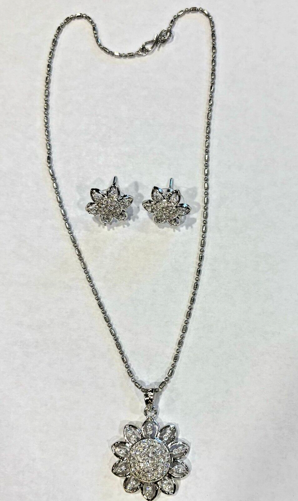 Enhance your jewelry collection with this stunning flower-themed jewelry set. This set includes: - *1 Pendant Necklace* with a dazzling floral design, featuring sparkling cubic zirconia (CZ) stones. - *2 Matching Stud Earrings* in a delicate floral shape, encrusted with shimmering stones. - *1 Stylish Chain* with a sleek, beaded design to complement the pendant perfectly. Crafted with high-quality silver-tone metal and adorned with brilliant CZ stones, this set is ideal for formal events, weddings, or everyday elegance. A perfect gift for someone special! *Condition:* - *New without tags* – never worn, in excellent condition. - No visible scratches or defects. - Comes as shown in the images.