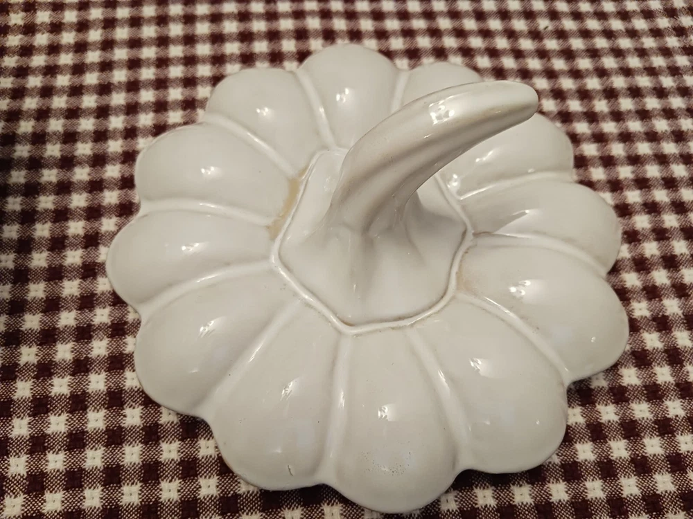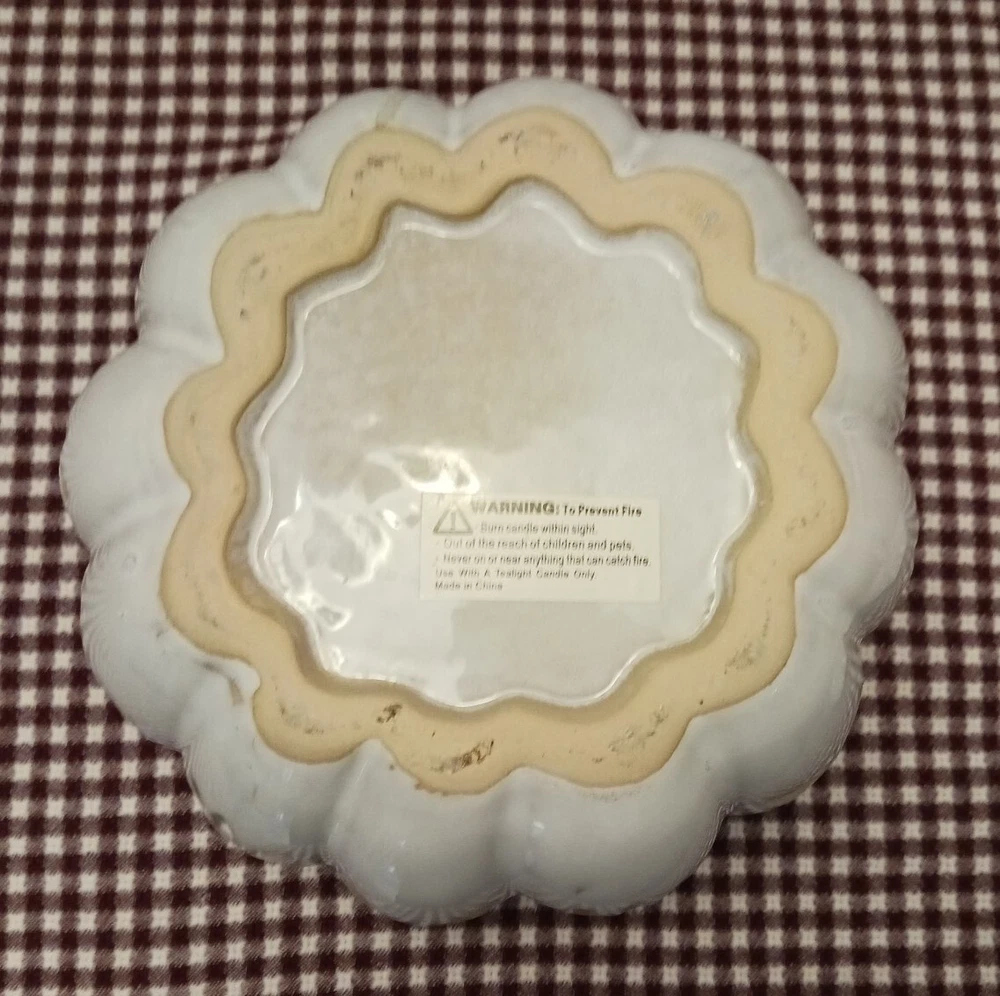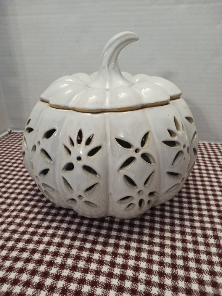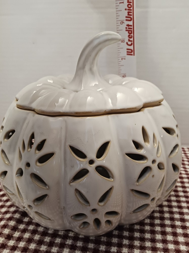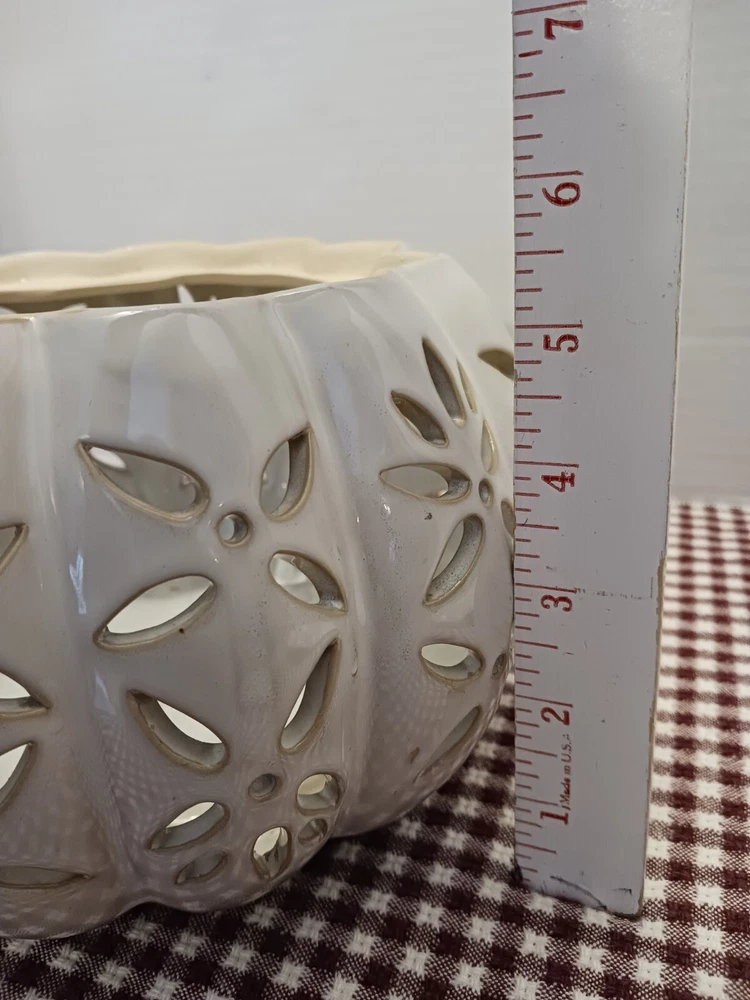 Ceramic White Pumpkin Luminary Candle Holder Smoke free, pet free home Approximately 9 inches wide and 8 inches tall Candle not included Unglazed underside of lid and unglazed bottom of pumpkin show some discoloration scratches from use No chips or cracks